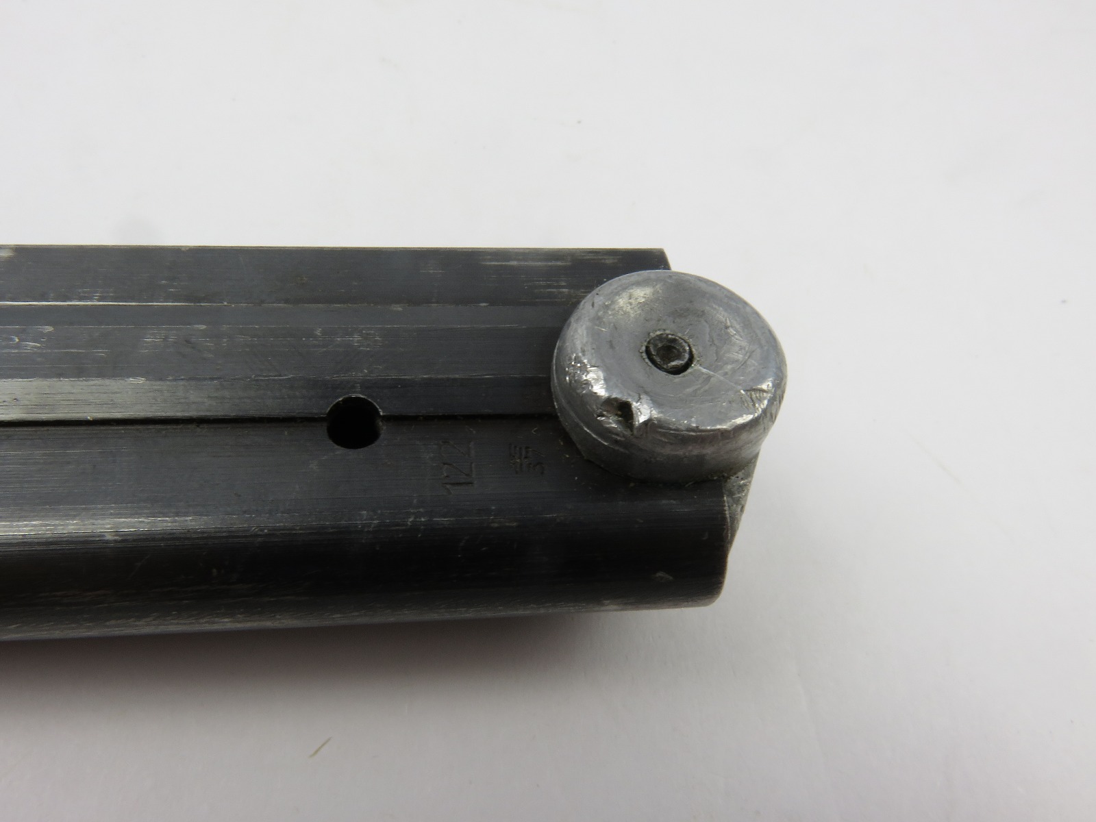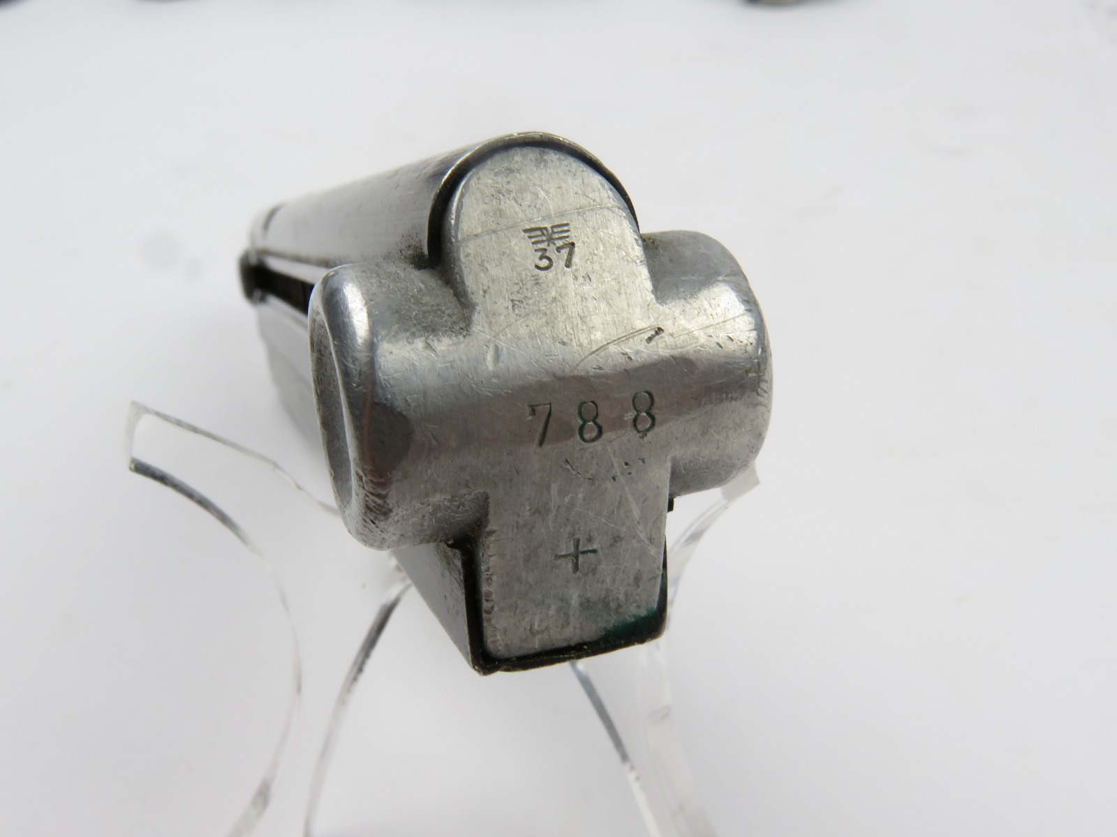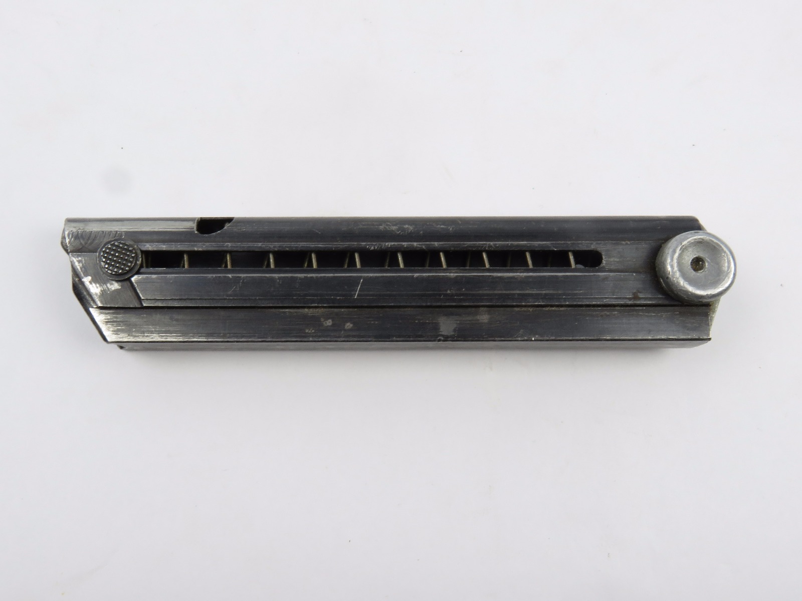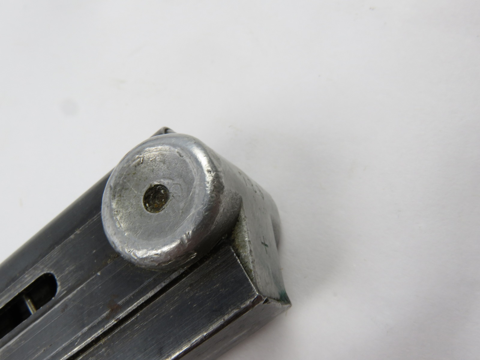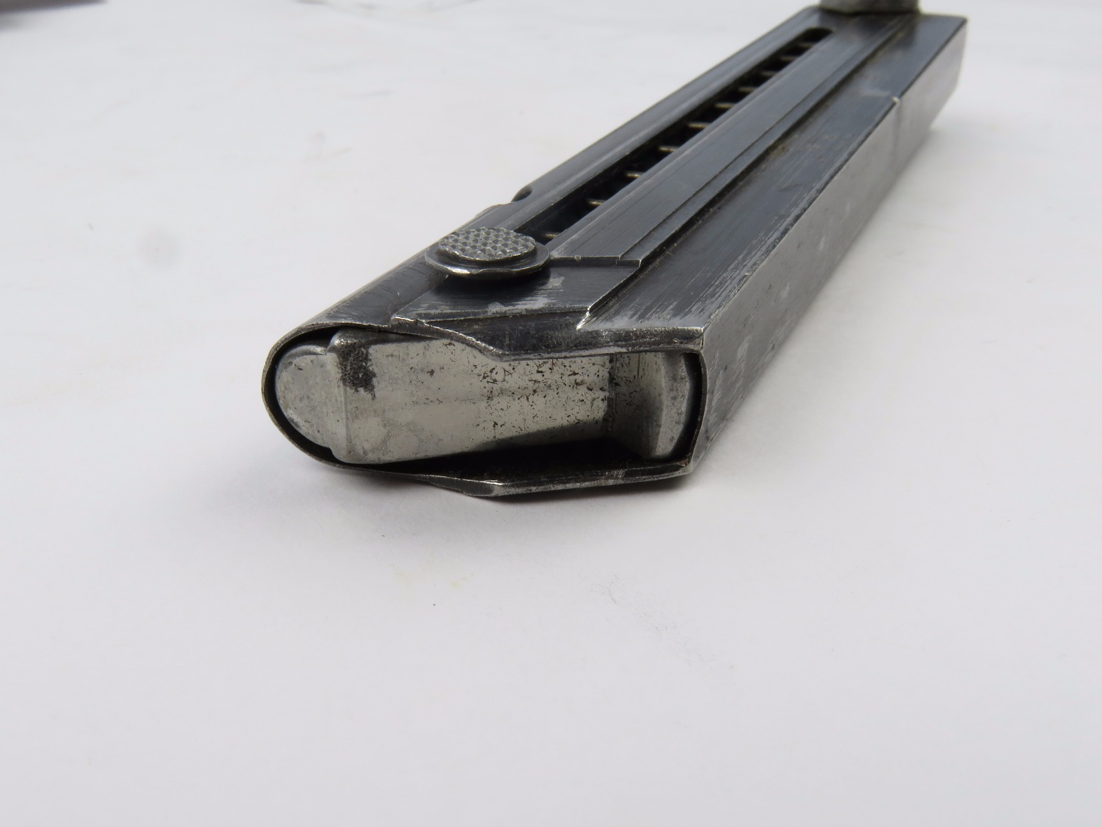 7/26/17 – This is an original WW2 era production Mauser Luger magazine. This magazine is an unusual variation, with eagle/37 military proof stamps on both the frame and base of the magazine. There are two eagl/37 proofs, along with a “122” code on the left side of the frame. The base is stamped with one eagle/37 proof and a serial number. The base and serial number look like they were ground down slightly or someone might have tried to alter the base, but then gave up. This is because the numbering looks all original and authentic, but there is some uneveness to the base. The three digit serial is correct for this variation, along with the plus sign. The magazine frame has minimal wear, with no rust or pitting and the spring is fully functional. Guaranteed original.