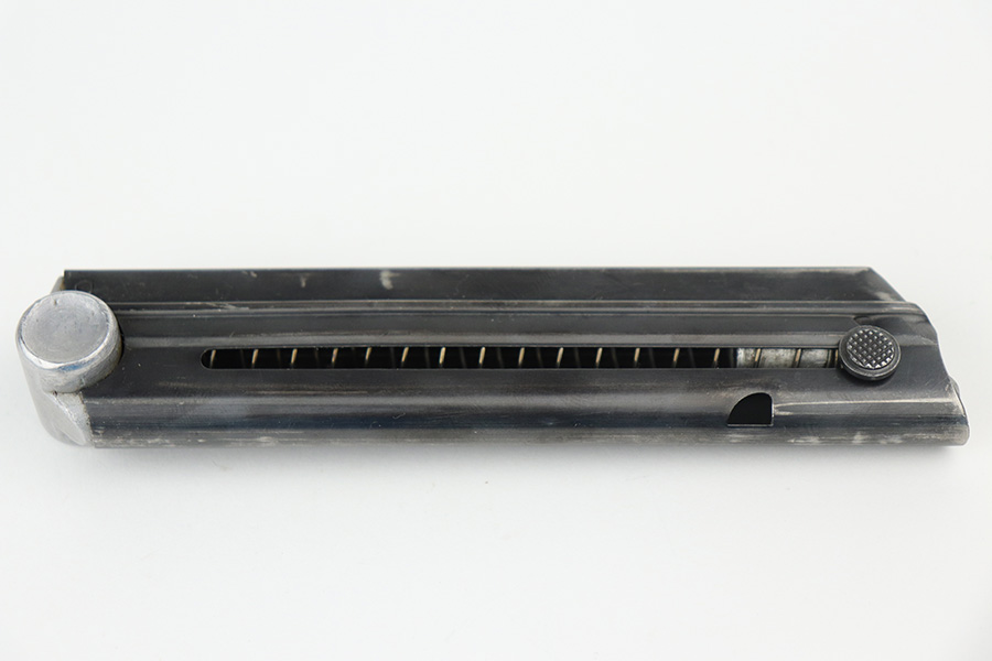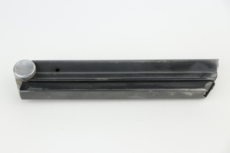 10/4/21 – This magazine is for a P.08 luger manufactured during the WW2 era. The blued tube retains a majority of its finish. The aluminum bottom features serial number “5918l”, and an “eagle 63”. The spring and follower are strong and functional.