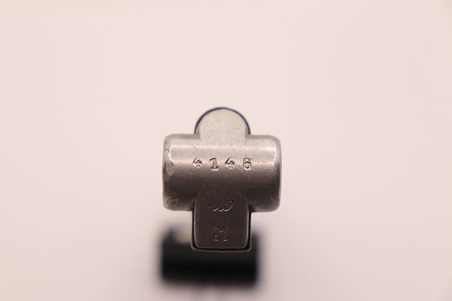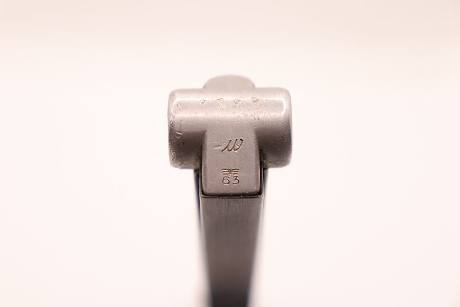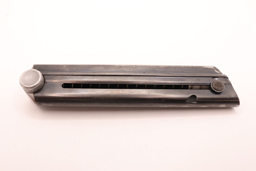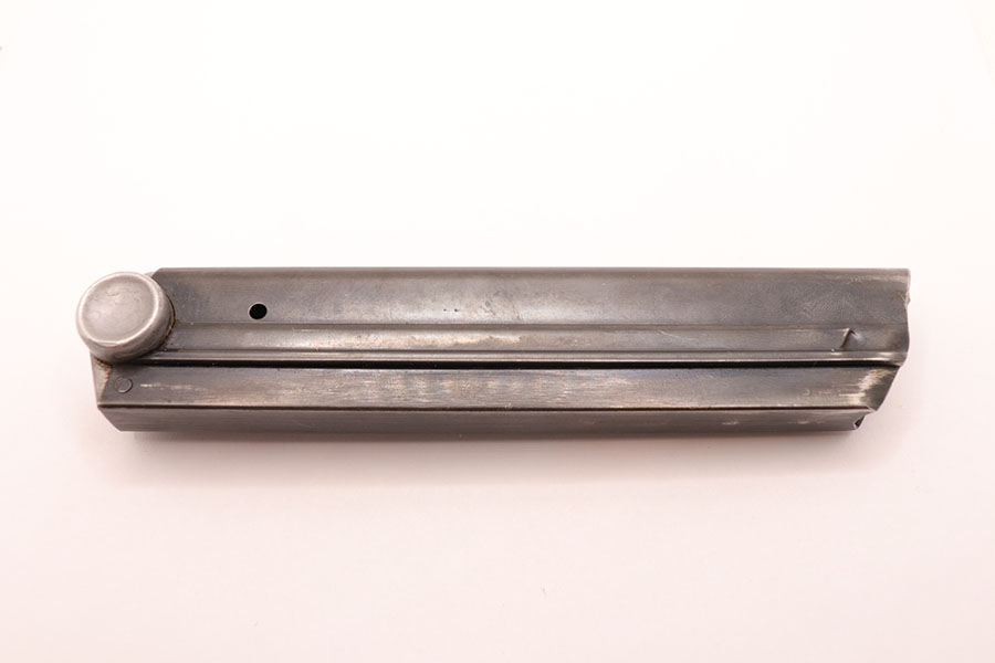 10/28/20 – This is Mauser Eagle 63 stamped Luger magazine. The blued tube is free of stamps. However, the aluminum bottom is marked ‘4146 w’ and stamped with a stick-wing eagle above 63. This eagle/63 proof stamp was used from 1938 until the end of the war and is the most common Mauser proof. The magazine is in excellent condition with some signs of wear around the frame due to age/use. Strong spring and fully functional.