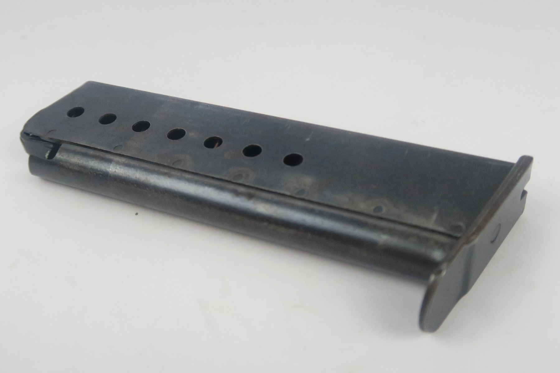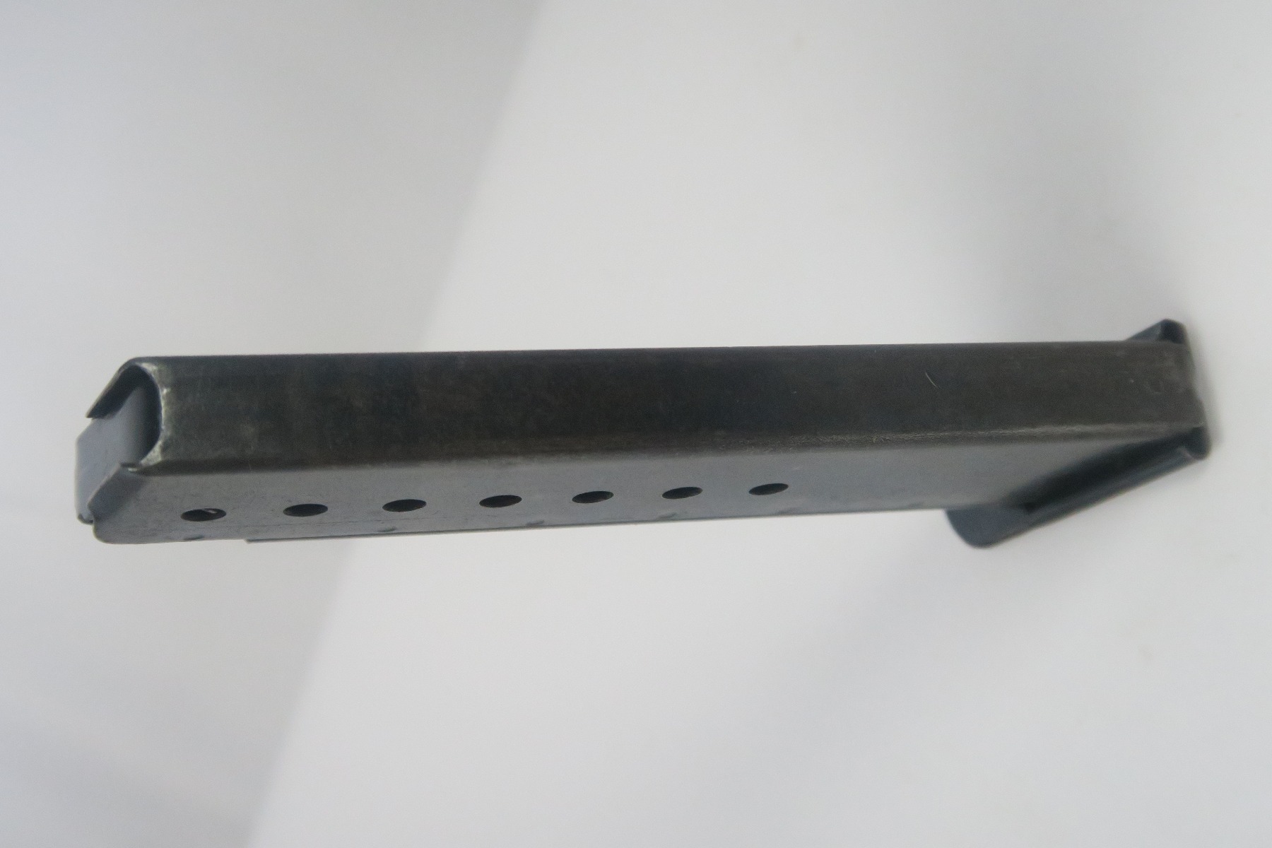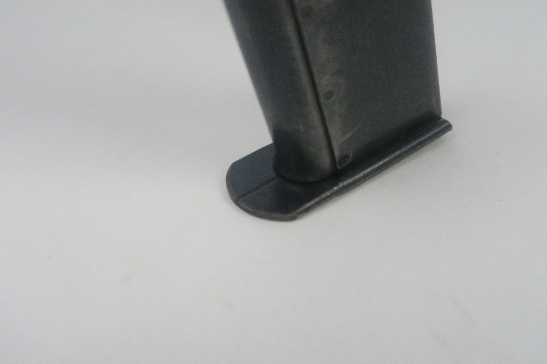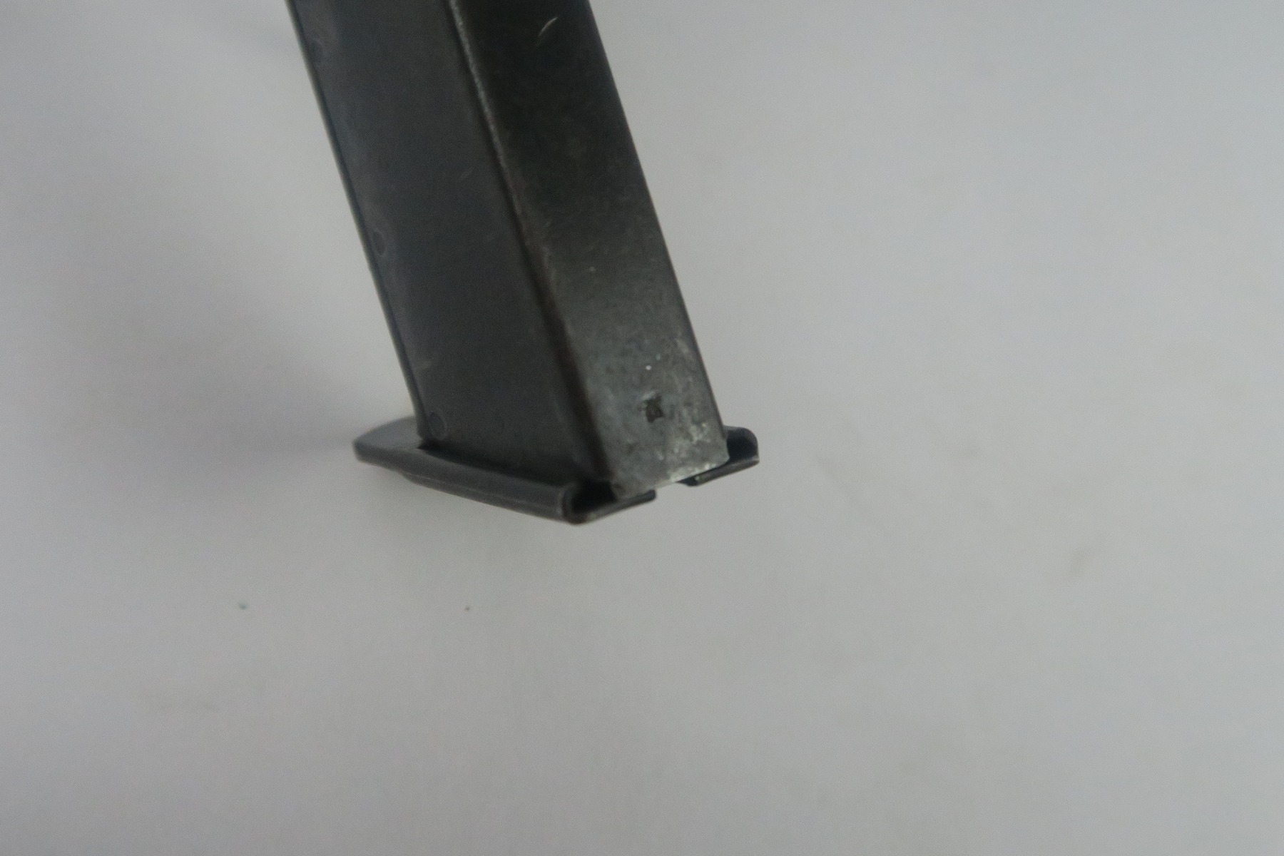 2/1/18 – This is an original WW2 production Spreewerk P.38 magazine, with unusual and scarce round weld marks. Usually the weld markings on the side of the magazine are half-circle, but these are round (an oddity). The magazine has light wear and normal aging with no major rust or pitting. The spring is strong and fully functional. The spine is stamped with an eagle/88 proof. Guaranteed original and authentic.