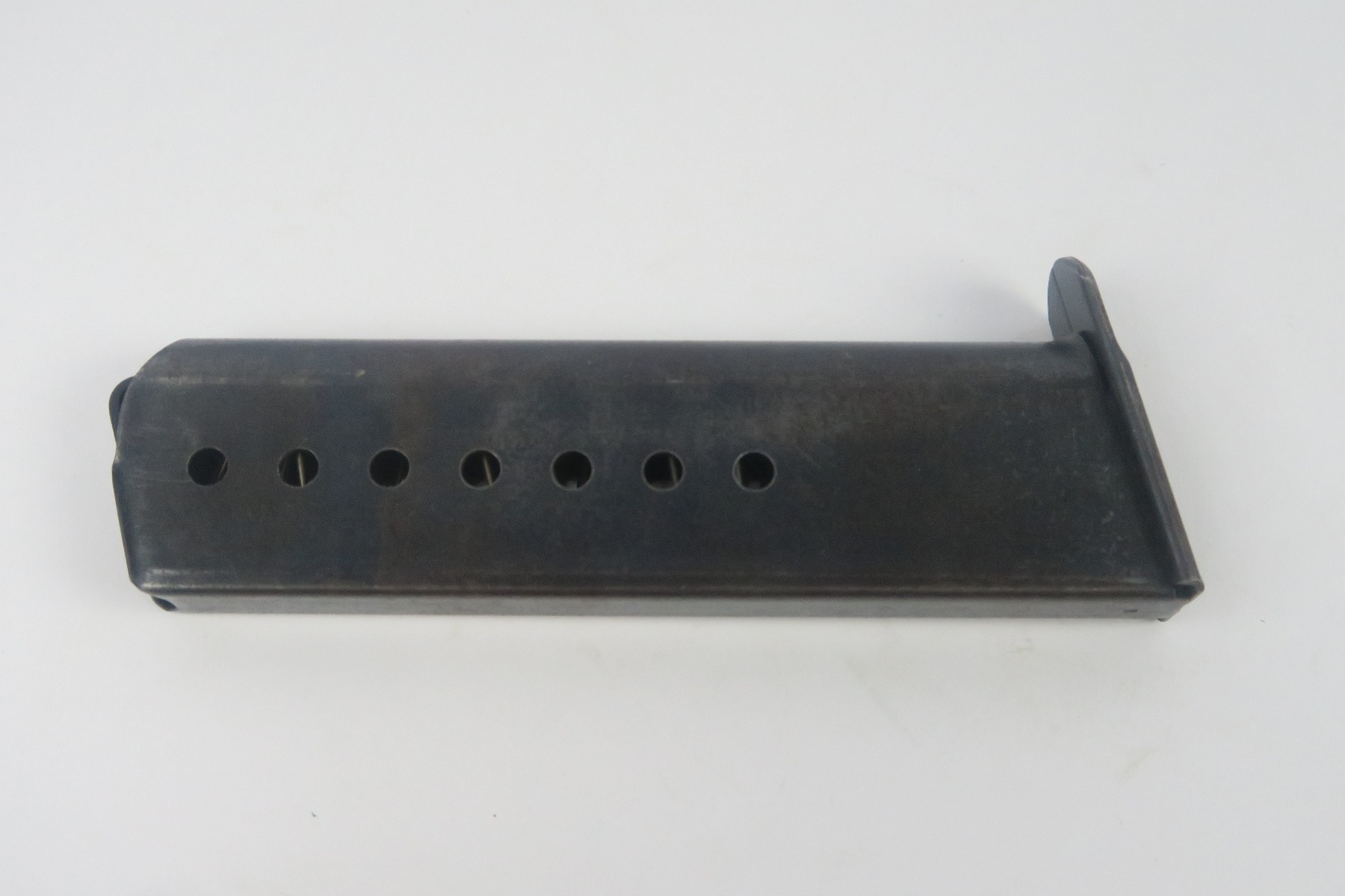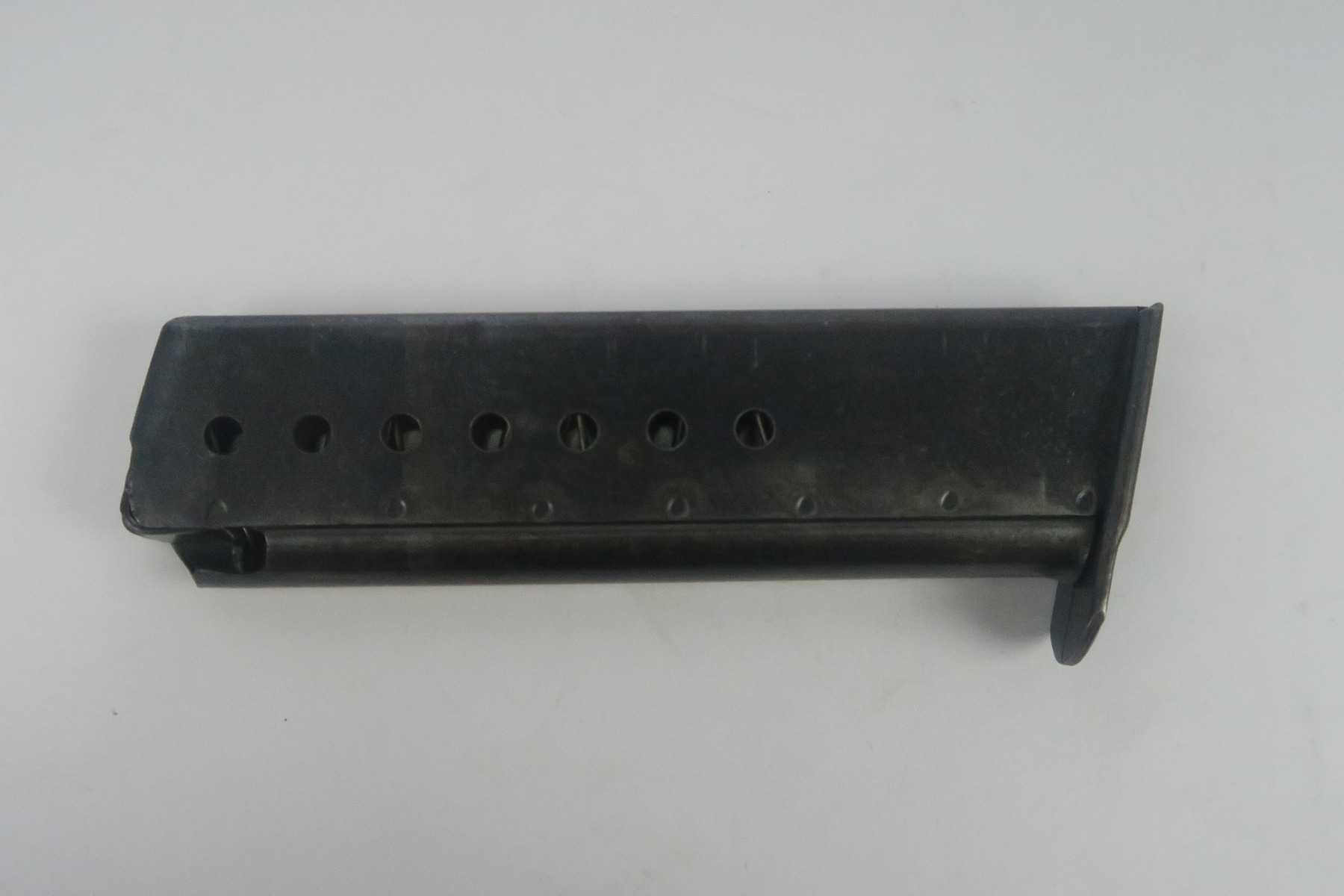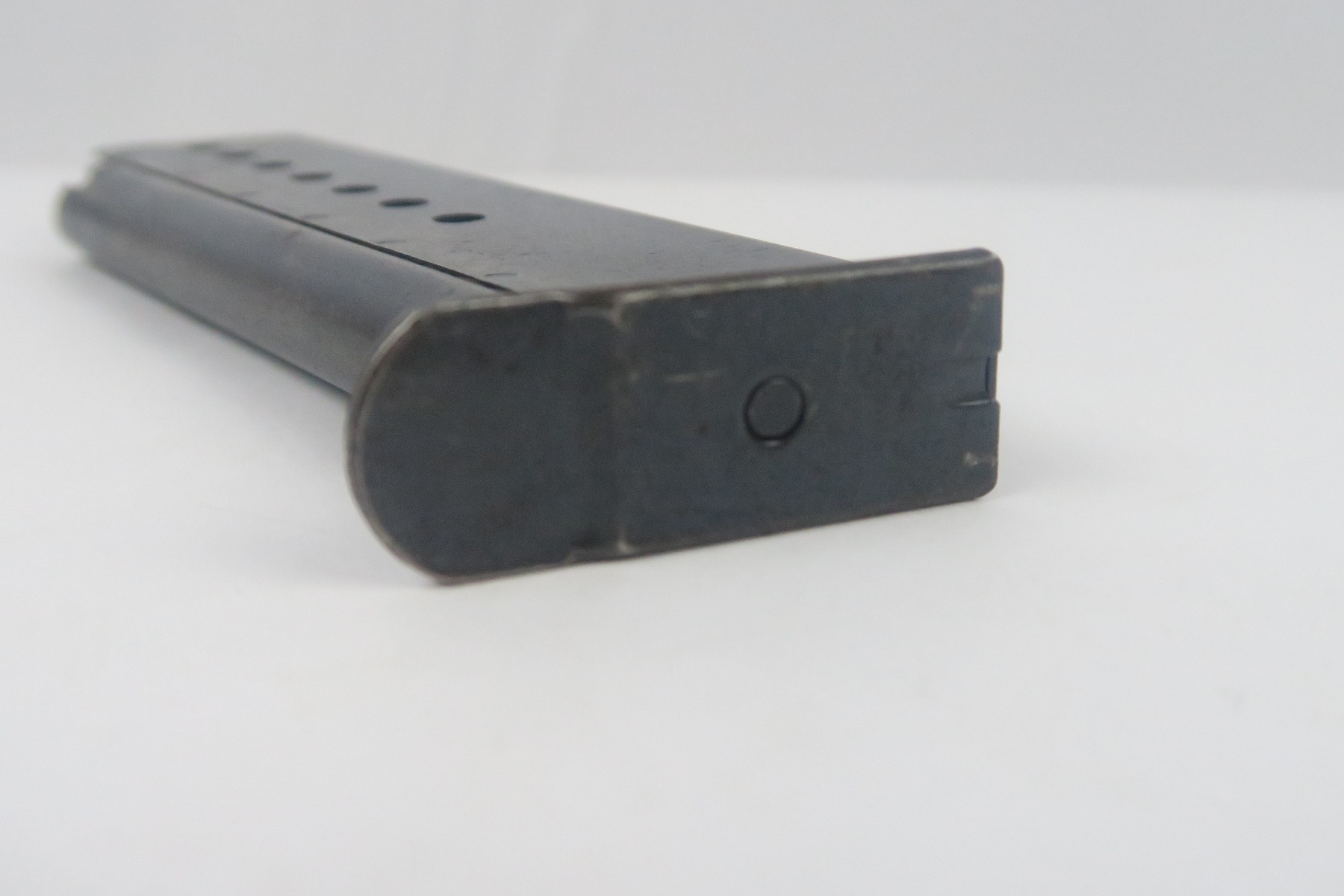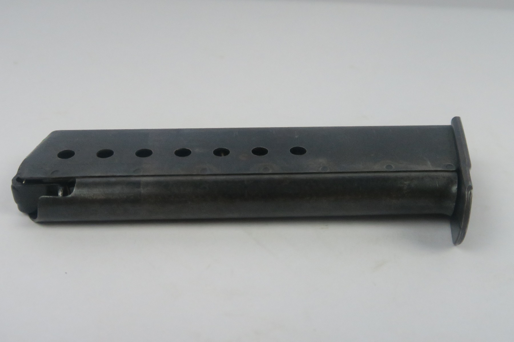 2/1/18 – This is an original WW2 production Spreewerk P.38 magazine, with unusual and scarce round weld marks. Usually the weld markings on the side of the magazine are half-circle, but these are round (an oddity). The magazine has light wear and normal aging with no major rust or pitting. The spring is strong and fully functional. The spine is stamped with an eagle/88 proof. Guaranteed original and authentic.