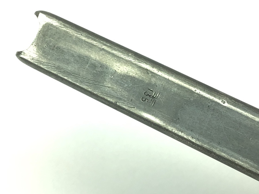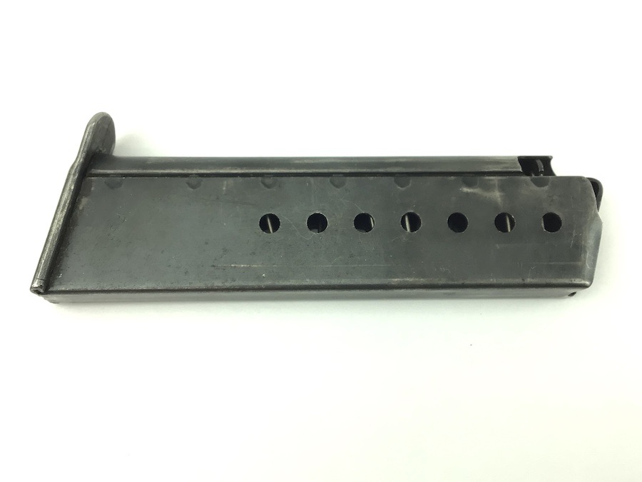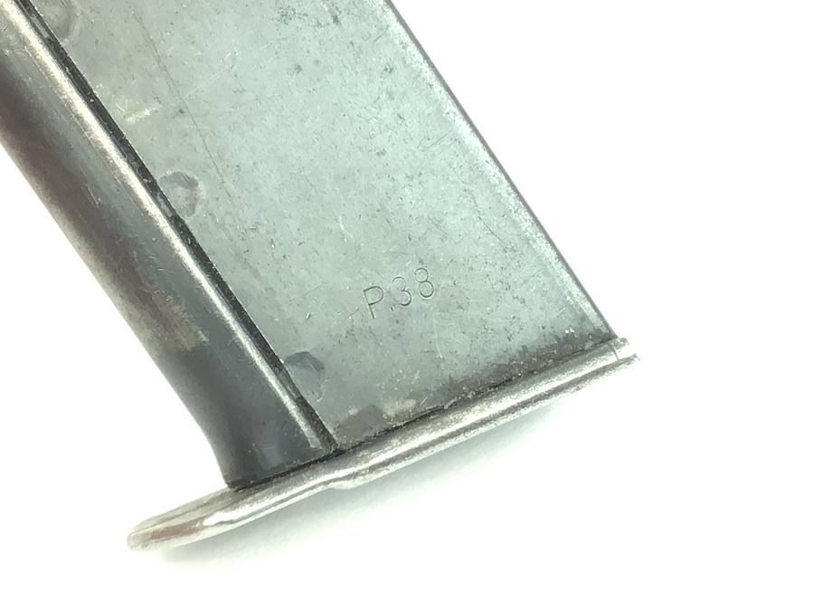4/11/22 – This is an original WW2 era Mauser P.38 magazine. The spine of the magazine is waffen proofed with a stick winged eagle 135 proof marking. One side of the frame is marked P.38. No other markings. The blued exterior shows minor wear with no rust or pitting. Excellent spring as well. These magazines were issued with Mauser pistols from byf42 till byf43 c-block (March 1943).