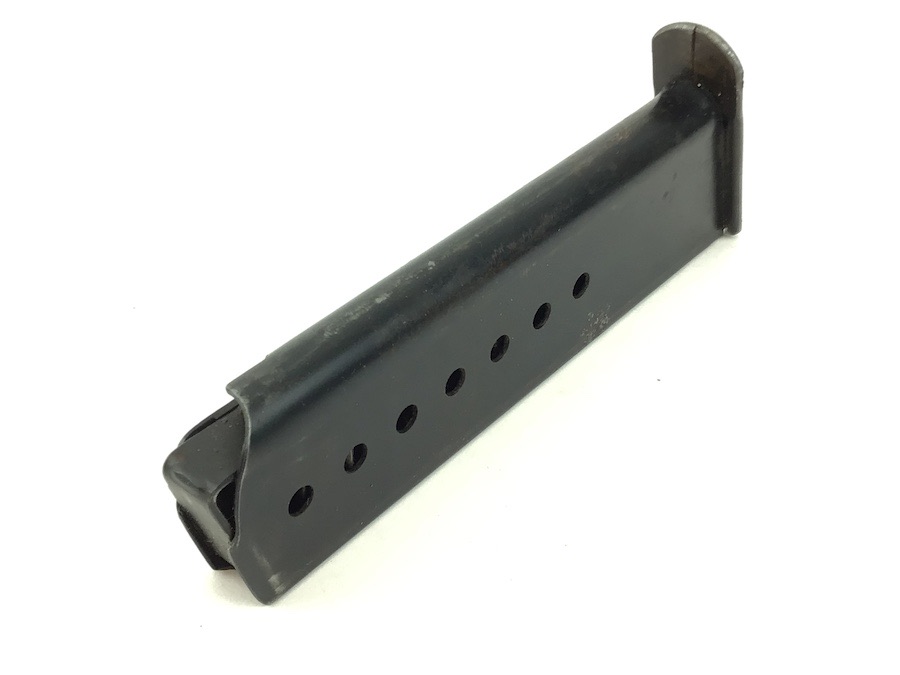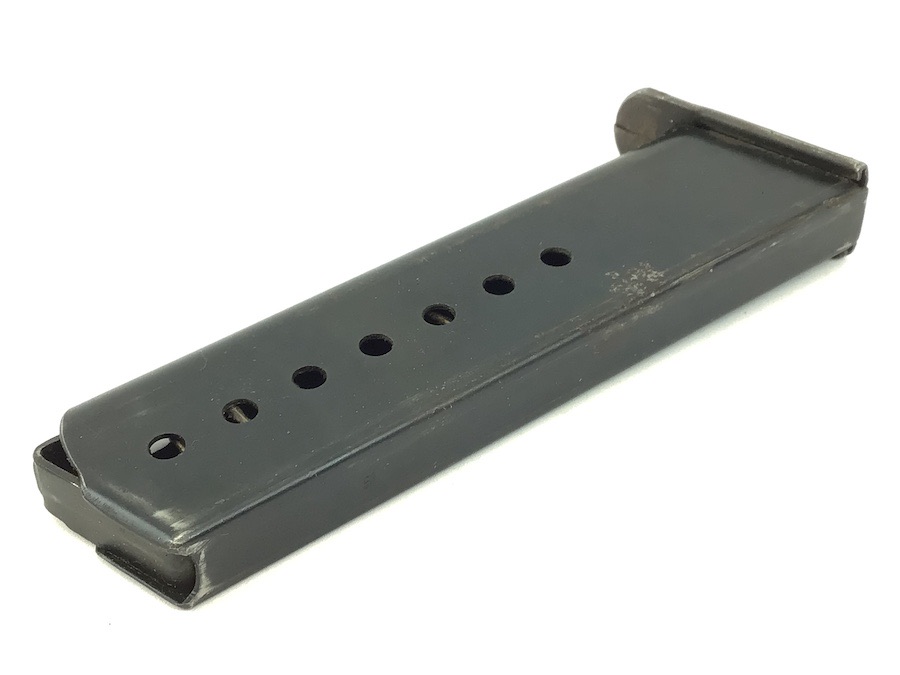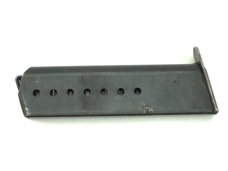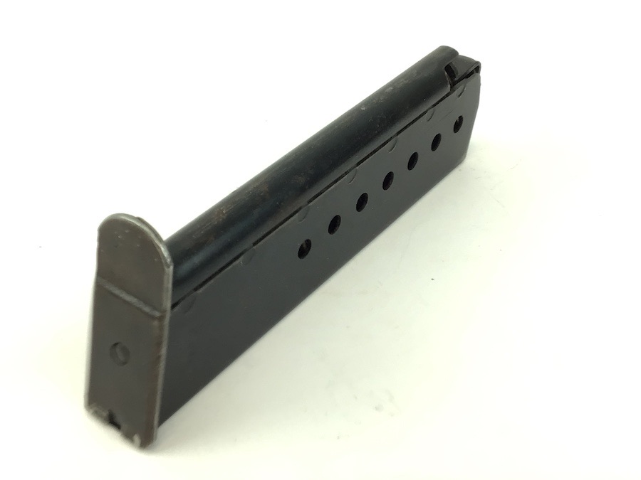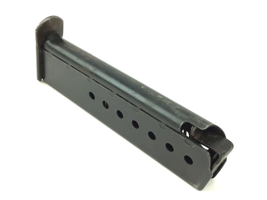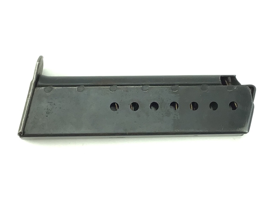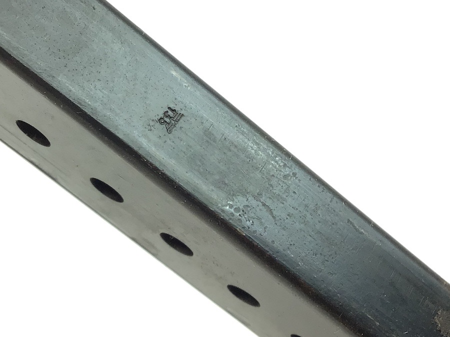 7/21/22 – This is an original WW2 era Mauser P.38 magazine. The spine of the magazine is waffen proofed with a stick winged eagle 135 proof marking. One side of the frame is marked P.38. No other markings. The blued exterior shows minor wear with no rust or pitting. Excellent spring as well. These magazines were issued with Mauser pistols from byf42 till byf43.