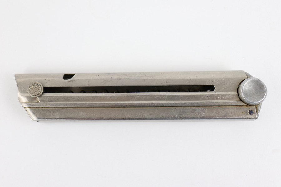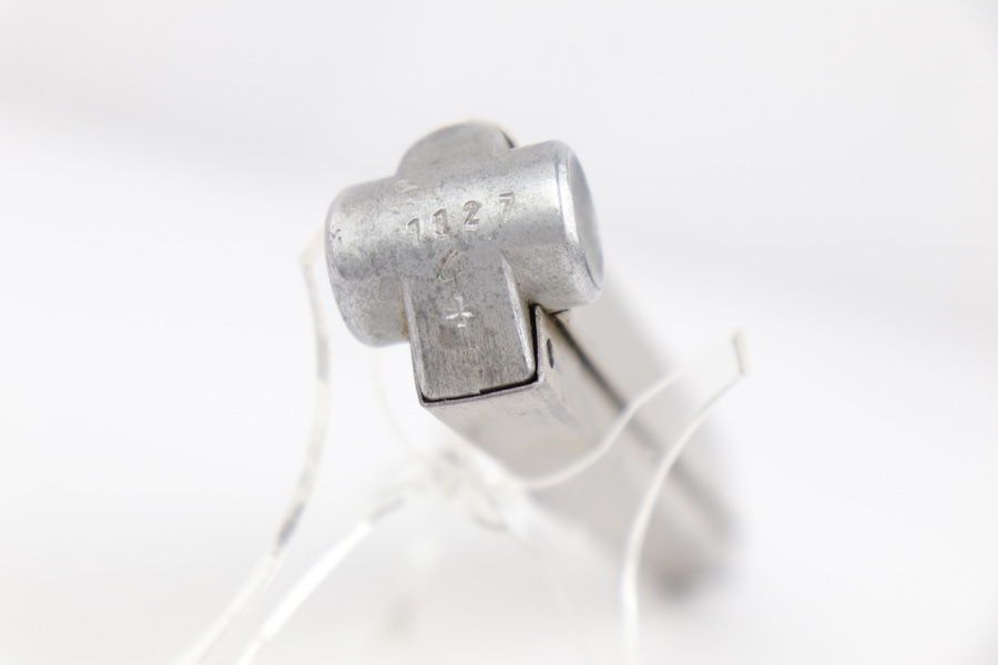 10/13/20 – This is an original and rare W/154 luger magazine. These magazines are often paired with G Date Lugers with W/154 proof stamps. The magazine has an early nickel tube and aluminum base. The base is serial numbered in the “c” block with a “+” sign and a droop winged eagle 154 proof stamp. All original and correct with fully functional spring.