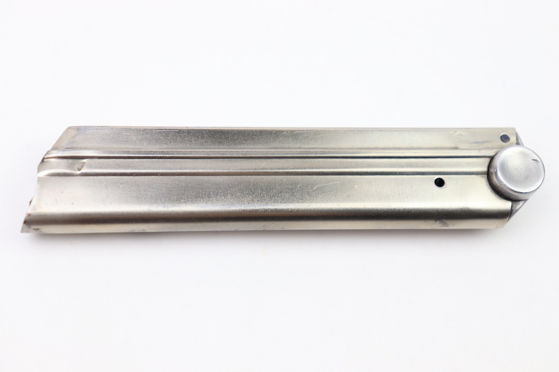 6/28/22 – This is an original G Date Mauser Luger magazine from early/pre WW2. The magazine is stamped on the base with an eagle 154 proof stamp. The magazine is in excellent overall condition with a very clean nickel tube and a fully functional spring.