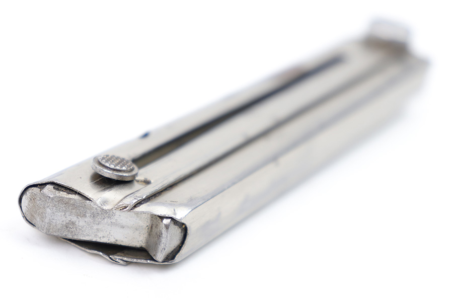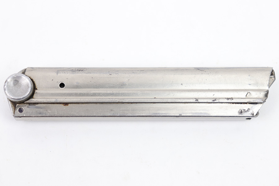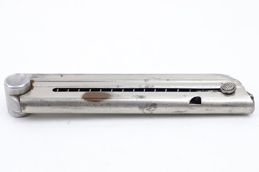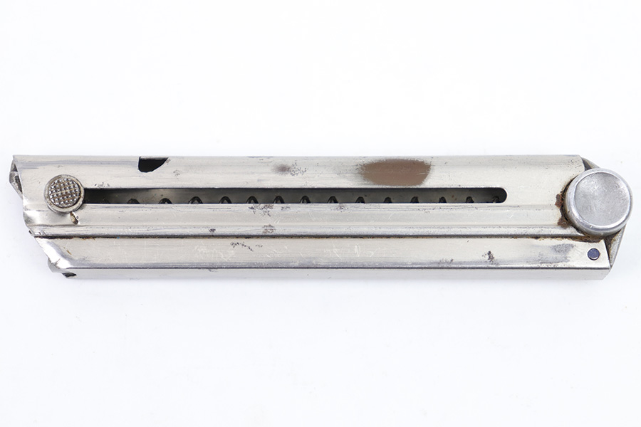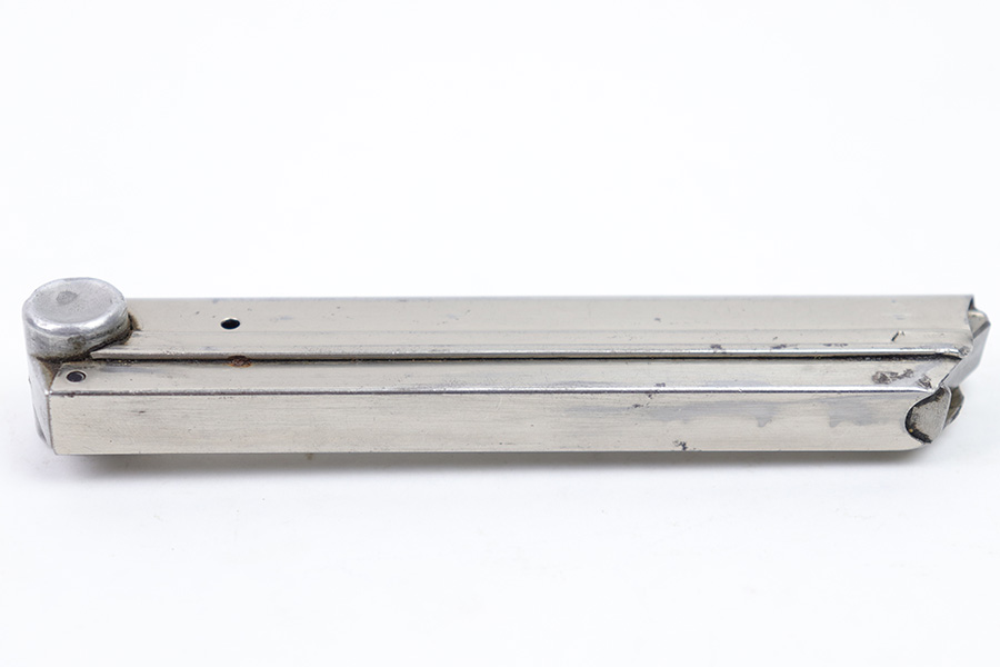 1/30/23 – This is an original G Date Mauser Luger magazine from 1935. The magazine has a nickel tube and aluminum base. The base is serial numbered 7307c with a droop winged eagle 154 proof stamp. The tube has some dark areas of discoloration, but there’s no rust or pitting and the spring is strong and functional. The magazine button is slightly bent, but this doesn’t affect functionality.