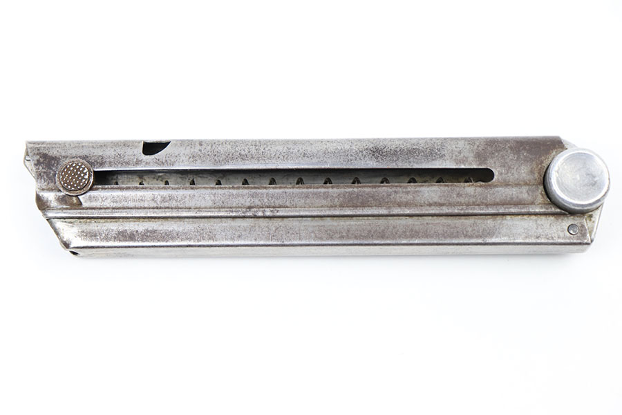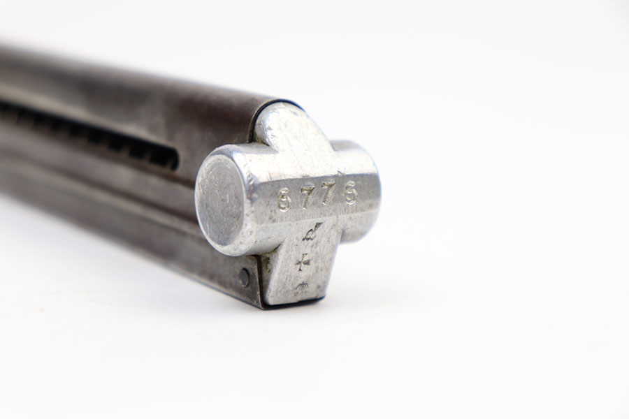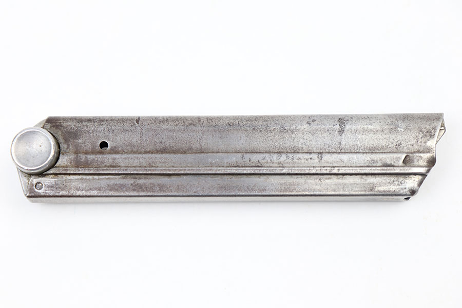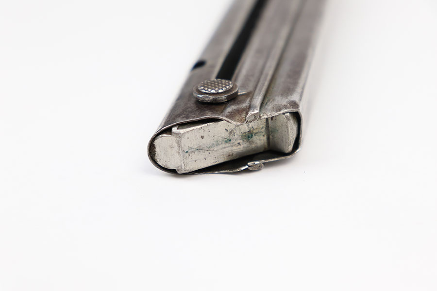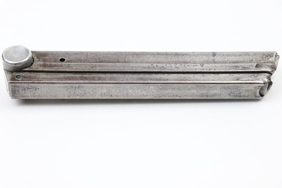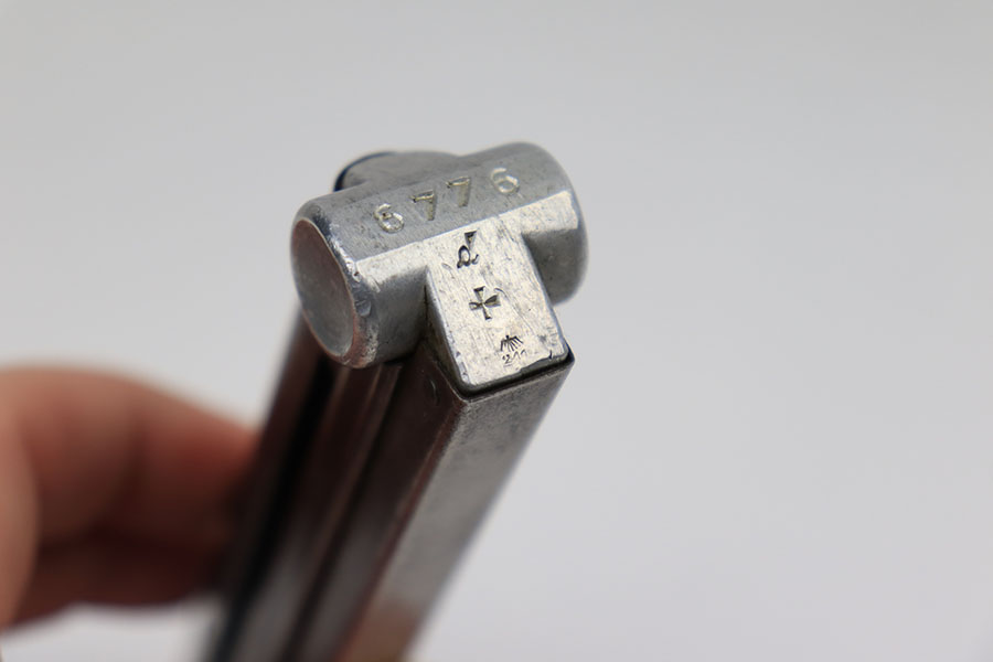 2/11/21 – This is an original WW2 era Luger magazine with a rare eagle/211 proof stamp. This stamp is frequently seen with G Date and earlier production lugers. The magazine is reduced price due to the serial number appearing to be renumbered. There’s signs of grinding/flattening of the base as a result. The magazine tube has surface patina throughout but is fully functional with no major issues.