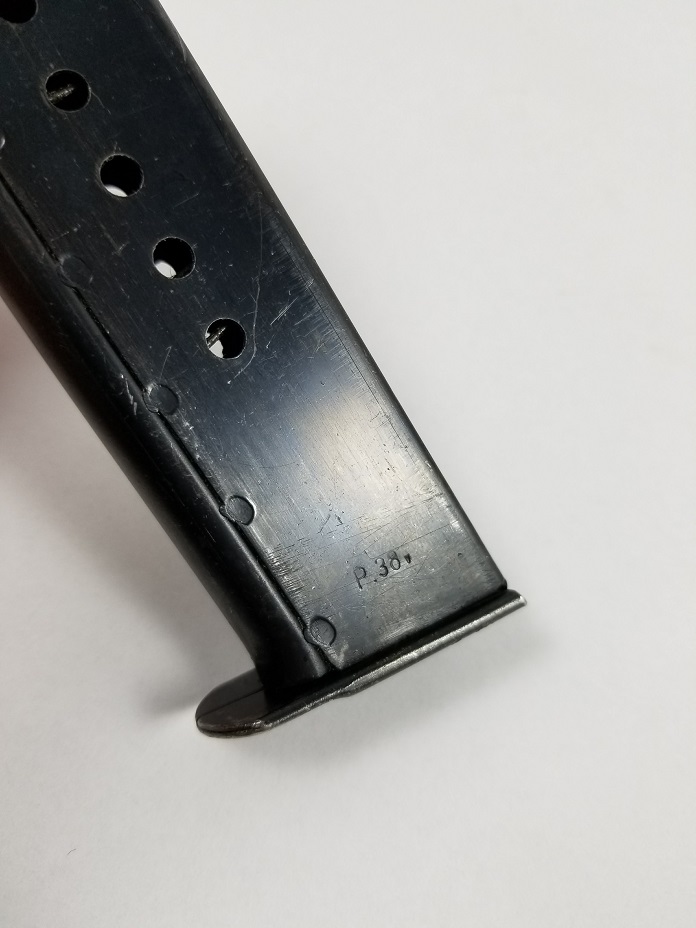 3/4/18 – This is an original wartime production Walther P.38 magazine. The spine of the magazine is ealge/359 proof stamped. There is also a P.38v stamped on the frame. The magazine overall is in excellent condition with no rust or pitting. The spring is strong and fully functional. Guaranteed original and authentic.
