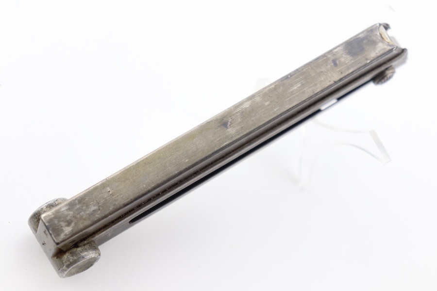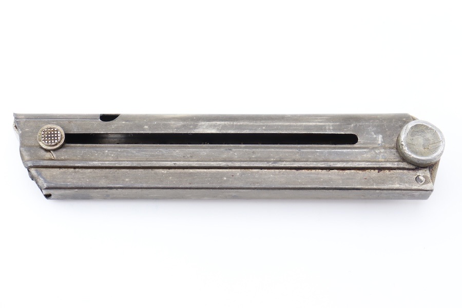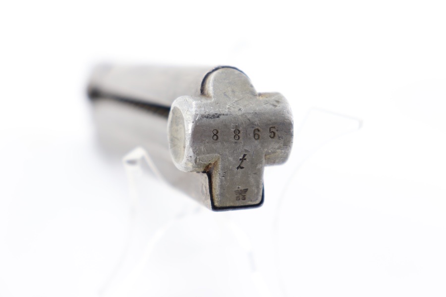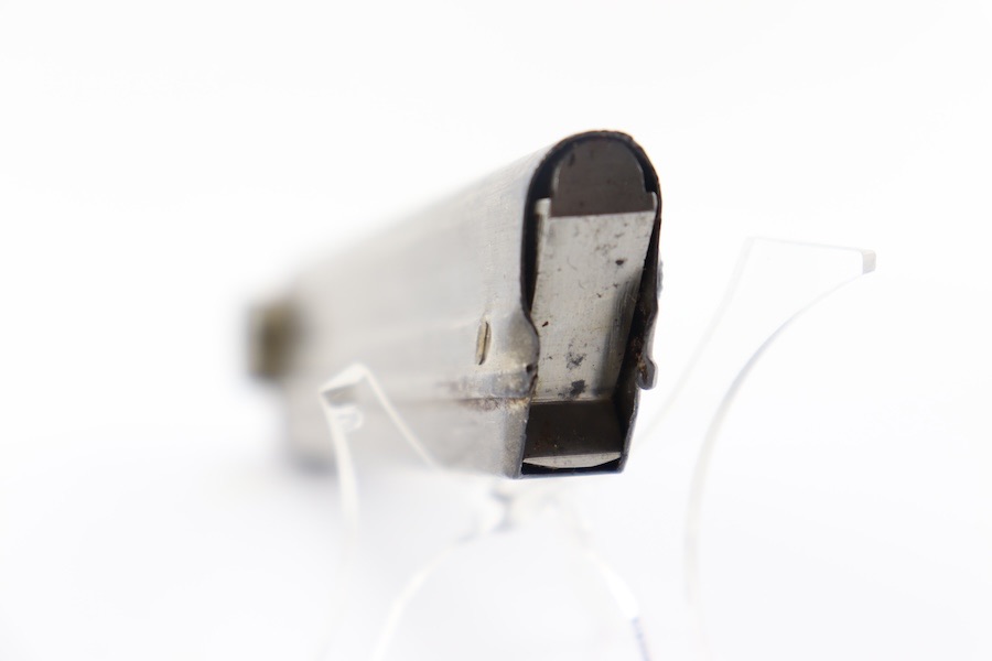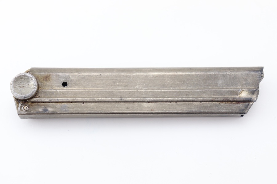 5/1/24 – This is an original Mauser stick eagle 63 proofed Luger magazine from WW2. The magazine is in good condition overall but is missing nearly all of its blued finish. There is some minor patina on both sides of the magazine and some pin pricking on the spine. The aluminum base is stamped with serial number “8865” with a “T” suffix. Below those markings is the stick eagle 63 proof stamp. Strong spring and fully functional.