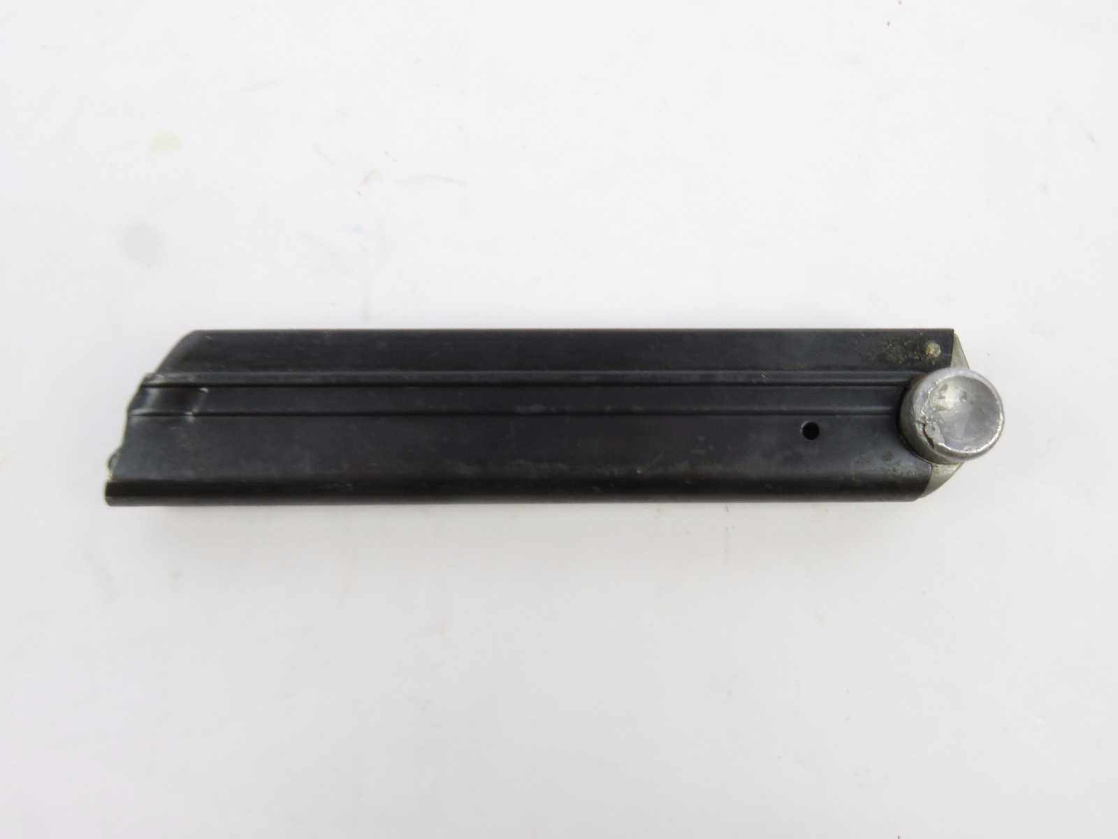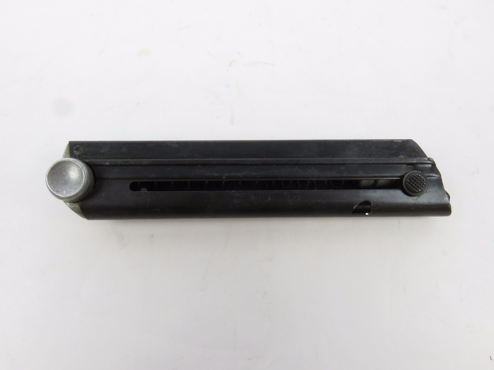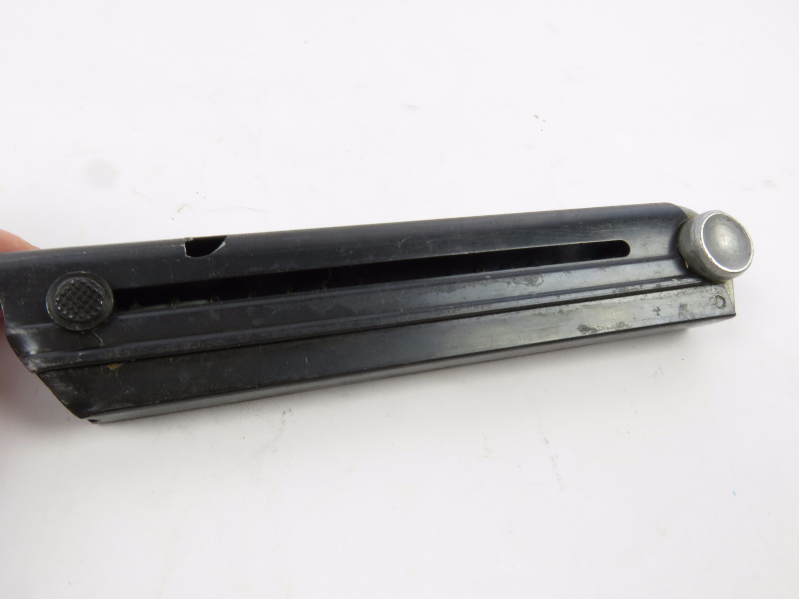 7/7/17 – This is an original WW2 production Luger magazine. The magazine base is aluminum with a serial number, “h” suffix, “+” sign, and an eagle 63 proof stamp. The serial number is oddly upside down. The magazine tube is blued and in great shape, but there is some minor residue/surface wear on the tube – we try to show this in photos. The spring is strong and fully functional.