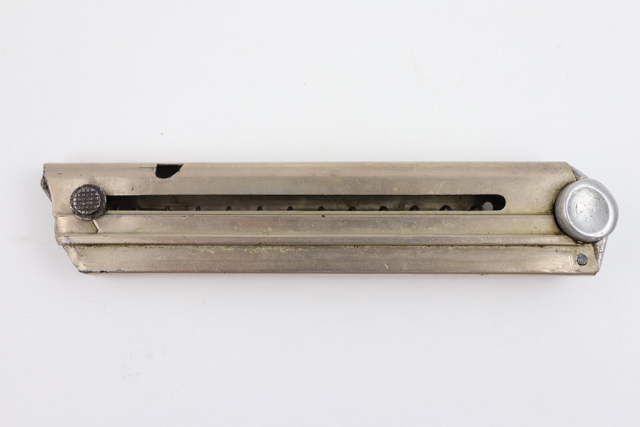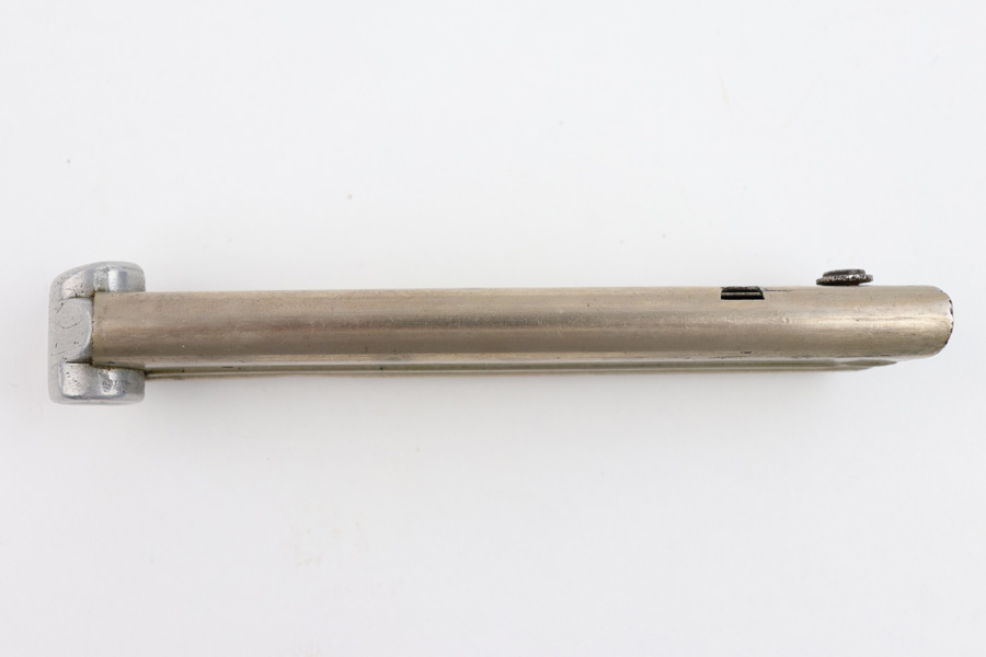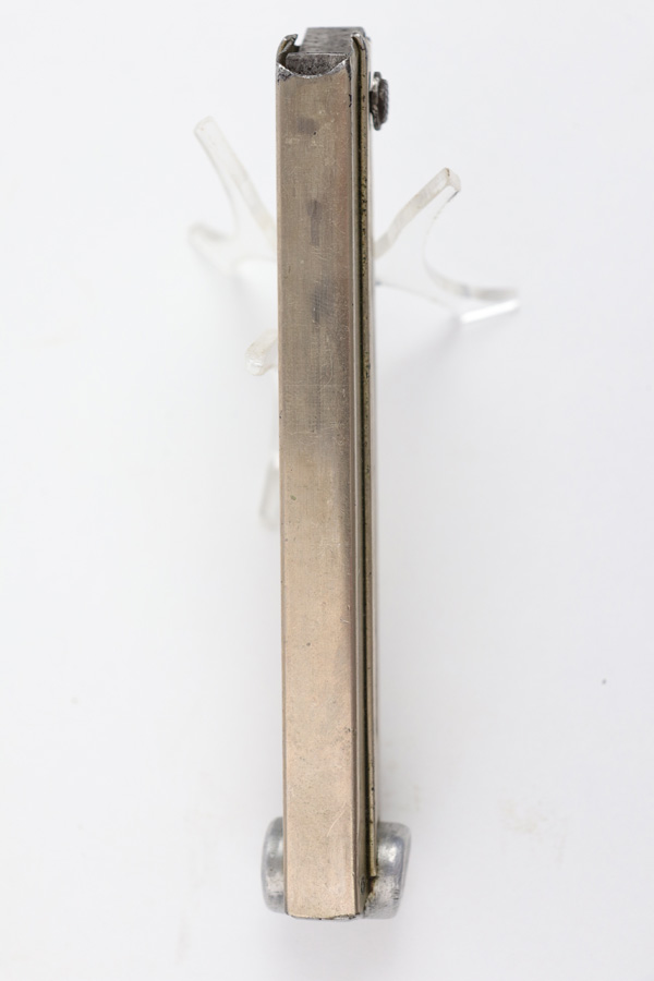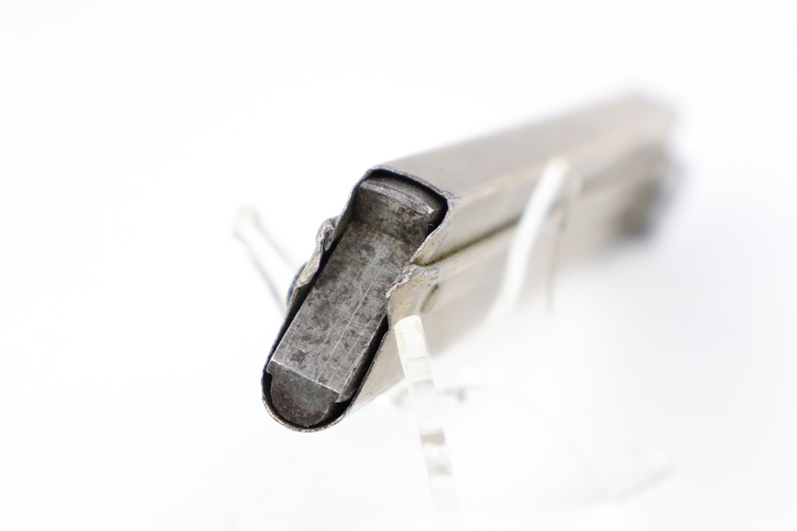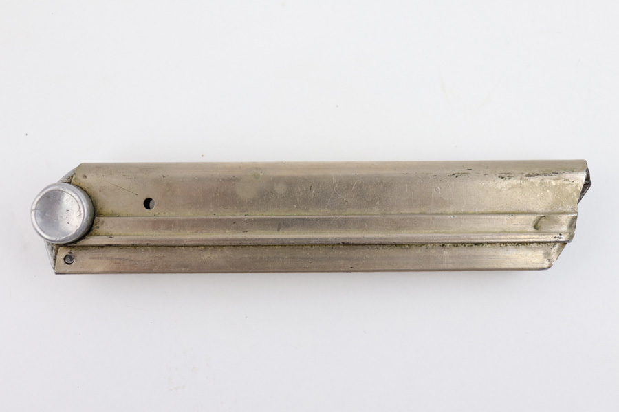 7/31/19 – This is an original, early style stick eagle/63 luger magazine from WW2. The magazine is early, most likely 1937 or 1938 production because of the nickel frame. Mostly nickel frames are found with droop eagle/63 proofs. The base of the magazine has some wear and the proof is fairly weak, so the price is adjusted. The frame is excellent with no rust or pitting, and the spring is strong and fully functional.