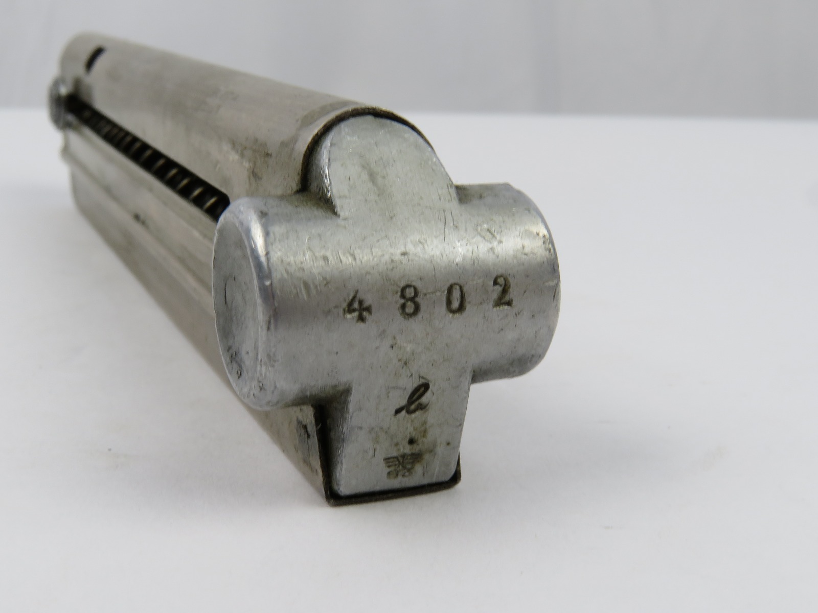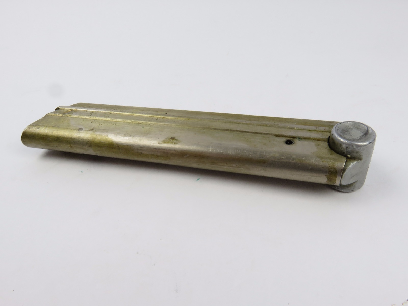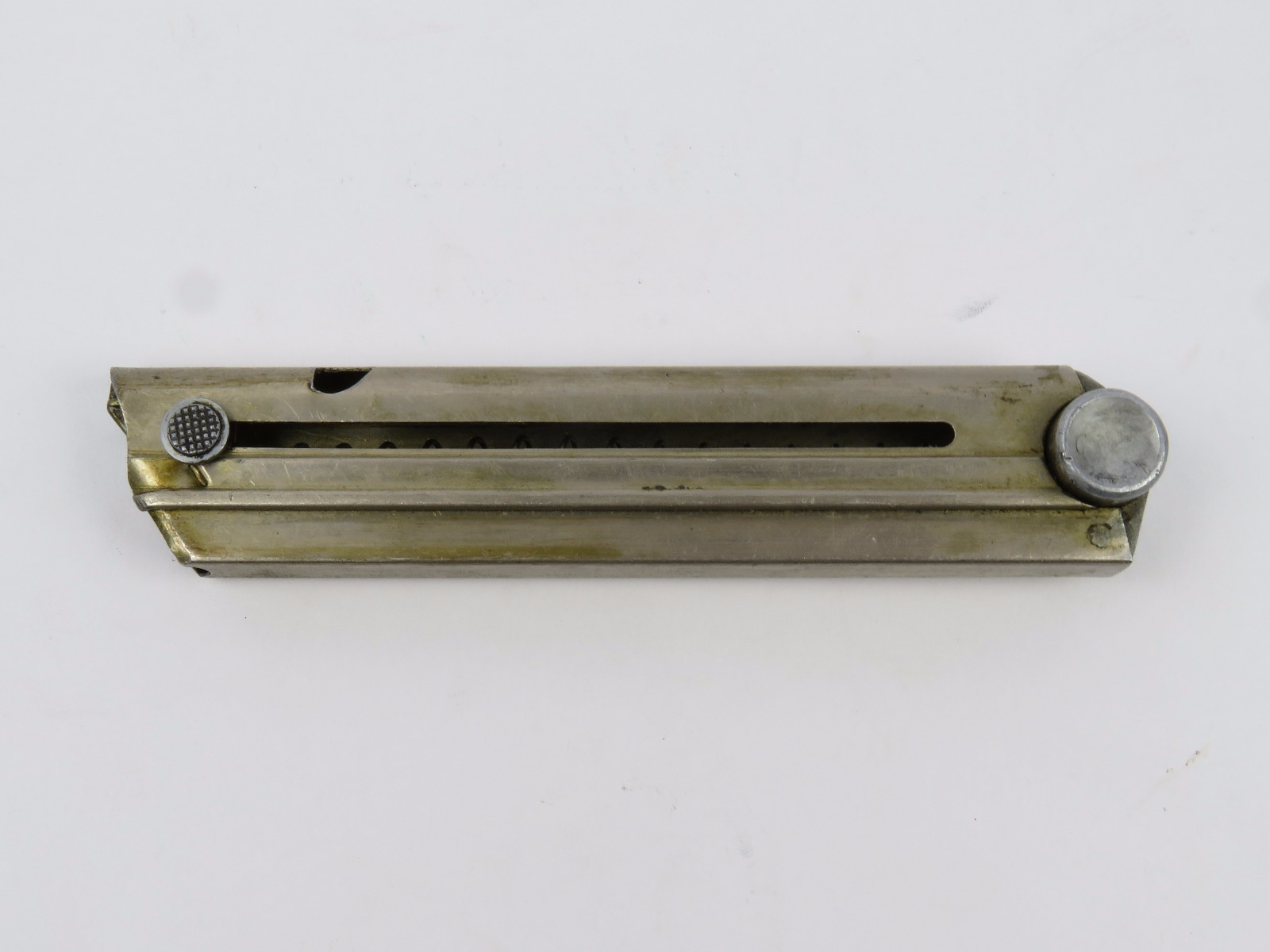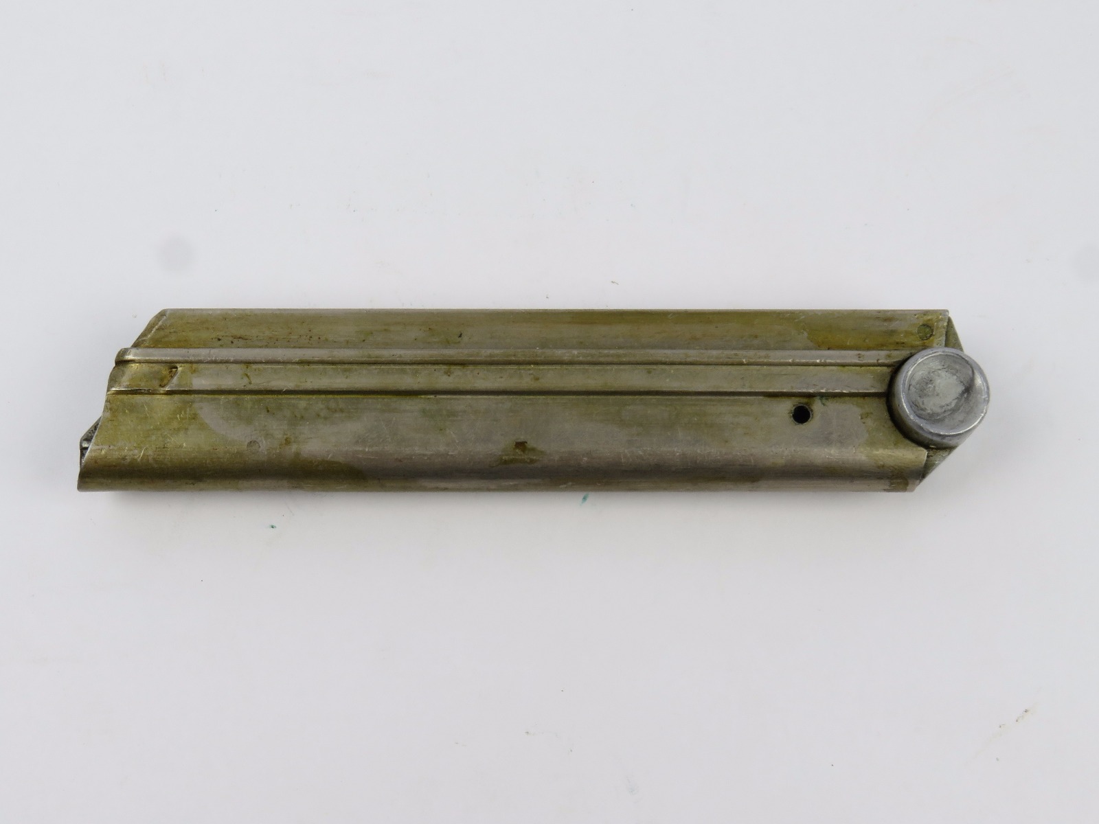 7/18/17 – This is an original Mauser Luger magazine, most likely made during 1938 or 1939. We can assume this due to the early pre 1940 style aluminum frame. Additionally, the base of the magazine is stick wing eagle 63 proofed, which is a post 1936 proof stamp. The magazine has some light discoloration but no rust or pitting. The spring is strong and has a smooth action. The base is serial numbered and proofed, all in excellent original condition.
