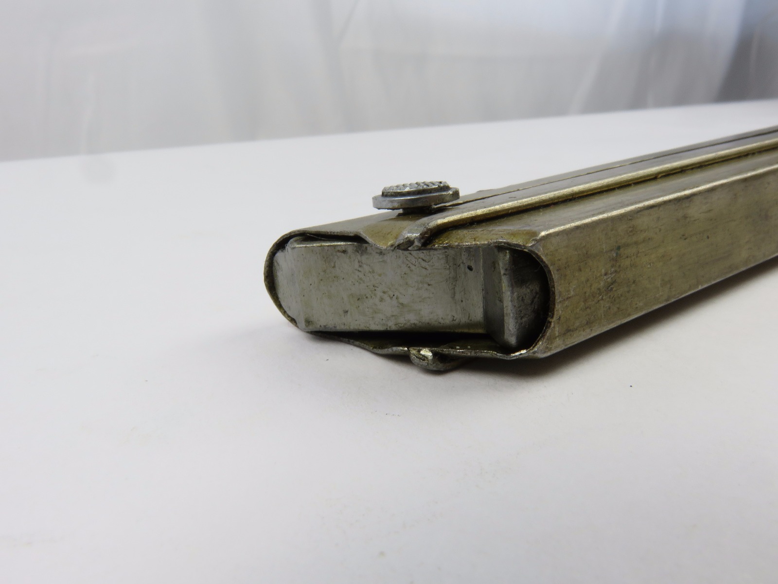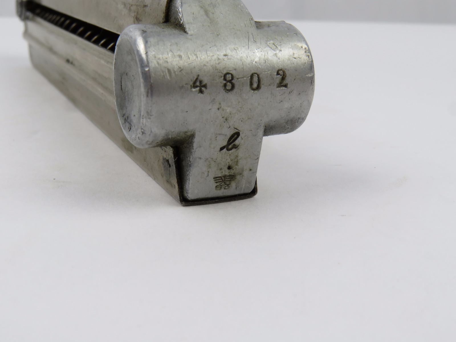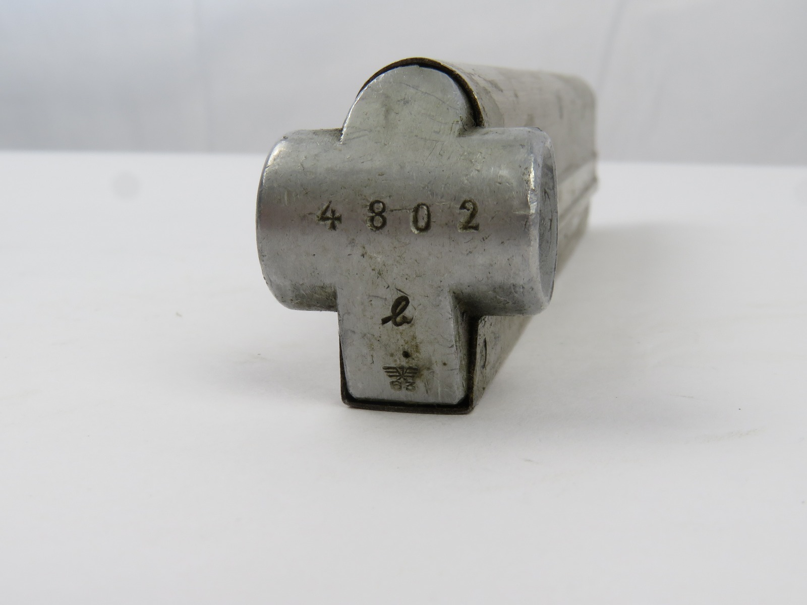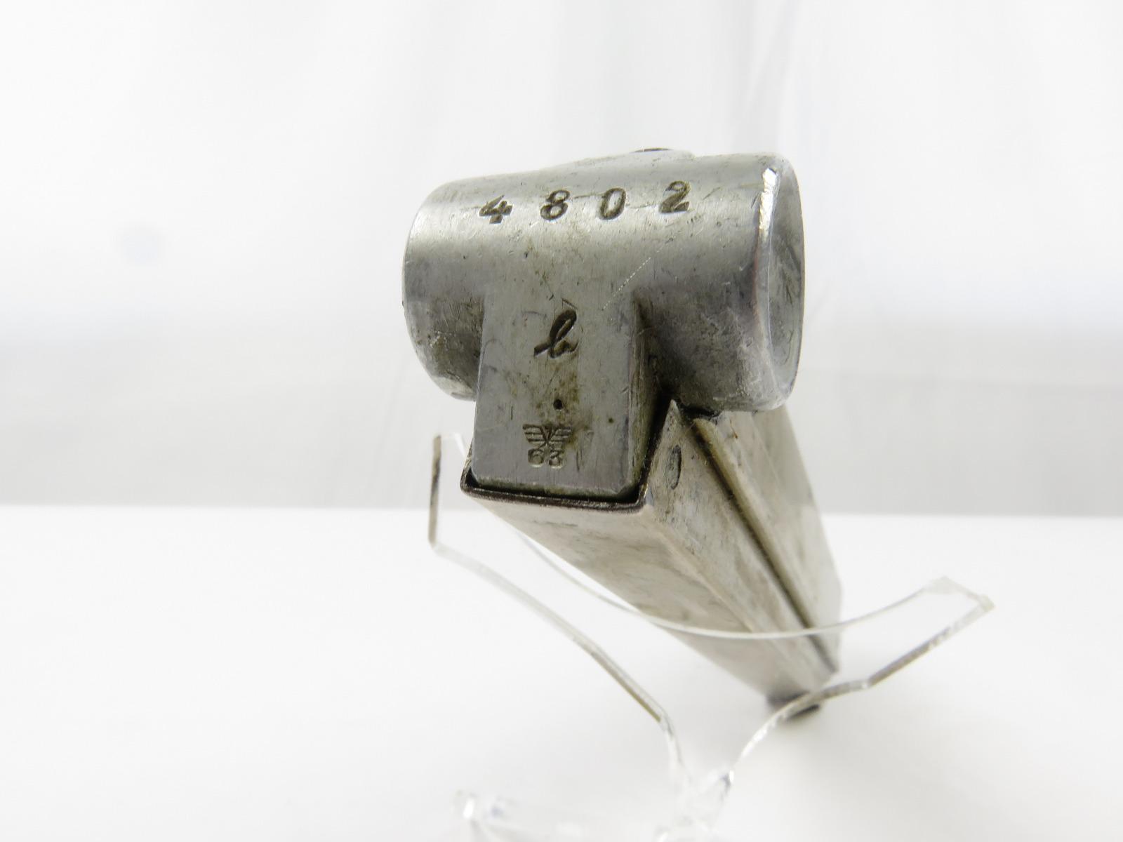 7/18/17 – This is an original Mauser Luger magazine, most likely made during 1938 or 1939. We can assume this due to the early pre 1940 style aluminum frame. Additionally, the base of the magazine is stick wing eagle 63 proofed, which is a post 1936 proof stamp. The magazine has some light discoloration but no rust or pitting. The spring is strong and has a smooth action. The base is serial numbered and proofed, all in excellent original condition.