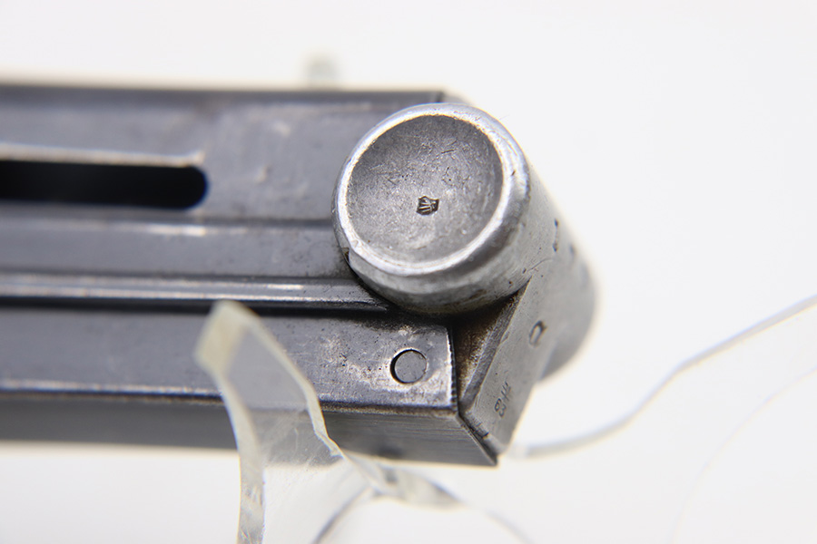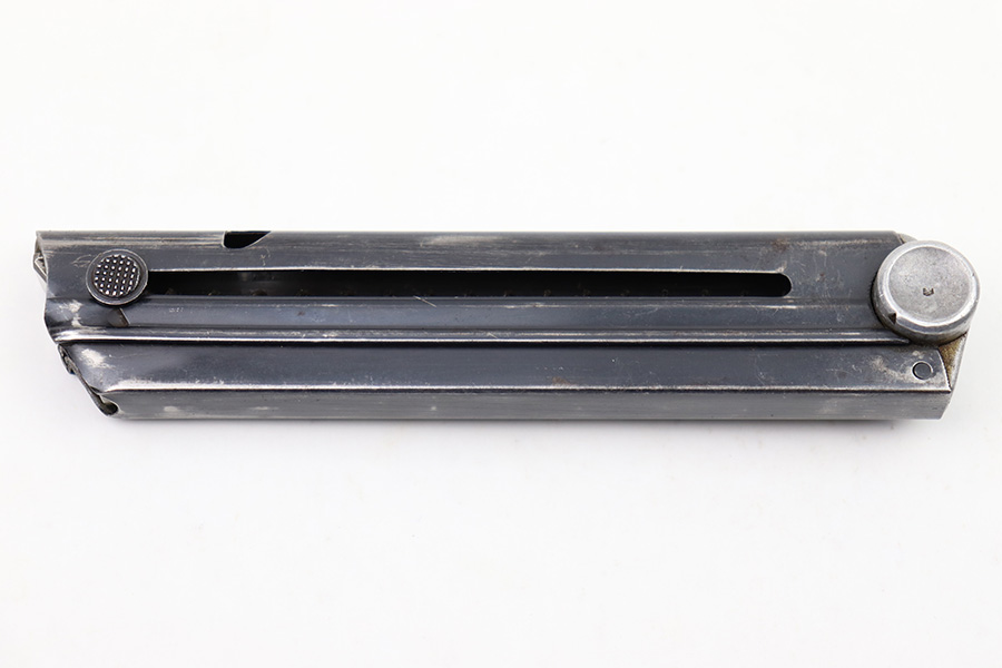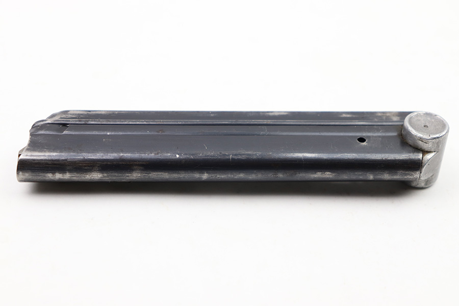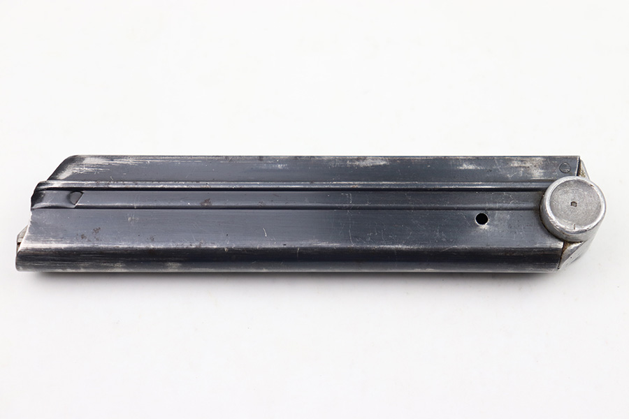 7/25/22 – This is an original Mauser luger magazine from WW2. The magazine has a blued tube and aluminum base. The base is serial numbered “175 a” with a small eagle 63 proof stamp underneath. The tube has some mild finish loss and thinning in various areas, but overall the finish is in great condition. Strong, functional spring.