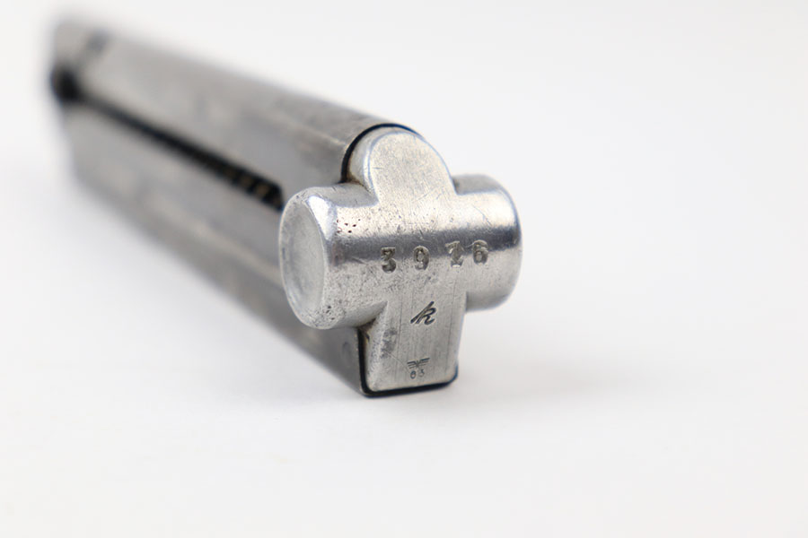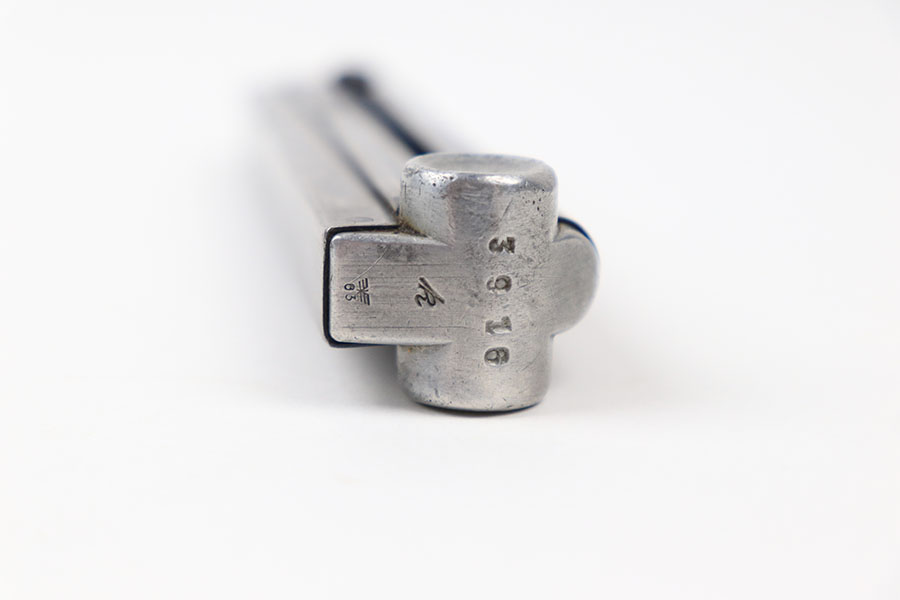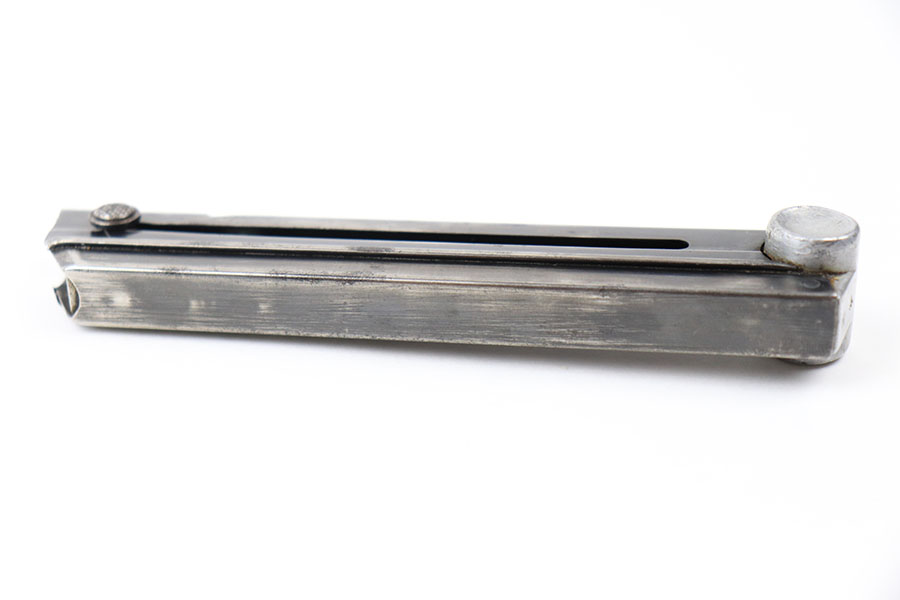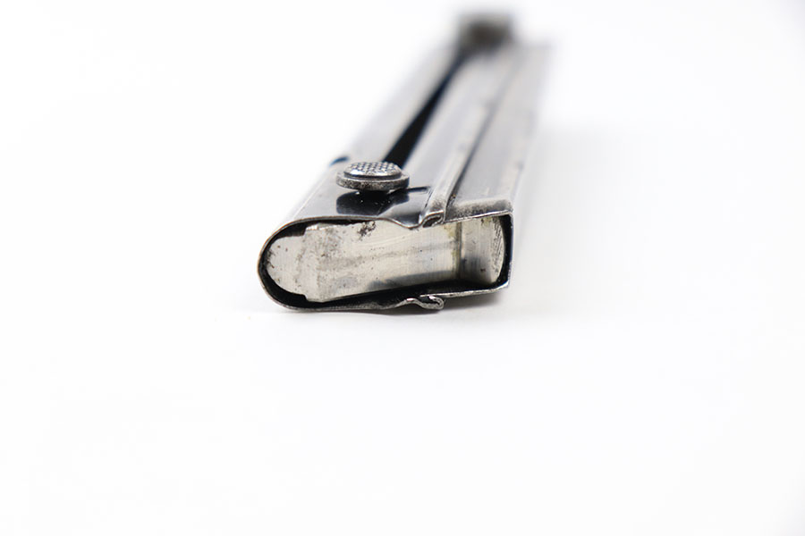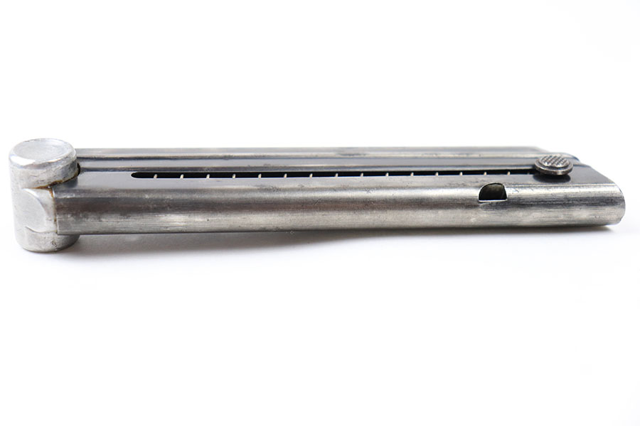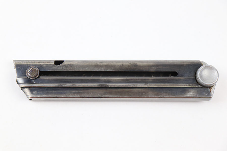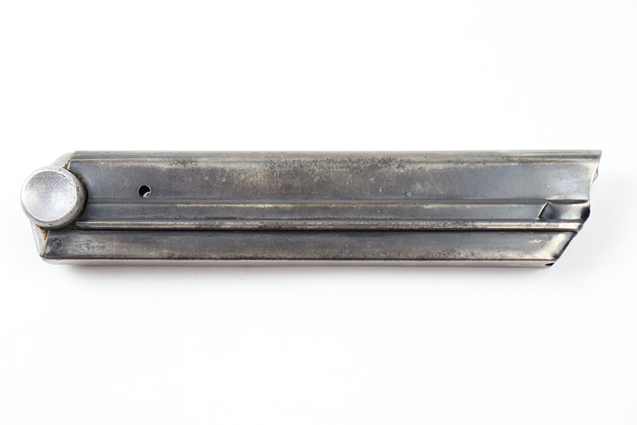 9/15/21 – This is an original Mauser Luger magazine. The aluminum base is serial numbered 3916k with an eagle 63 proof stamp underneath. The magazine tube has some mild patina and finish thinning / finish loss throughout, but most of the finish is in tact. The spring is strong and fully functional.