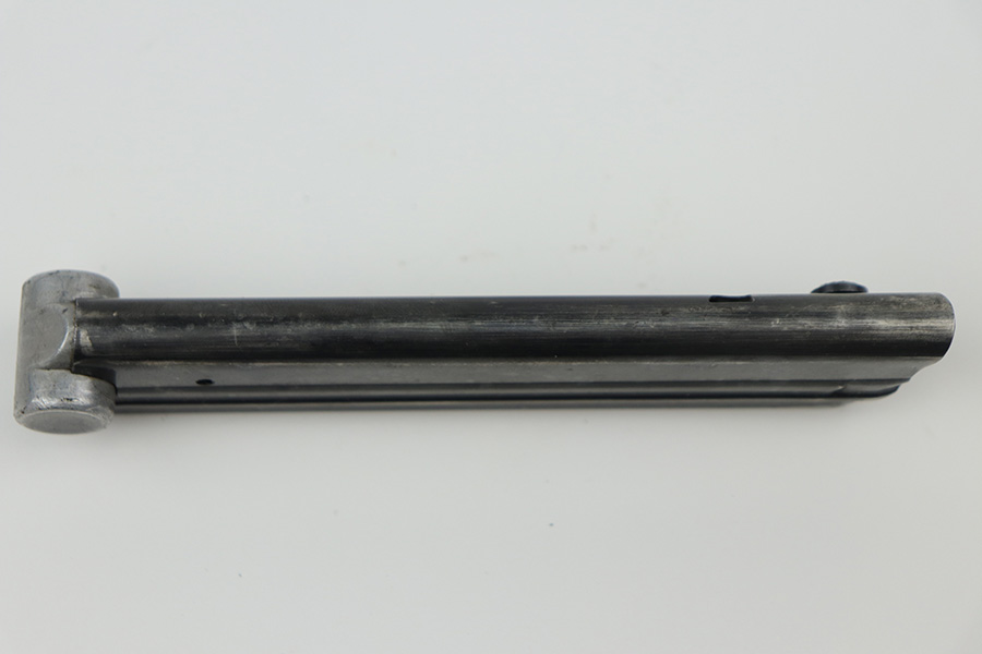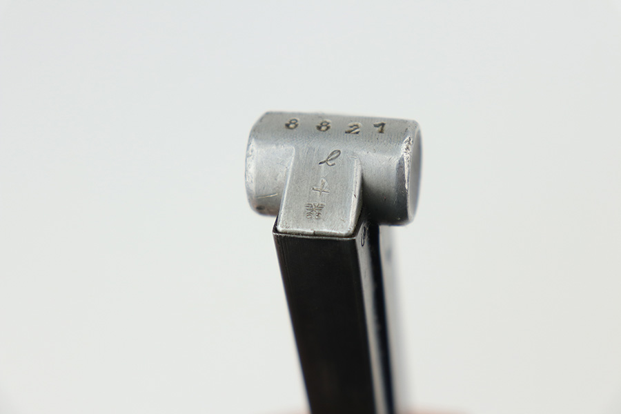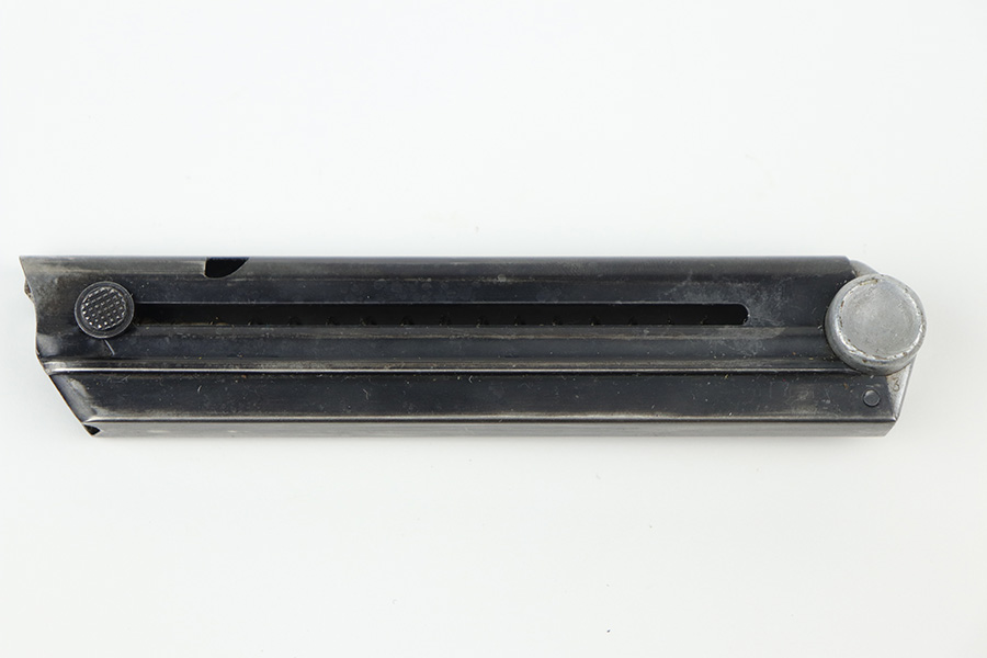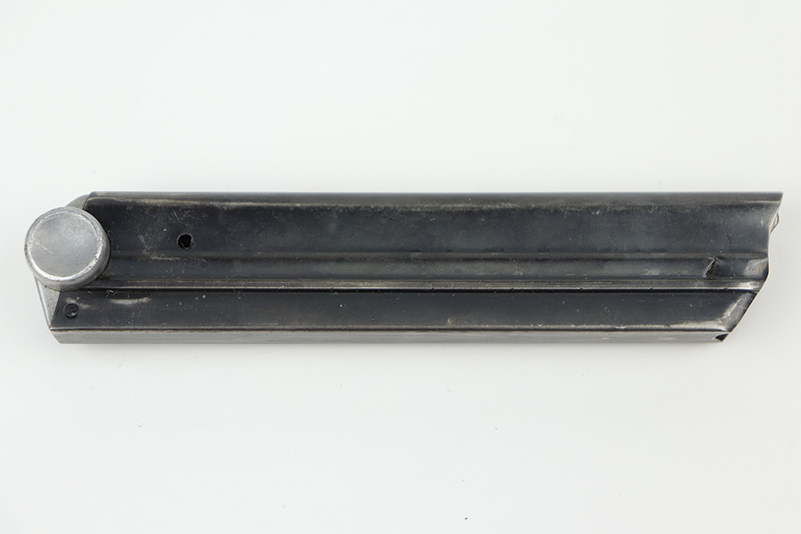 10/20/21 – This is an original Mauser Luger magazine from WW2. The base is aluminum, and serial numbered with an eagle 63 proof stamp. The serial number appears to be re-stamped, as there are signs of rounding / sanding and re-stamping. The blued finish on the tube is in great shape with no rust or pitting. Fully functional spring.