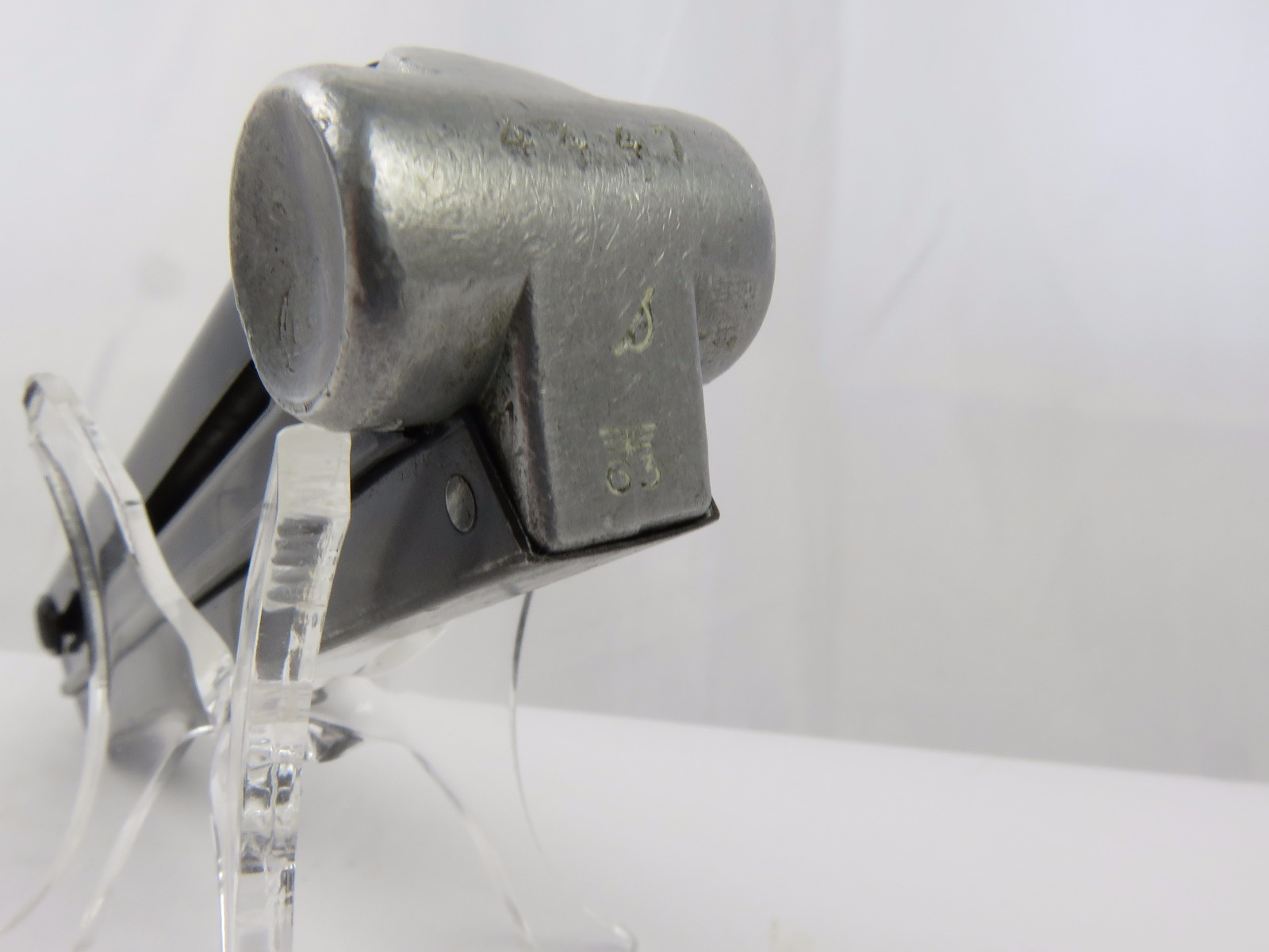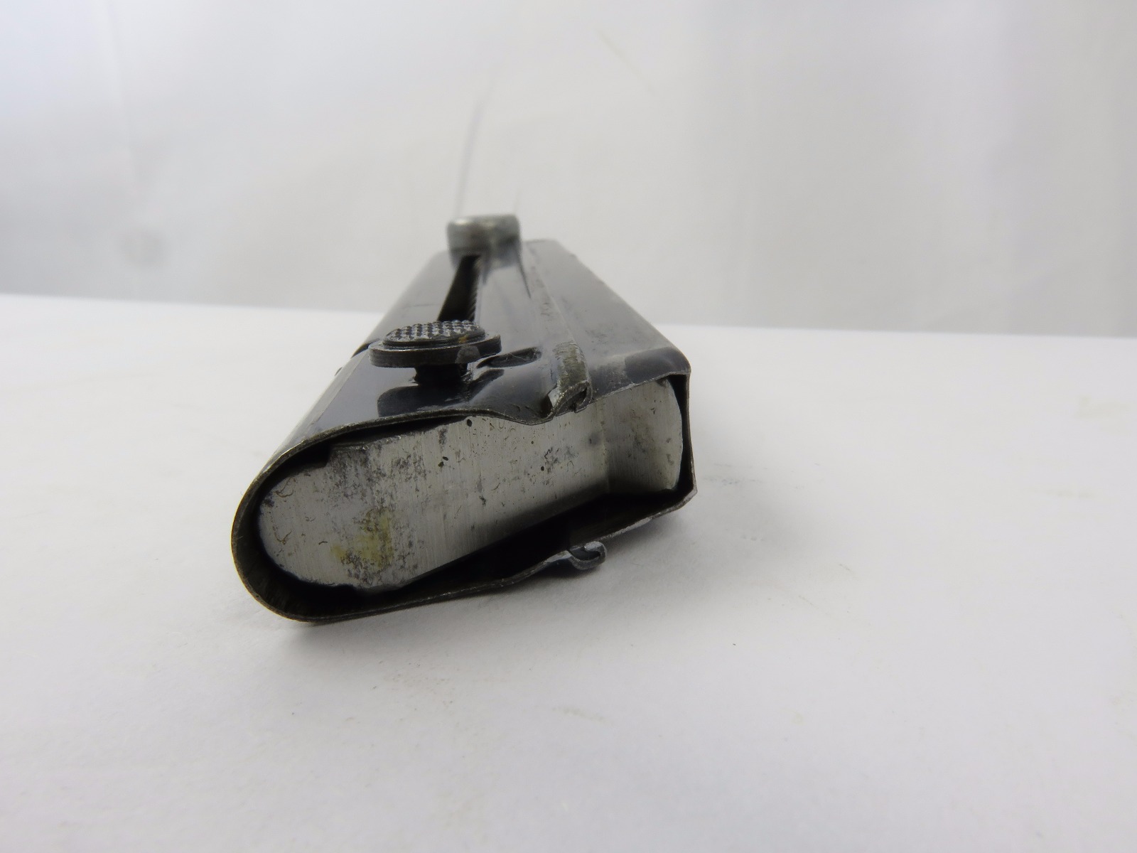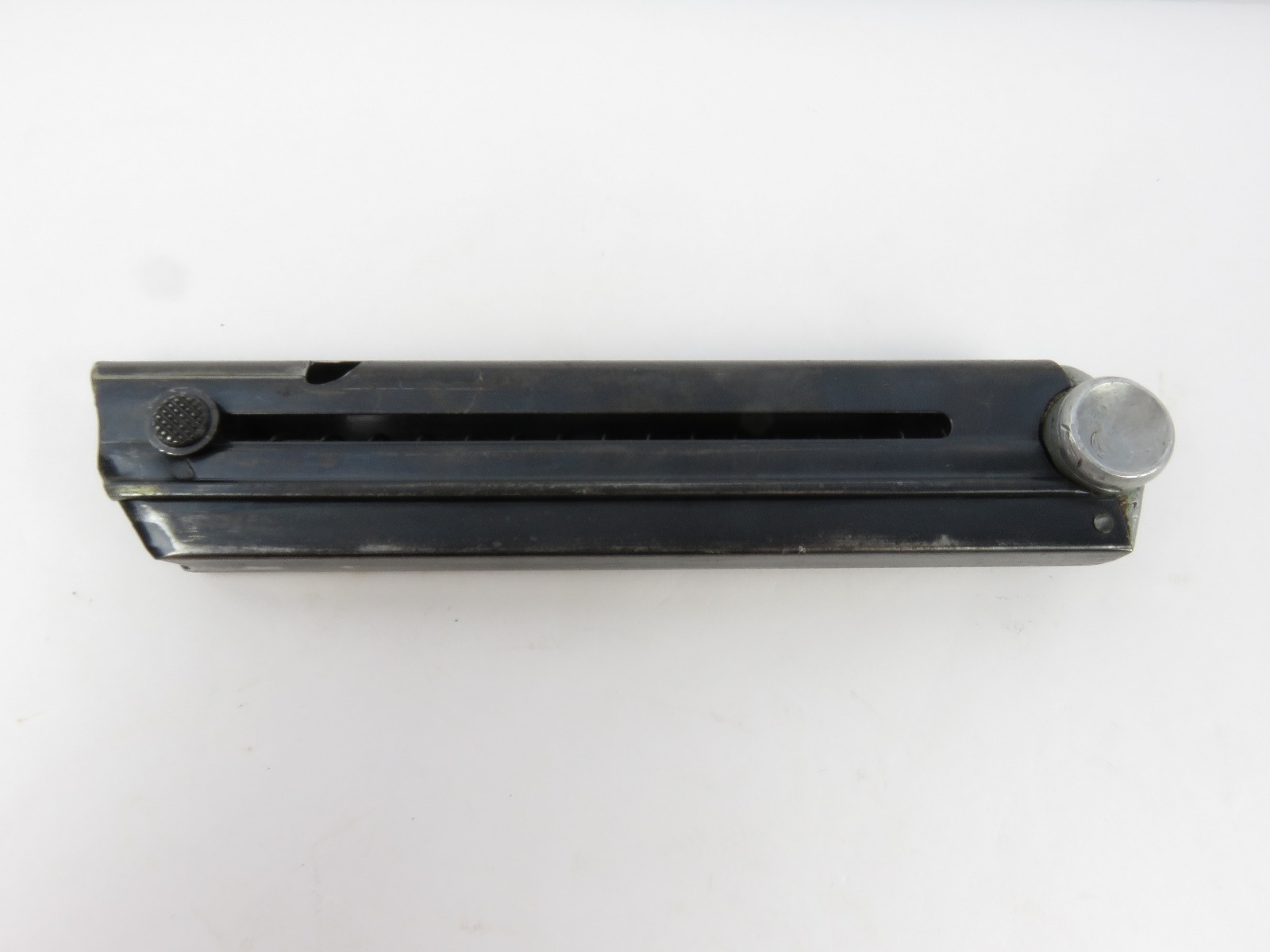 8/18/17 – This is an original WW2 production Mauser Luger magazine. The frame is blued and in good condition with some minor bluing loss. No rust or pitting. The base is aluminum and serial numbered “4447 s”. There is a large style stick winged eagle 63 proof stamp as well. Guaranteed original and fully functional.