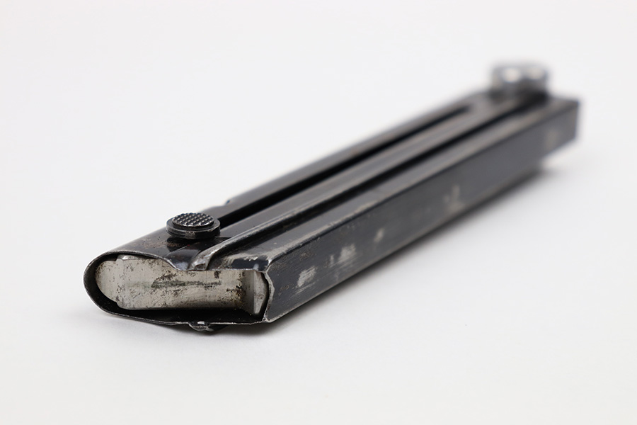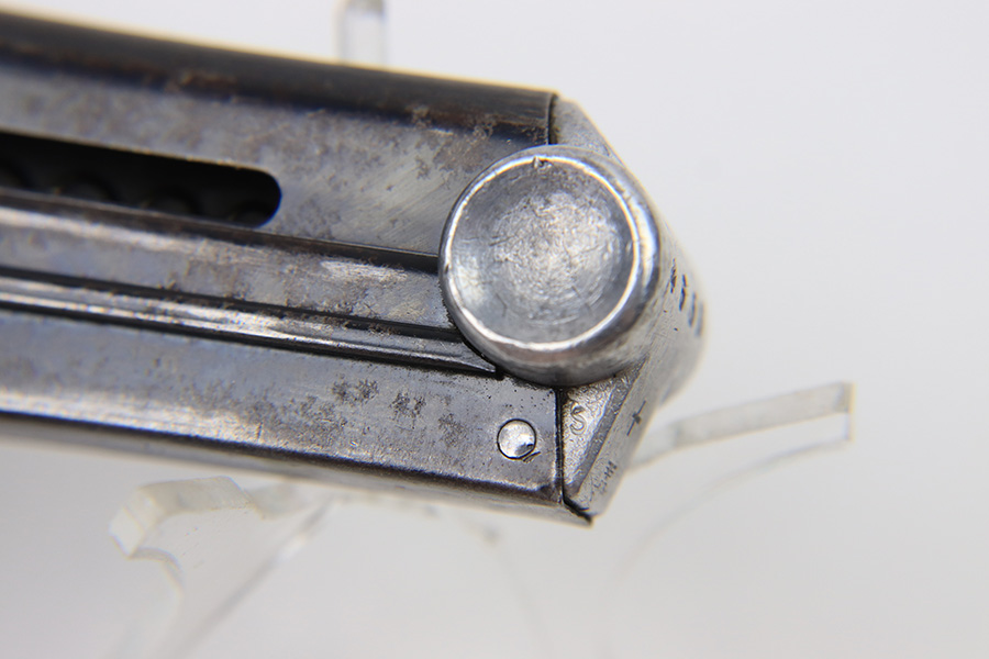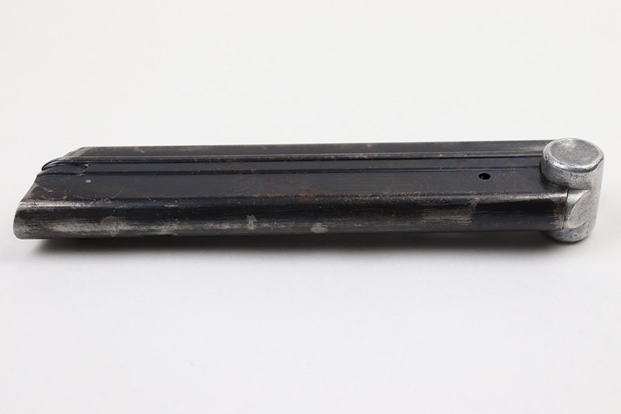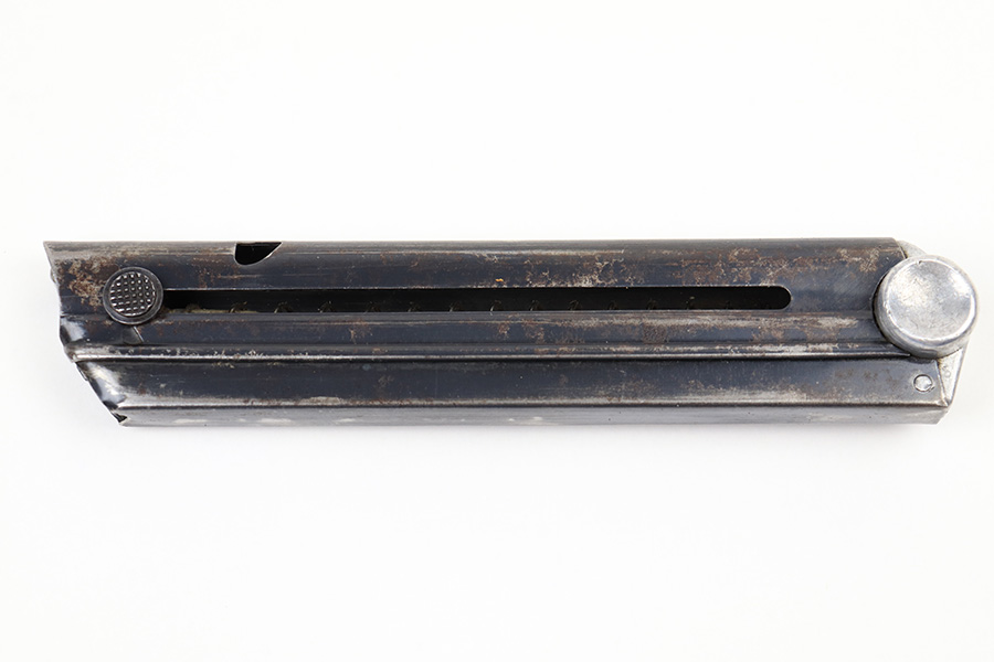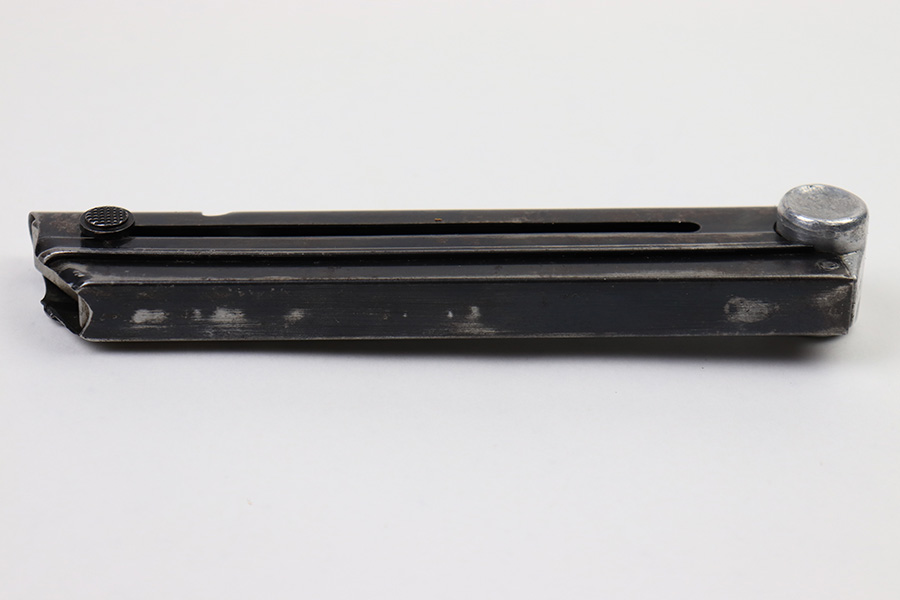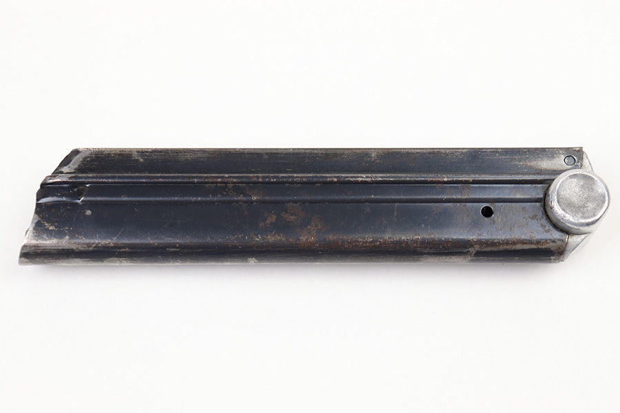 7/1/22 – This is an original Mauser Luger magazine from WW2. The magazine base is aluminum, and serial numbered with a “+” sign and eagle 63 proof stamp. The blued tube has thinning and mild finish loss throughout. The spring is strong and functional.