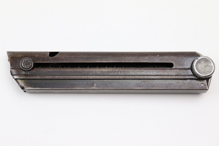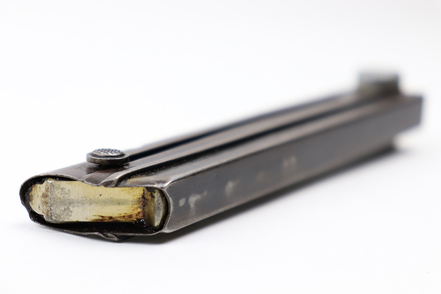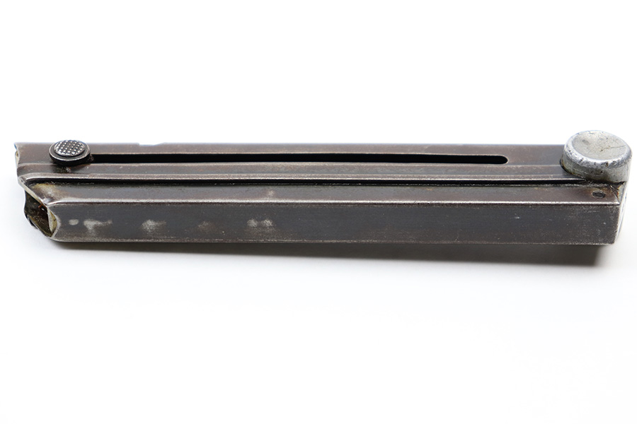 7/6/22 – This is an original Mauser eagle 63 Luger magazine from WW2. The magazine tube has dark patina and surface wear throughout the blued finish. There is a small dent in the tube as well, but this doesn’t affect functionality. The base is aluminum and serial numbered as shown. The spring is strong and functional.