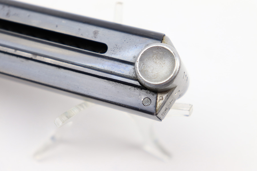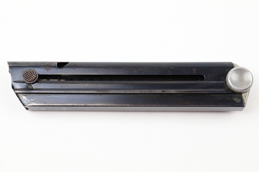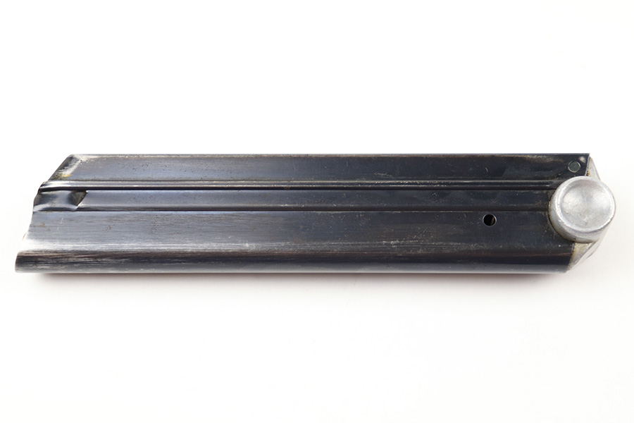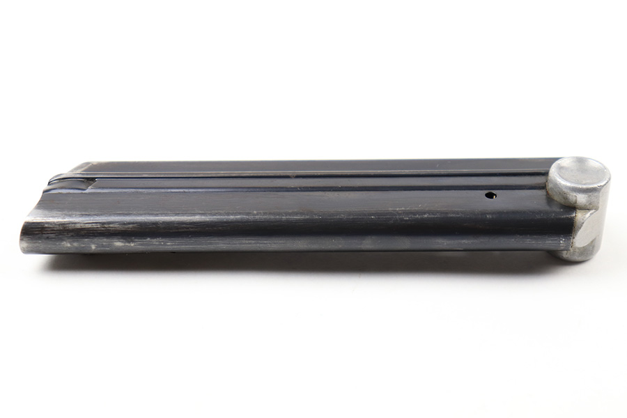 7/15/22 – This is an original Mauser Luger magazine with an eagle 63 military proof stamp on the base. The base is aluminum and serial numbered “106 R” with a “+” sign and proof stamp. The blued tube is in great condition with some mild finish loss and a few spots of patina near the magazine button and notch. The spring is strong and fully functional.