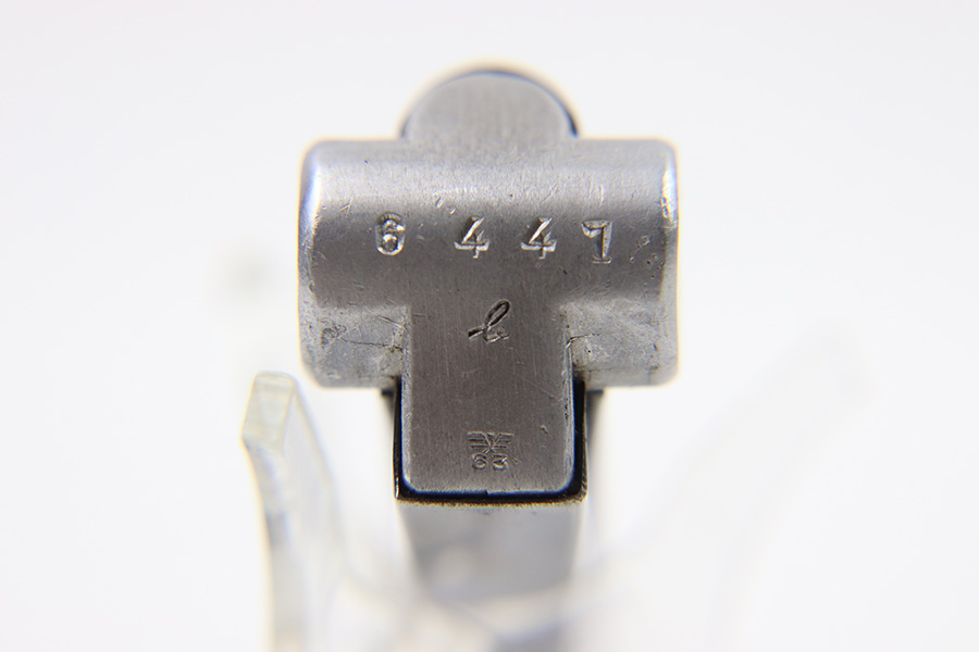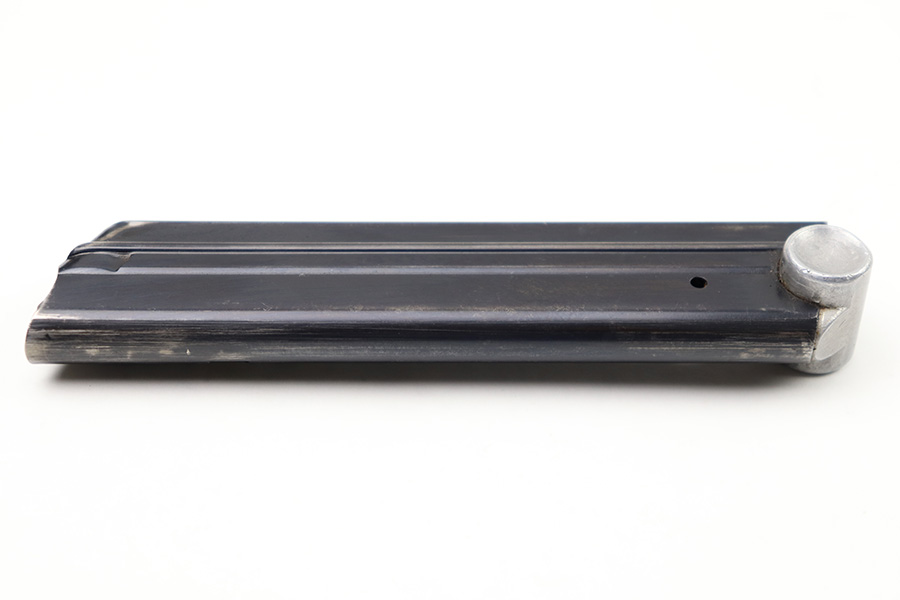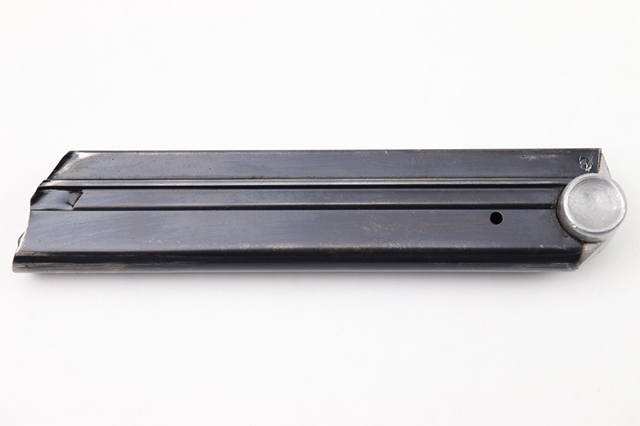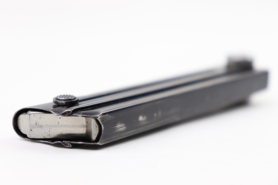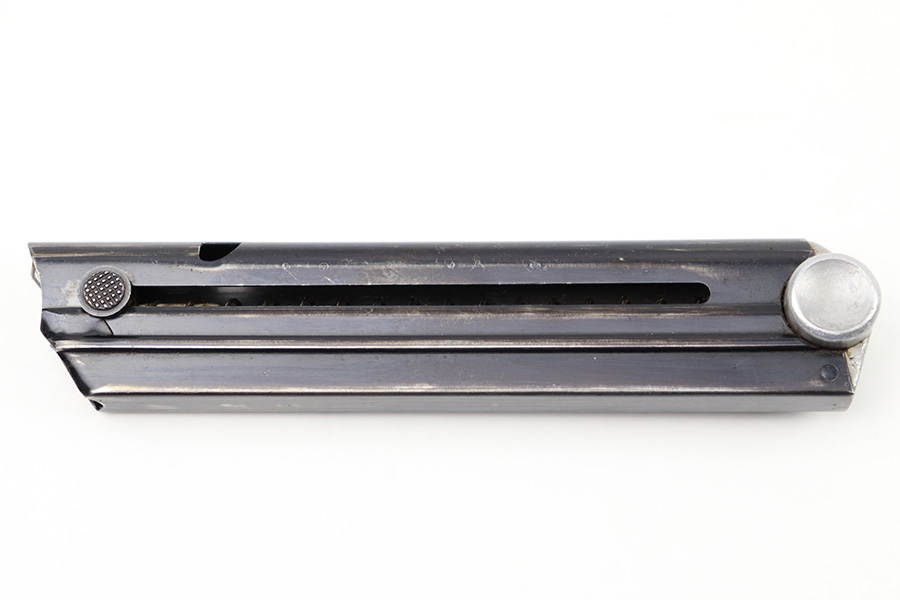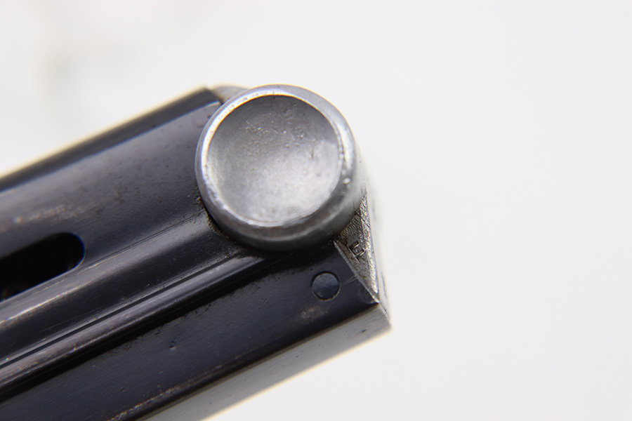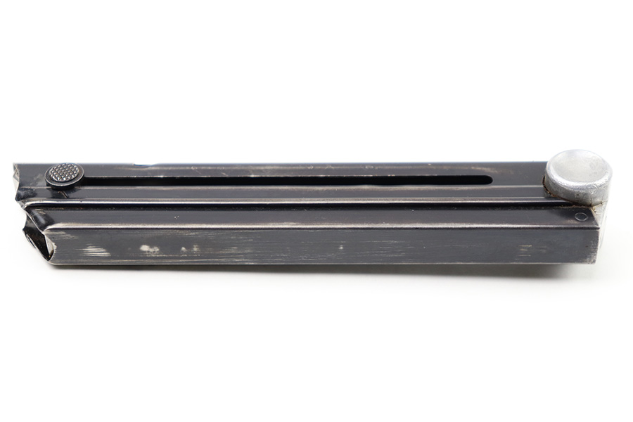 7/26/22 – This is an original Mauser Luger magazine from WW2. The aluminum base is serial numbered 6441b. There’s also an eagle 63 proof stamp on the base. The blued tube is in great condition with only some very mild finish loss. The spring is strong and fully functional.