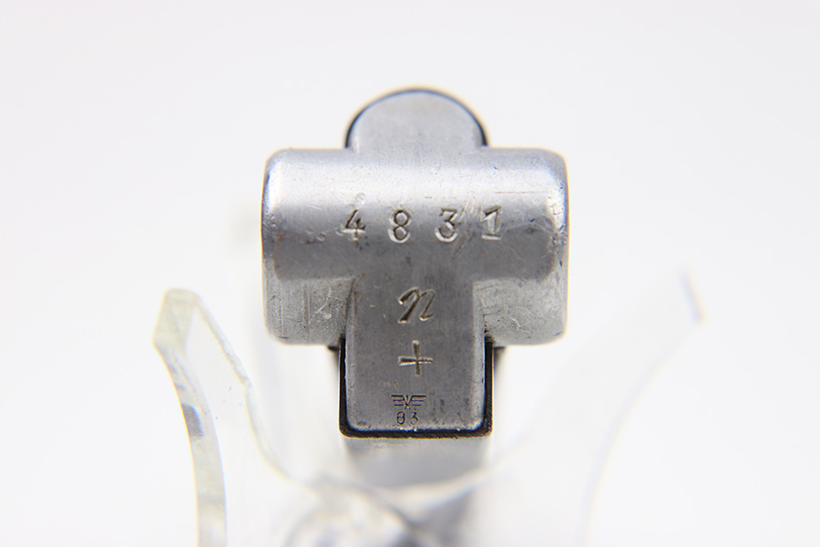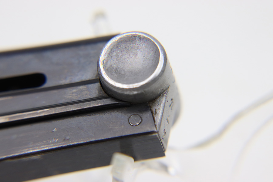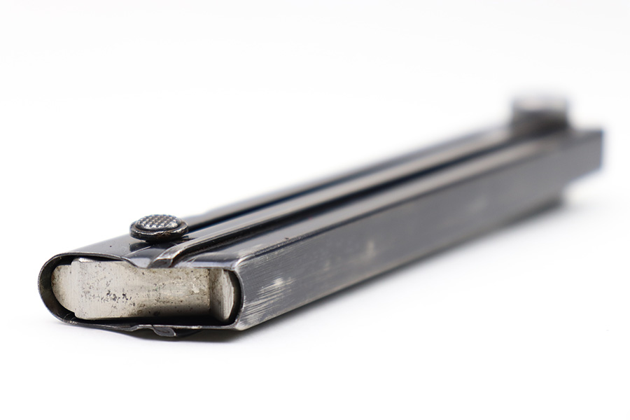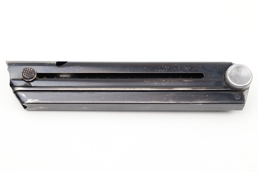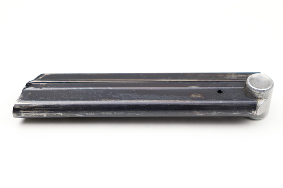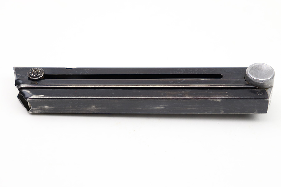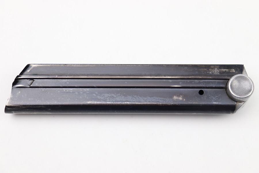 7/26/22 – This is an original WW2 production Mauser luger magazine. The magazine base is serial numbered 4831n. There’s also a plus sign and eagle 63 proof stamp on the base. The blued tube has some mild edge wear and typical surface patina, but the bluing is excellent and there’s no rust or pitting. The spring is strong and fully functional.