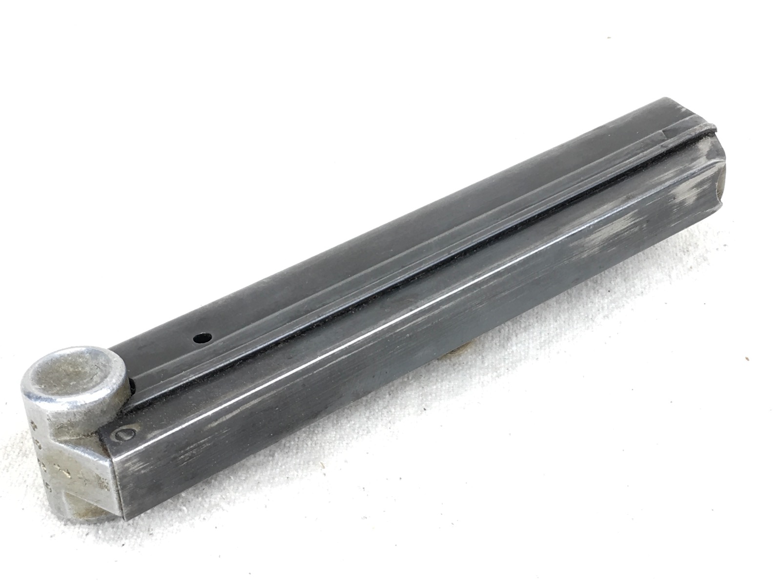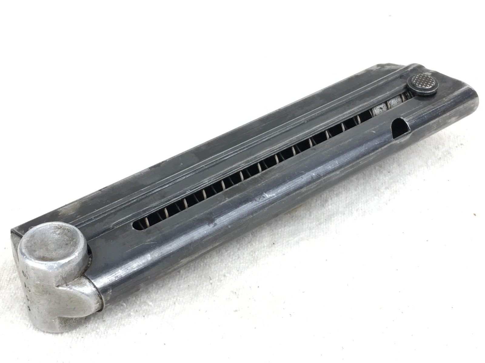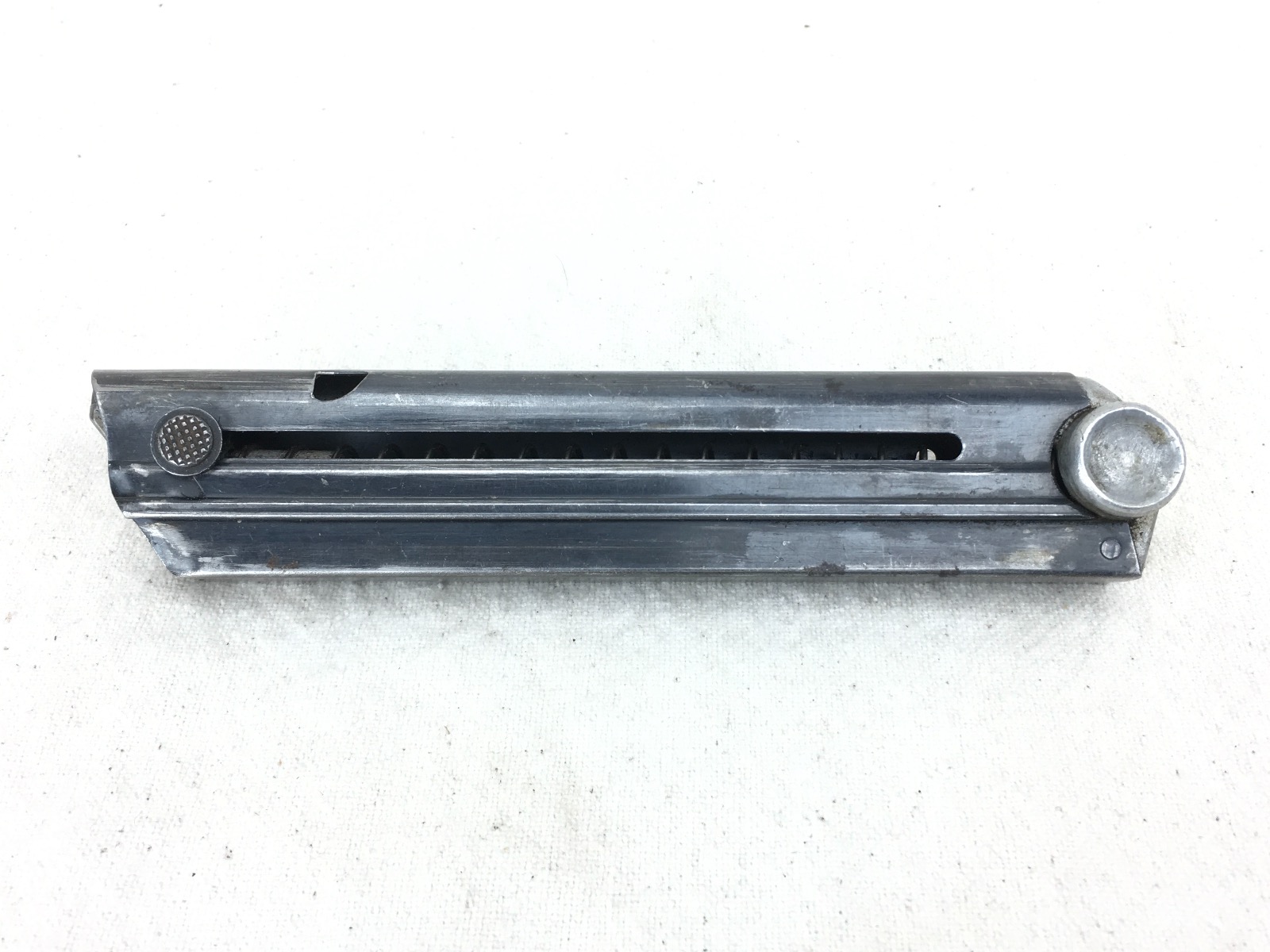 11/27/18 – This is an original WW2 production Mauser Luger magazine. The frame is blued and in great condition with minimal wear. No rust or pitting. The base is aluminum and serial numbered “5234 t”. There is stick winged eagle 63 proof stamp and “+”. Strong, smooth functional spring. Guaranteed original and fully functional.