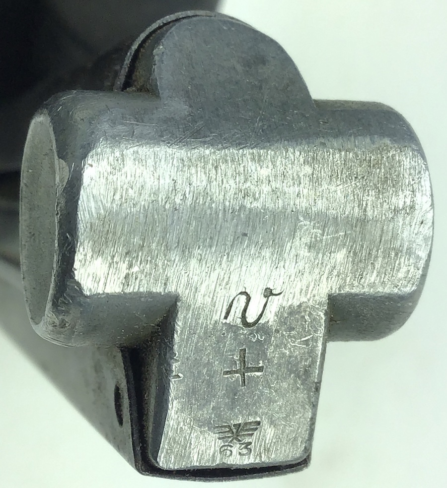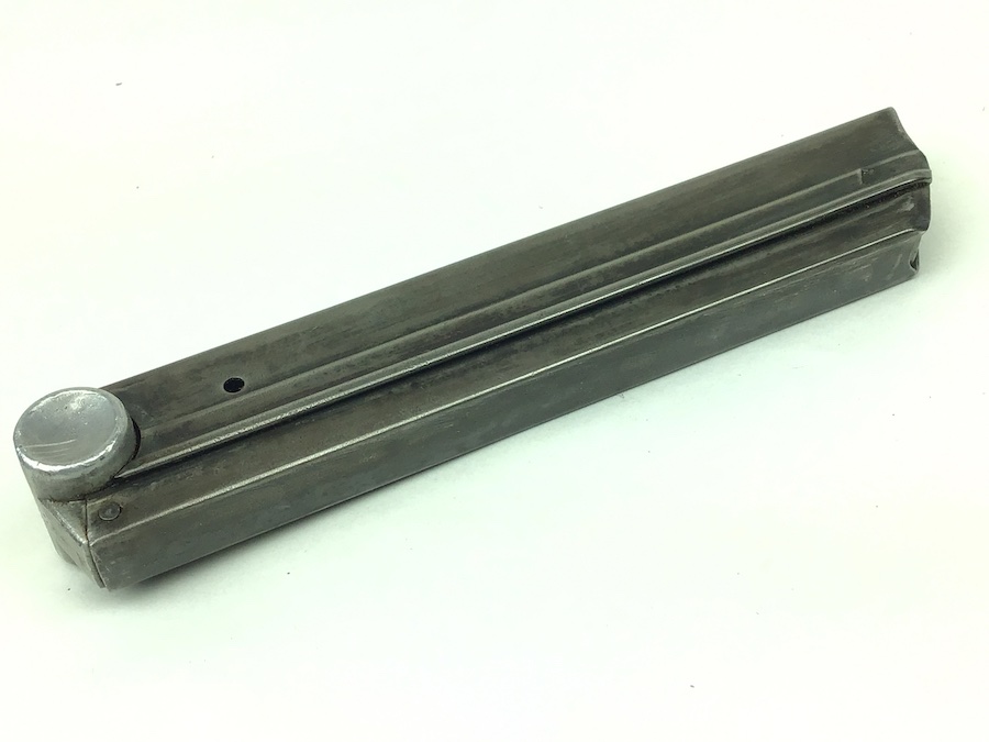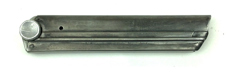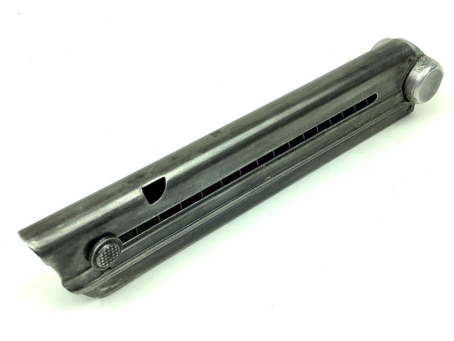 4/28/20 – This is an original Mauser eagle/63 Luger magazine from WW2. The magazine has light discoloration and bluing loss on the tube, as shown in photos. The aluminum base is in great shape, with an eagle/63 military proof, however, the serial number appears to have been ground off. The spring is strong and functional, and the price reflects the overall condition.
