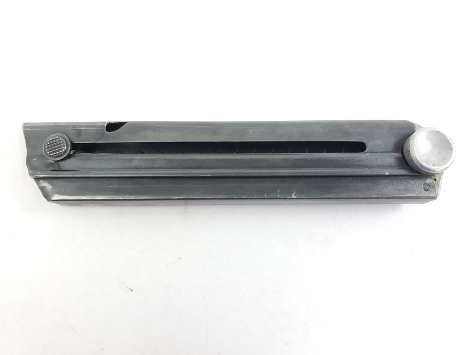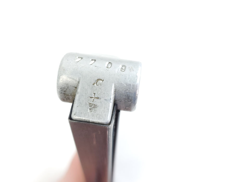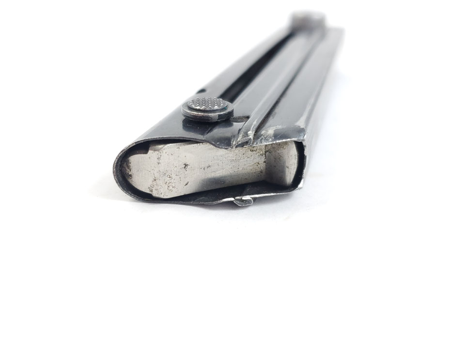 6/2/20 – This is an original eagle 63 luger magazine from WW2. The magazine has a blued body and aluminum base. The base is serial numbered with a “+” sign and Mauser eagle 63 proof stamp. The bluing is excellent with minimal wear. Strong spring is fully functional.