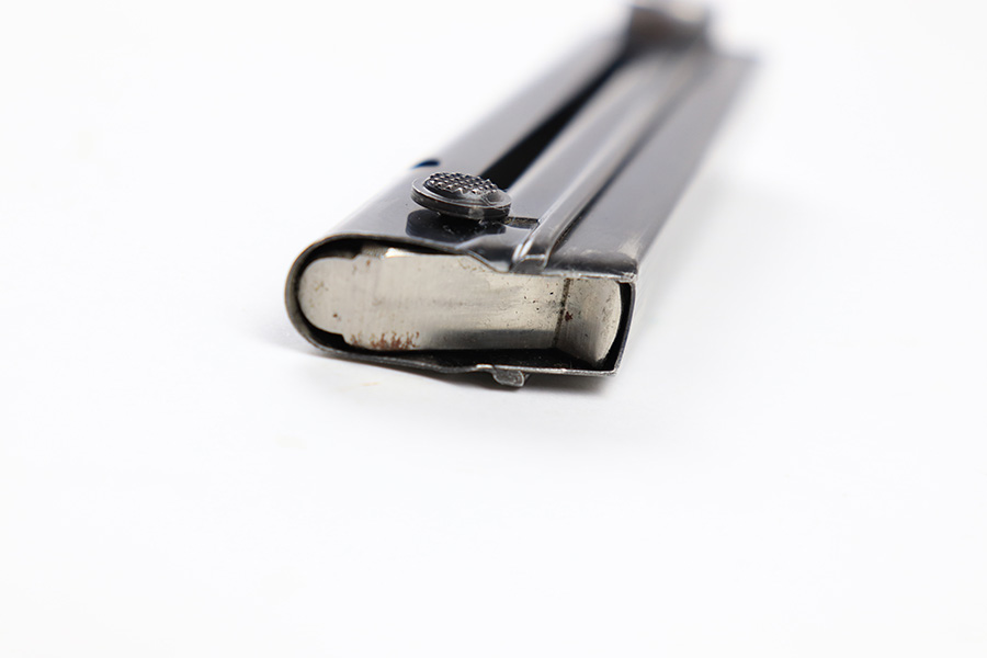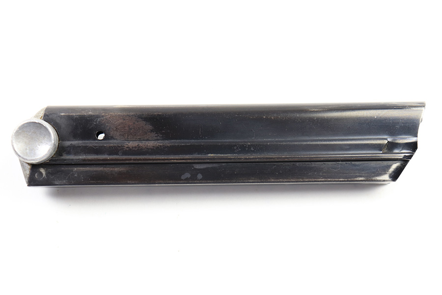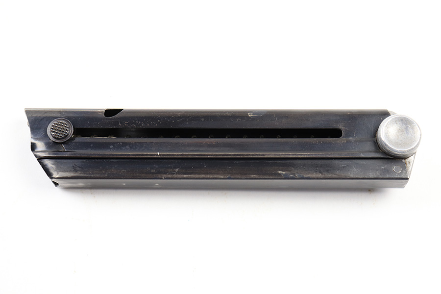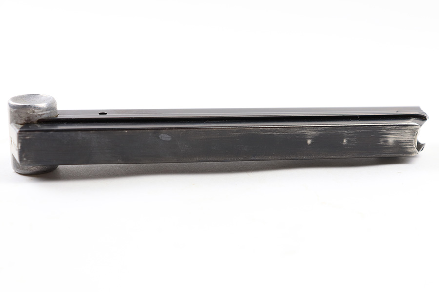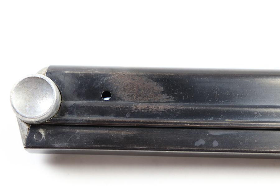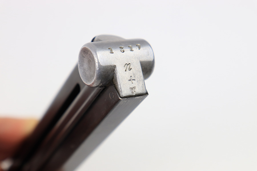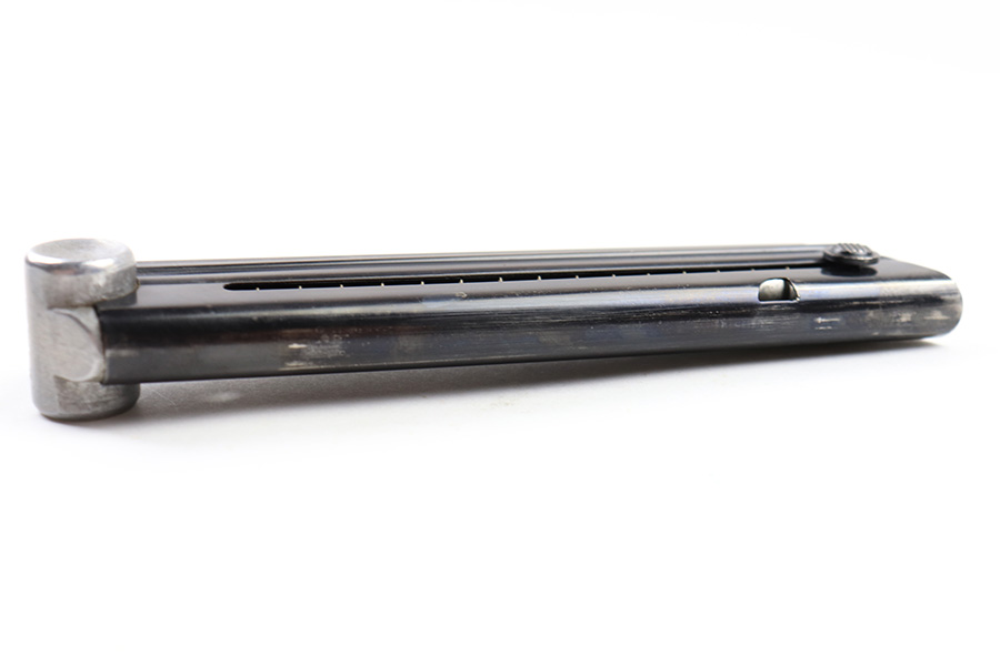 6/30/22 – This is an original Mauser Luger magazine from WW2. The magazine features an aluminum base that’s serial numbered with a “+” sign and small eagle 63 (or eagle 83) proof stamp. The blued tube is in great condition despite some spots of finish loss and a small area of surface patina. The spring is strong and functional .