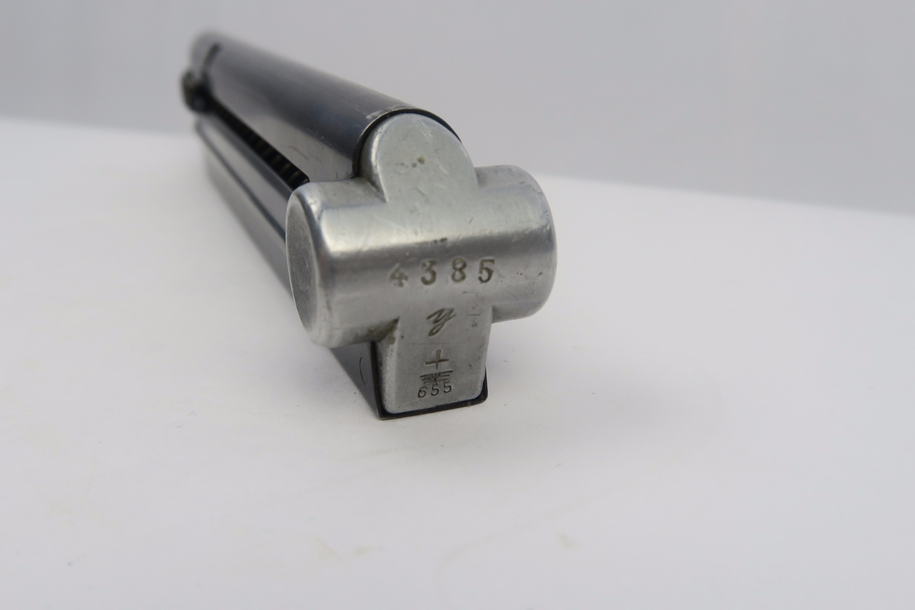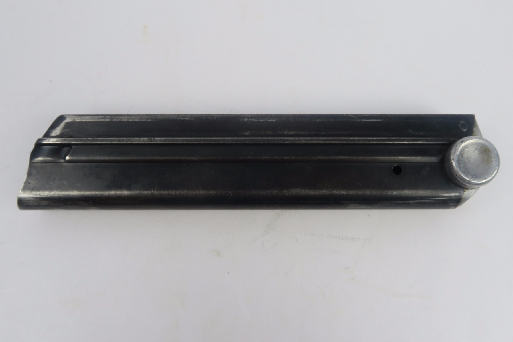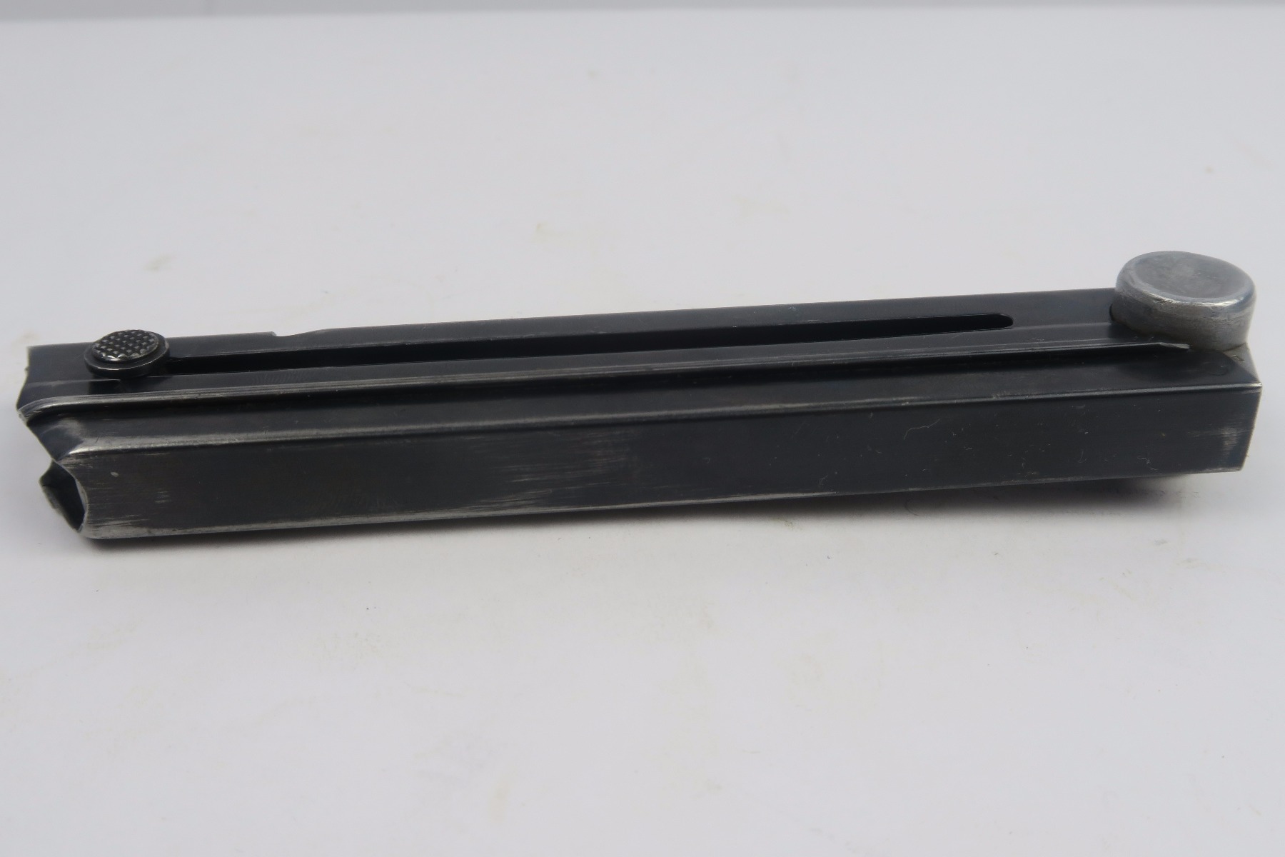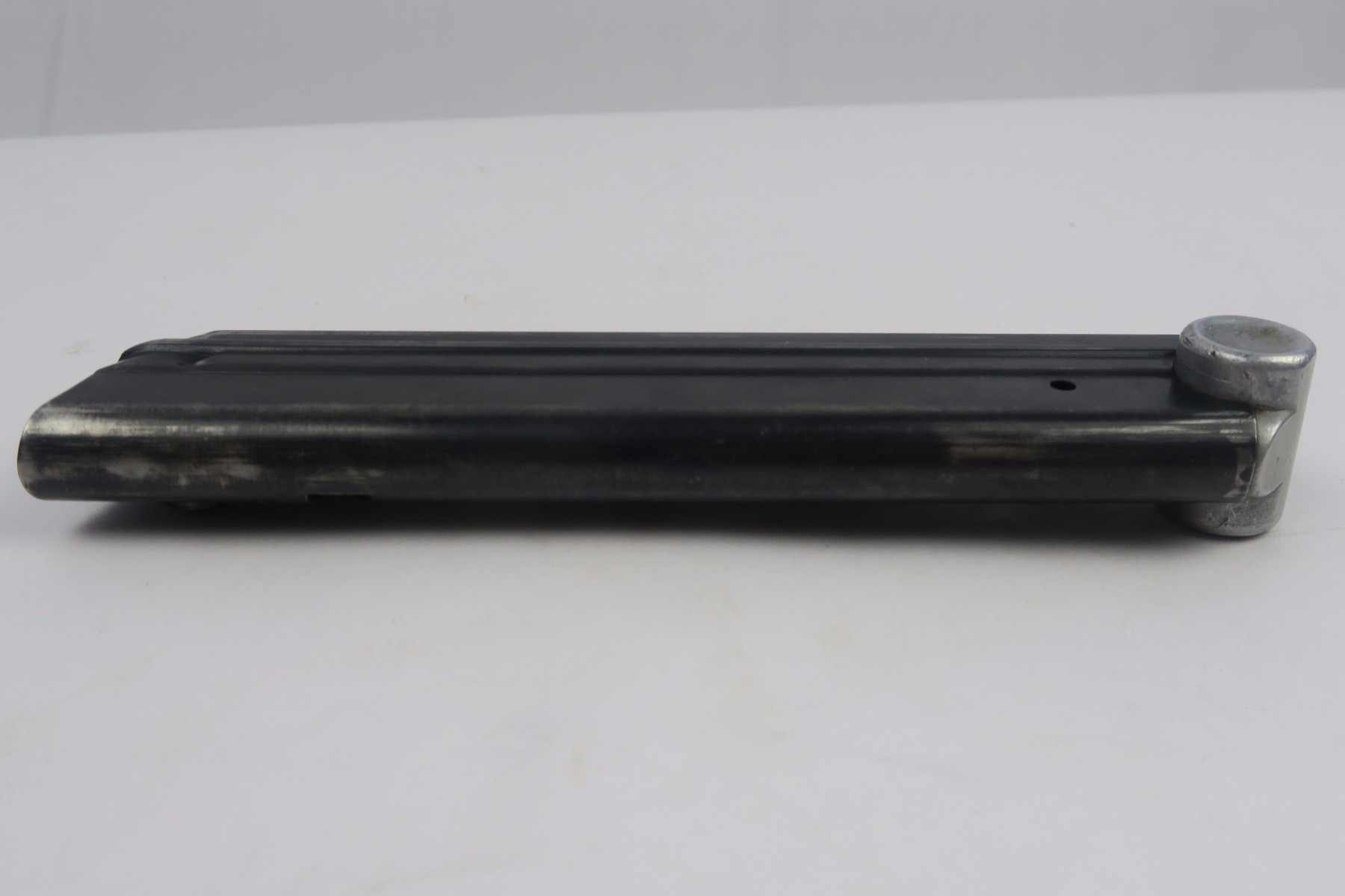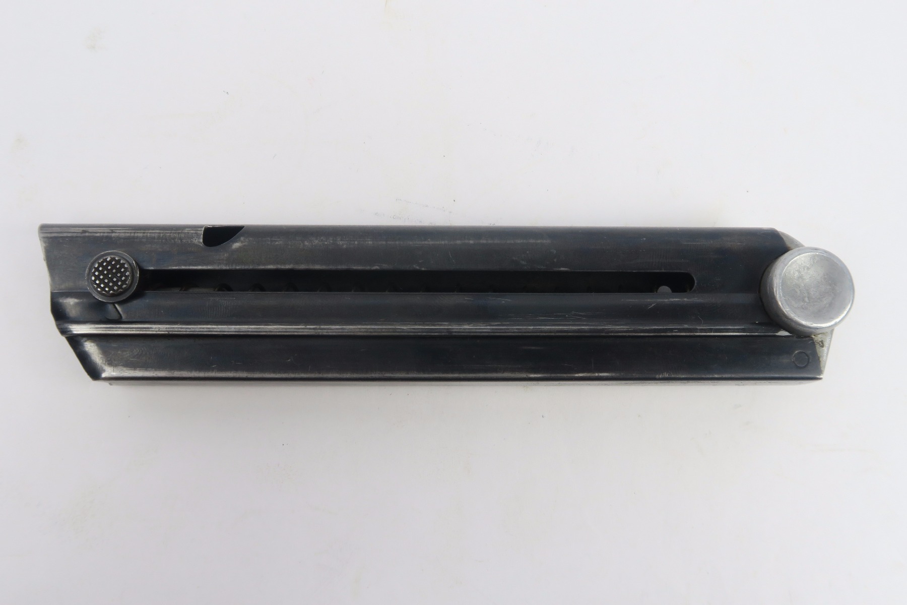 11/30/17 – This is an original Mauser Luger magazine from WW2. The base of the magazine is aluminum and is serial numbered with an eagle/655 proof stamp. These magazines are more scarce than typical eagle/63 proof stamped magazine. The blued frame is excellent with no rust or pitting. The spring is strong and fully functional.