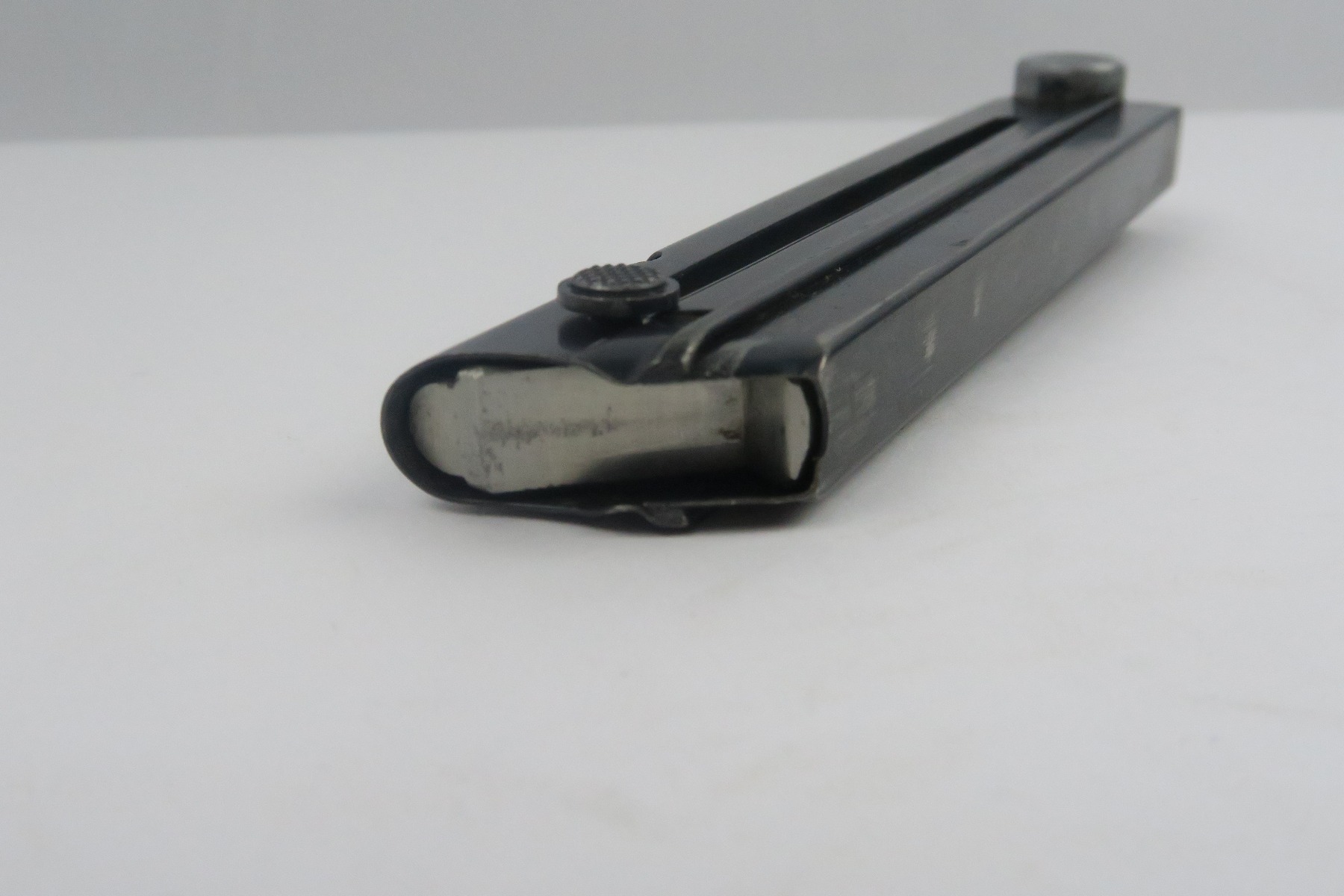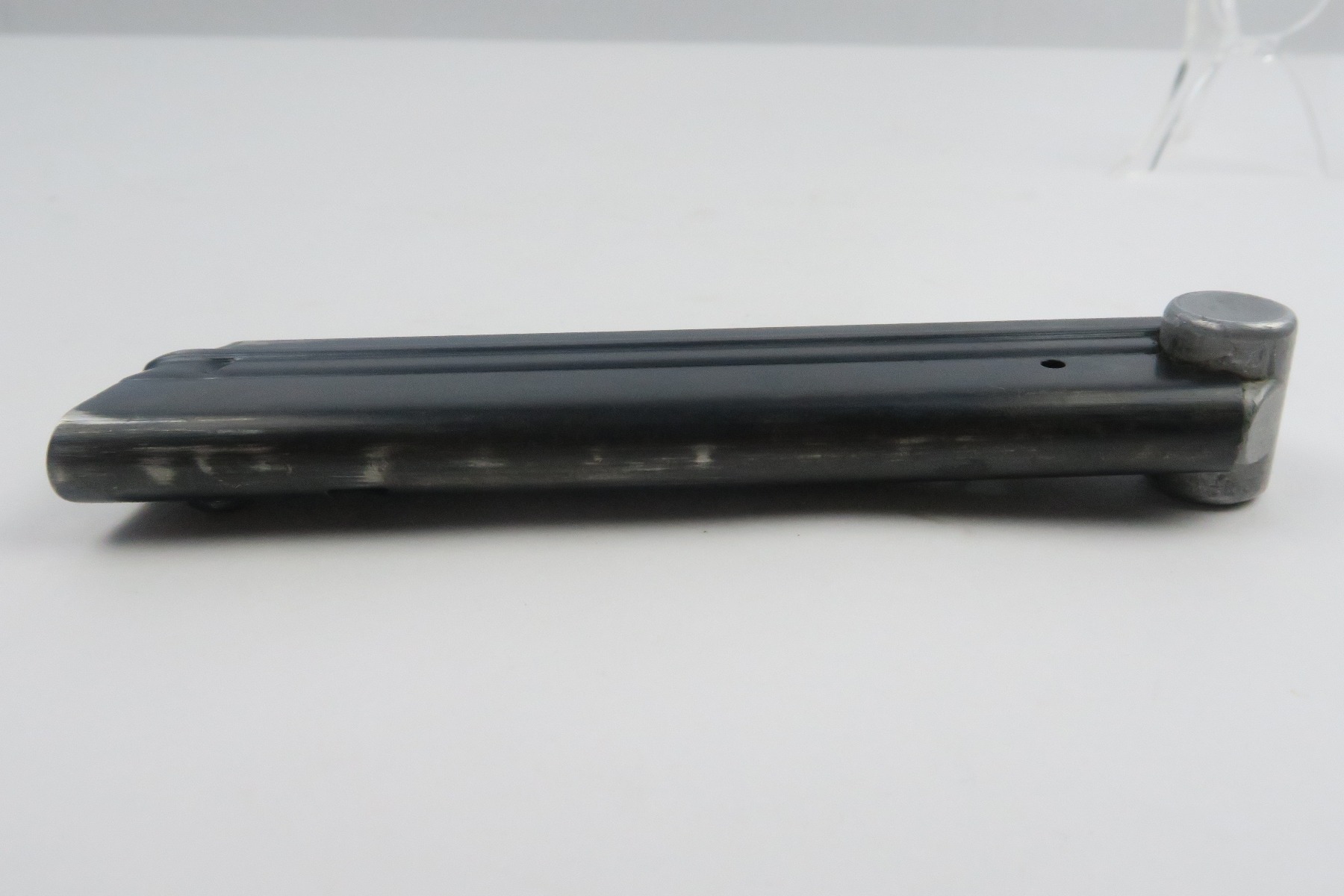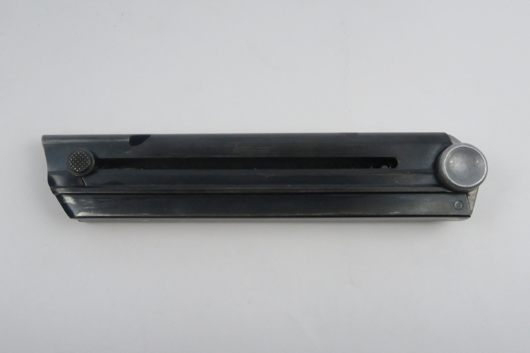 12/27/17 – This is an original eagle 655 proofed Mauser Luger magazine. The magazine has a blued frame and aluminum base. The frame has some light bluing loss, but no rust or pitting. The base is serial numbered with a “z” suffix and a “+” sign. Guaranteed original and fully functional.
