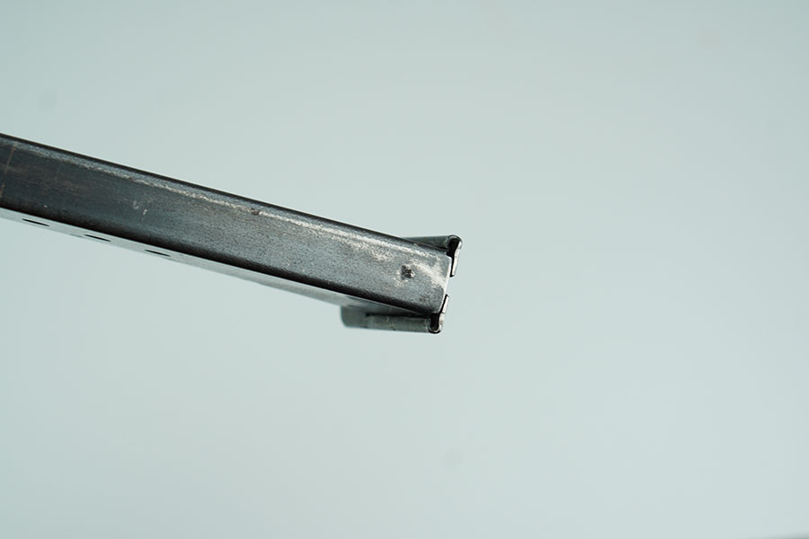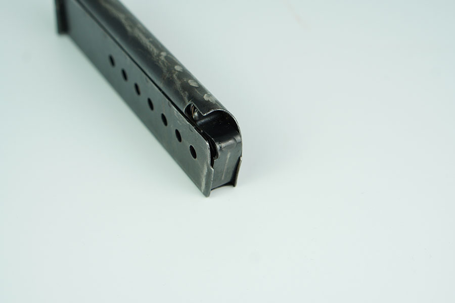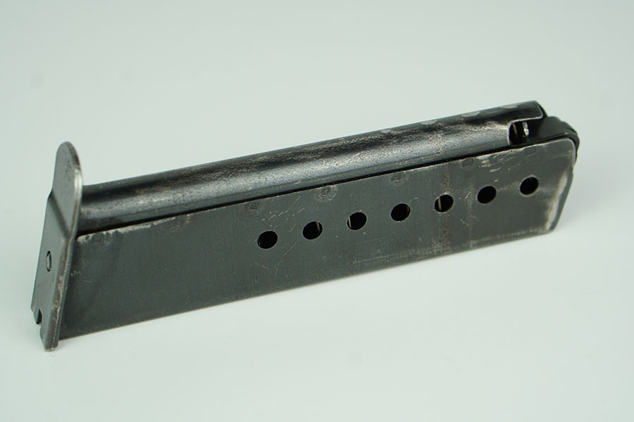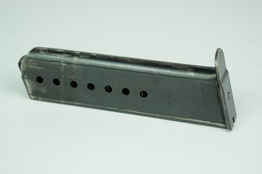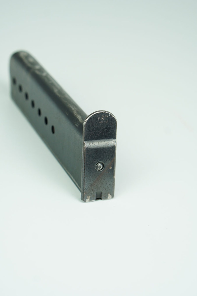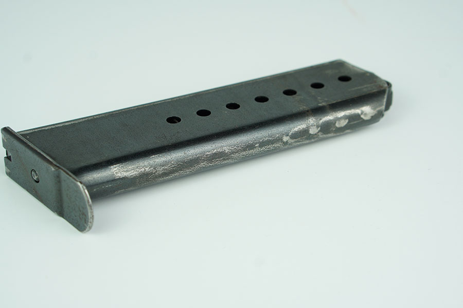 1/23/24 – This is an original WW2 production P.38 magazine. The magazine has no markings or stamps, except for a small eagle/88 military proof stamp which corresponds to the Spreewerk factory. There’s light wear to the bluing throughout, but mainly on the spine and front curved edge of the magazine. Some minor scratches on the top of the base plate of the magazine. Overall a great example. Spring is fully functional.