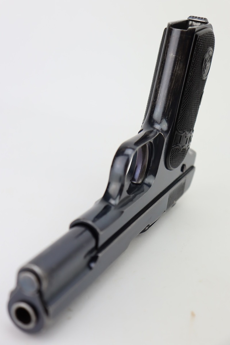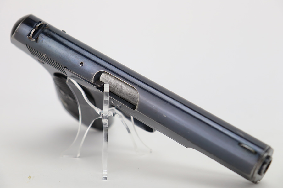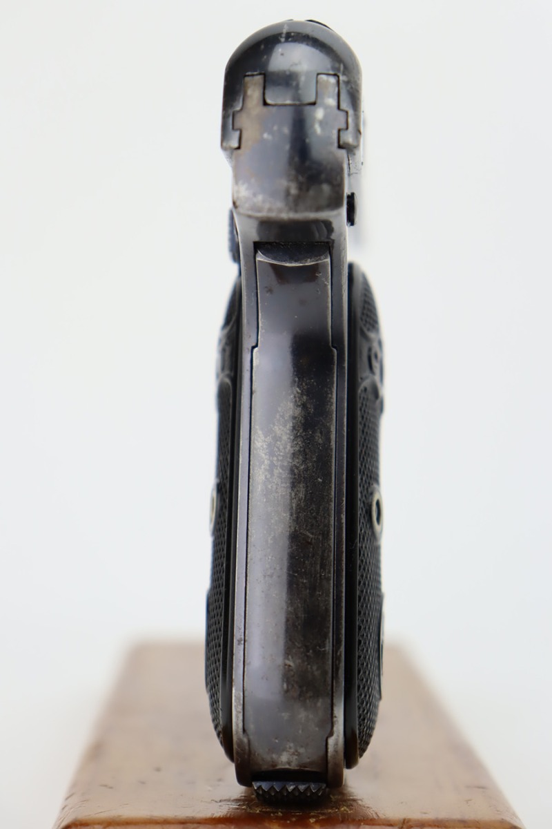 10/11/23 – This is a nice example of a very early Colt Model 1903 Pocket Hammerless, manufactured in 1905 and chambered in .32 ACP. All matching and has retained roughly 85% of its original high polish finish. There are areas of light scratchy wear throughout, concentrated mostly on the grip straps and around the high edges. Some small spots of light oxidation here and there. Fitted with period-correct hard rubber grips and comes with one proper magazine. The bore has good rifling with very light pin-pricking throughout.