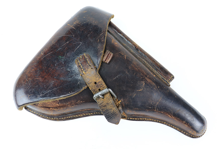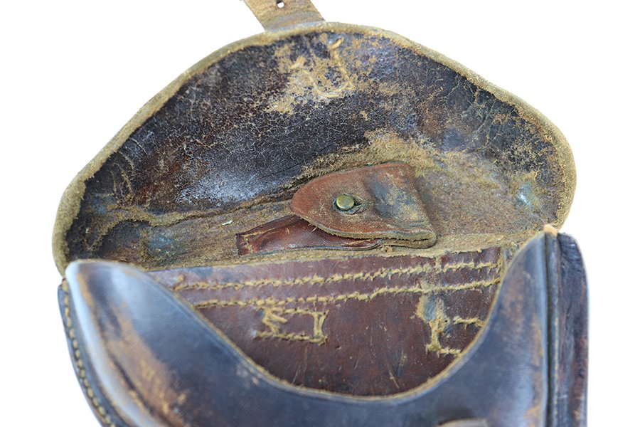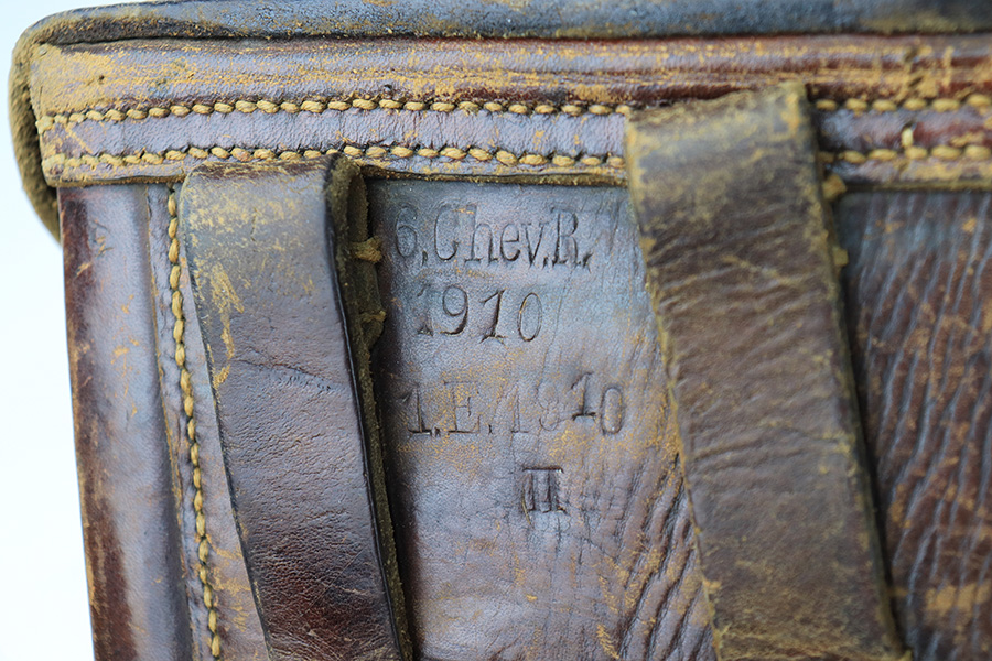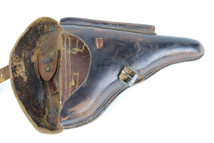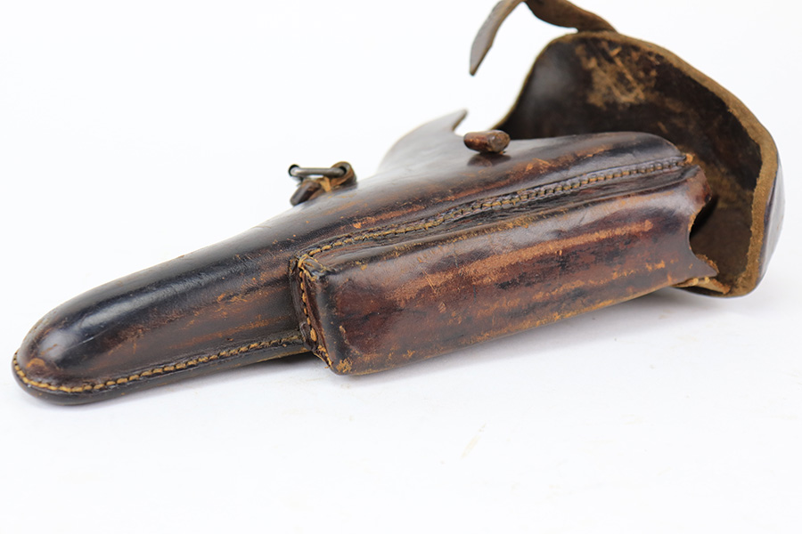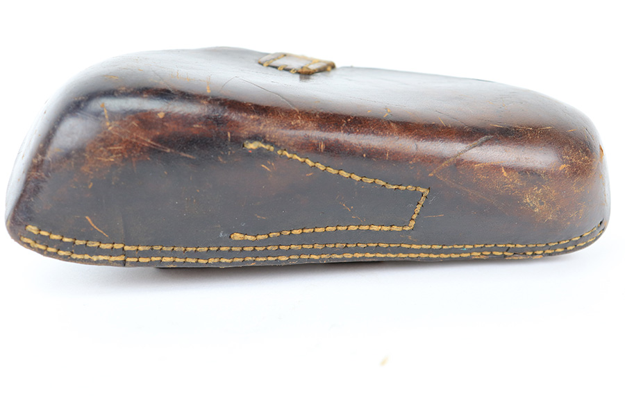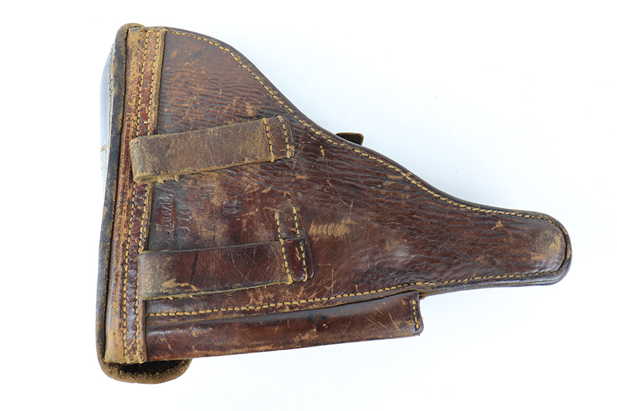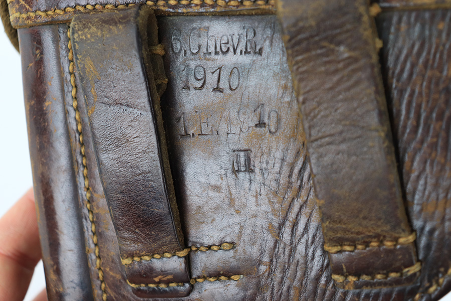 3/18/22 – This is an original, early / pre WW1 era production Luger holster. The holster is dated 1910 on the back leather, and has a few unit / manufacturer stamps as well. There are no other stamps or markings on the leather that we could find. The leather has some surface scuffs and there’s mild wrinkling on the back leather. This is still great condition considering its’ age. Excellent stitching throughout.