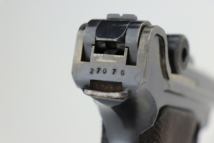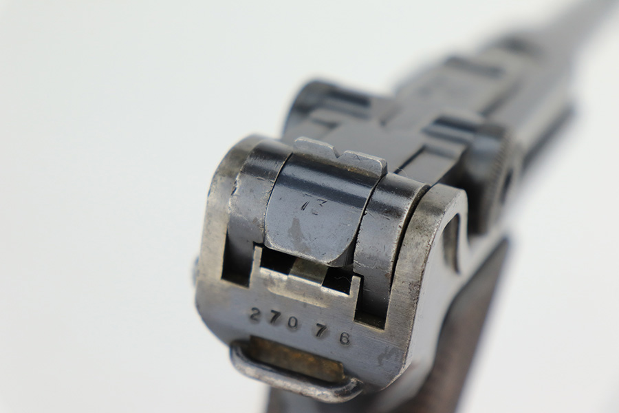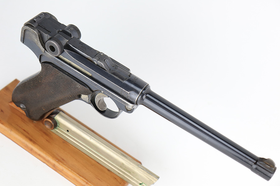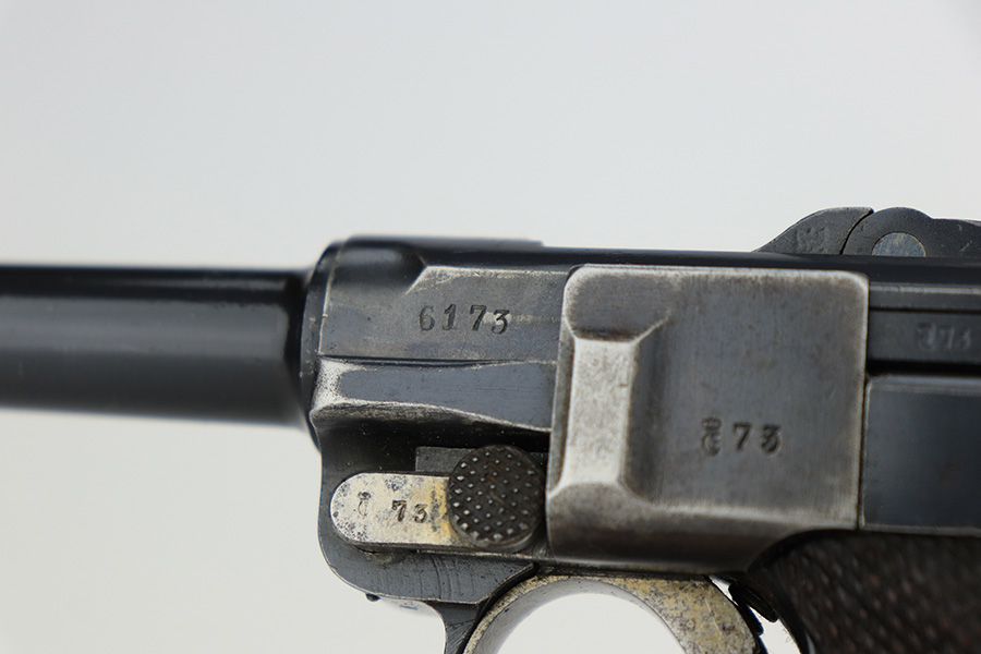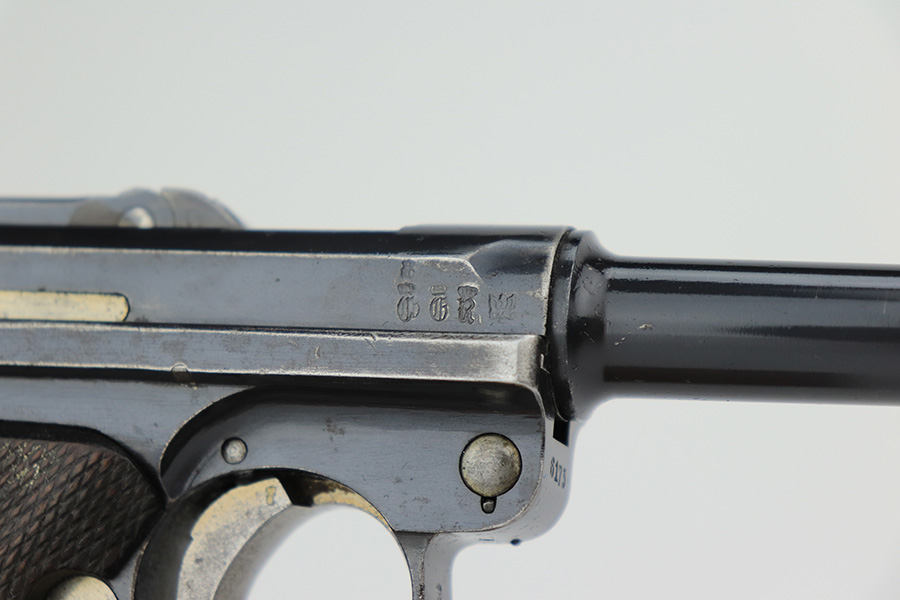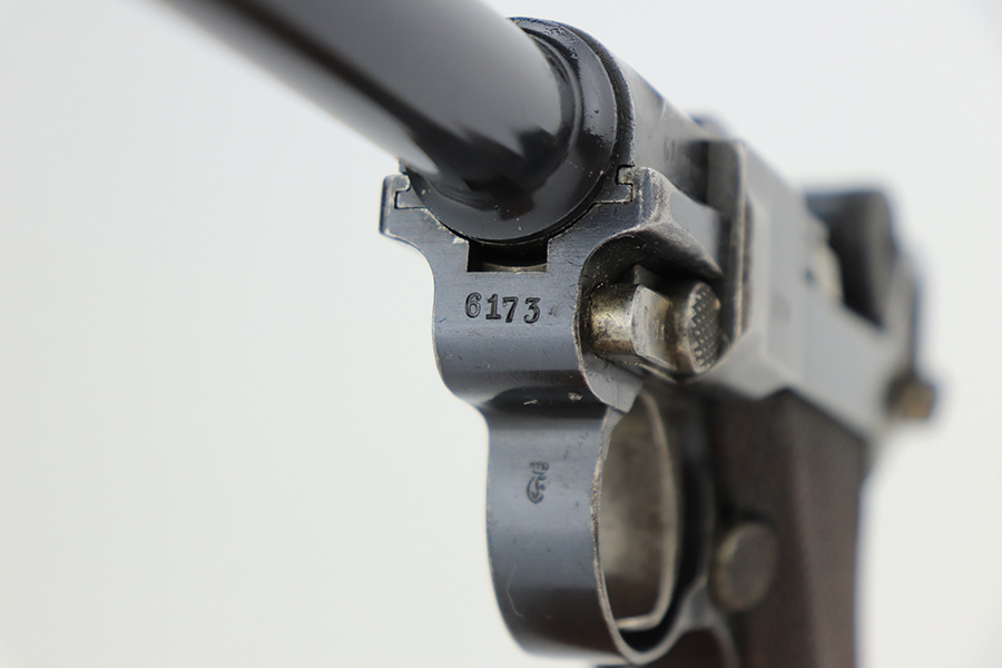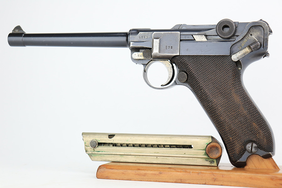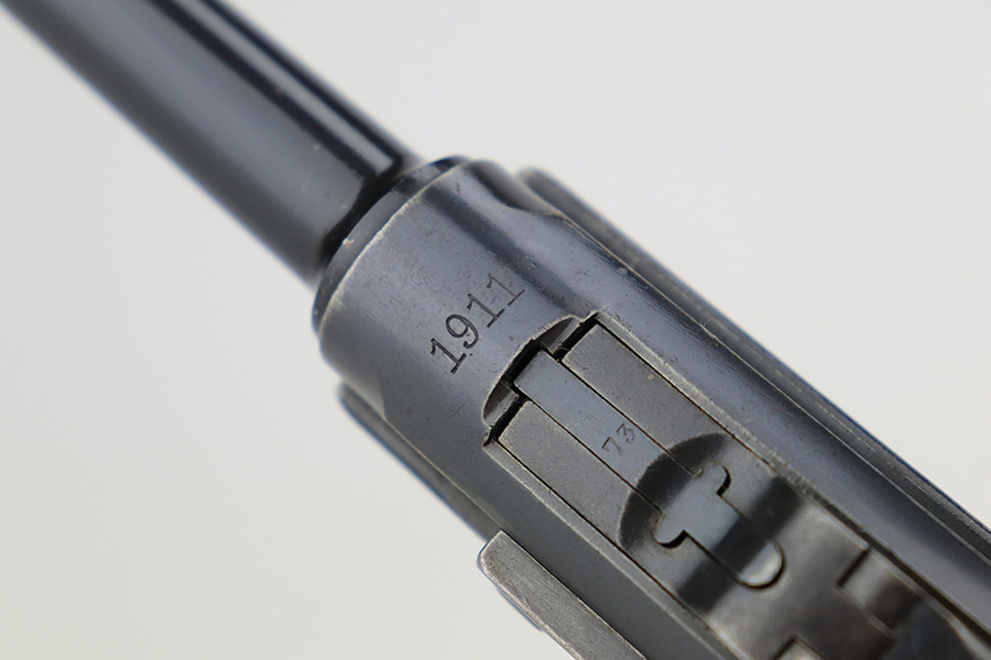 5/17/23 – This is a nice example of an early Erfurt Luger issued to the Imperial German military in 1911. All matching except the barrel, which is a 5.5″ replacement. Imperial military and Erfurt proofs throughout. It has the proper early features such as no stock lug and originally had no hold-open – one has since been added. There is a military regimental marking on the front strap. The gun has retained about 93% of its bluing. The majority of the wear is on the side plate, but there is also minor wear on the high edges. Minor freckling on both grip straps. Fitted with matching-numbered and Imperial-proofed grips – small chip in the upper corner of the left panel. Comes with a period-correct but mismatched Erfurt magazine. The bore is near-mint.