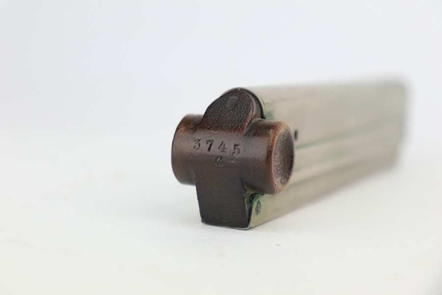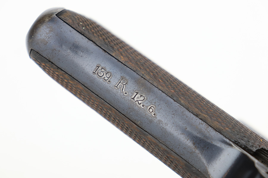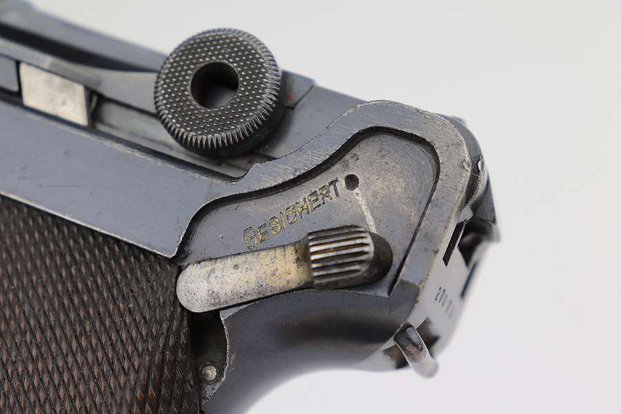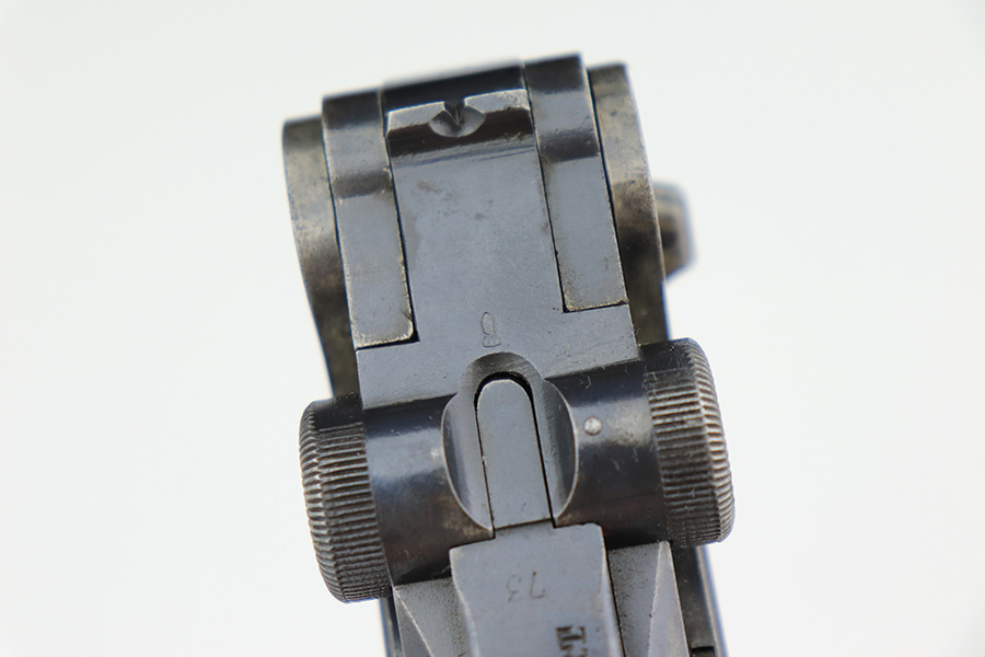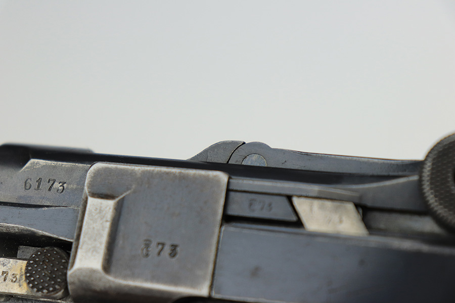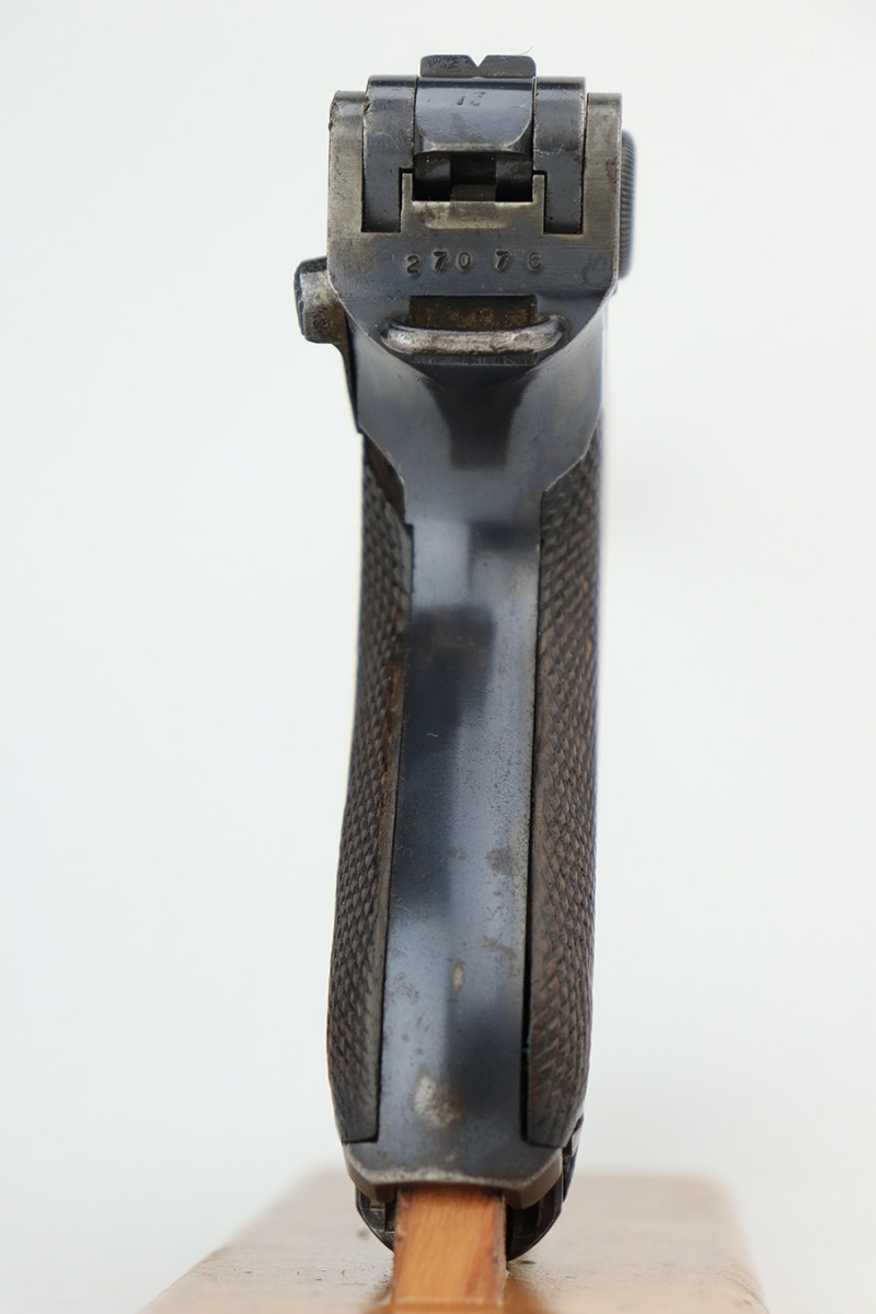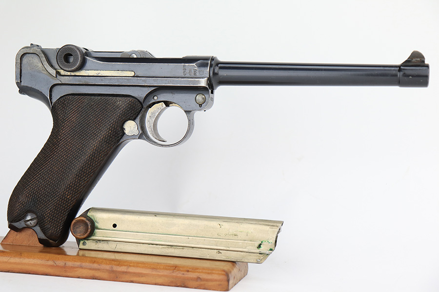 5/17/23 – This is a nice example of an early Erfurt Luger issued to the Imperial German military in 1911. All matching except the barrel, which is a 5.5″ replacement. Imperial military and Erfurt proofs throughout. It has the proper early features such as no stock lug and originally had no hold-open – one has since been added. There is a military regimental marking on the front strap. The gun has retained about 93% of its bluing. The majority of the wear is on the side plate, but there is also minor wear on the high edges. Minor freckling on both grip straps. Fitted with matching-numbered and Imperial-proofed grips – small chip in the upper corner of the left panel. Comes with a period-correct but mismatched Erfurt magazine. The bore is near-mint.