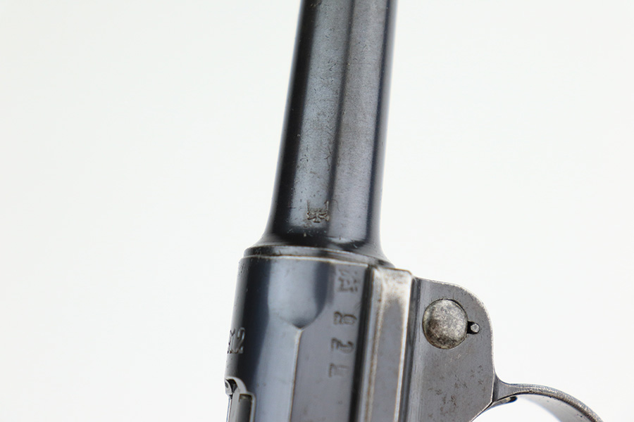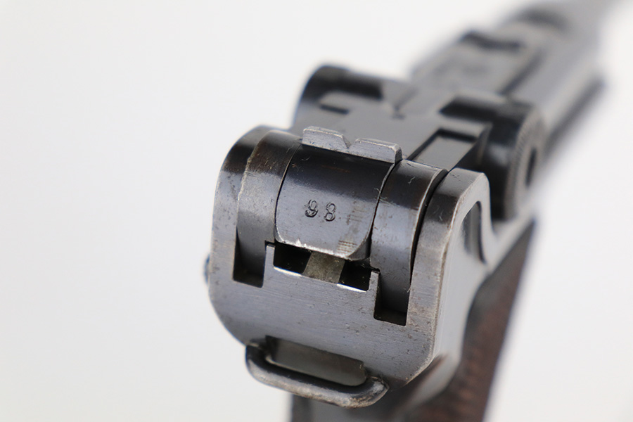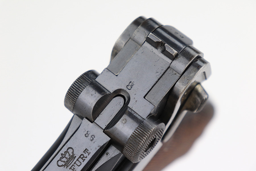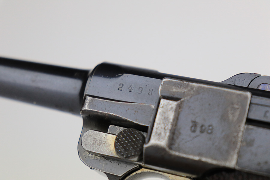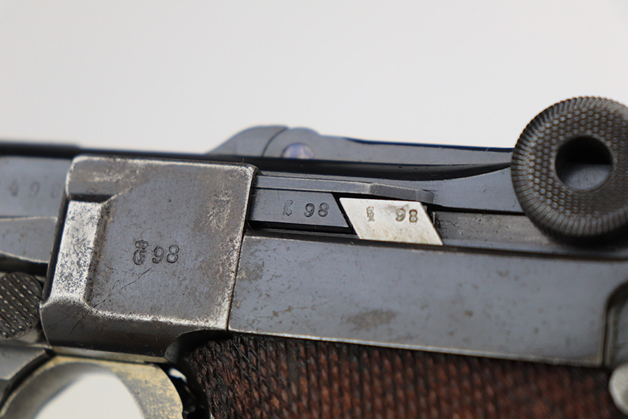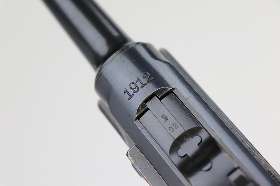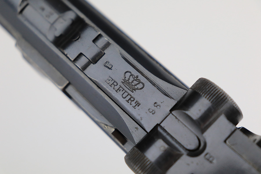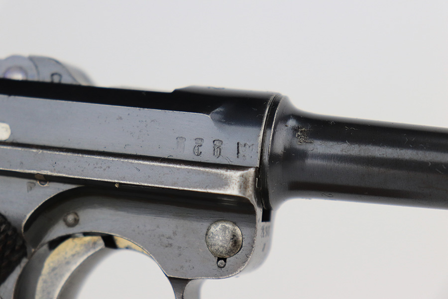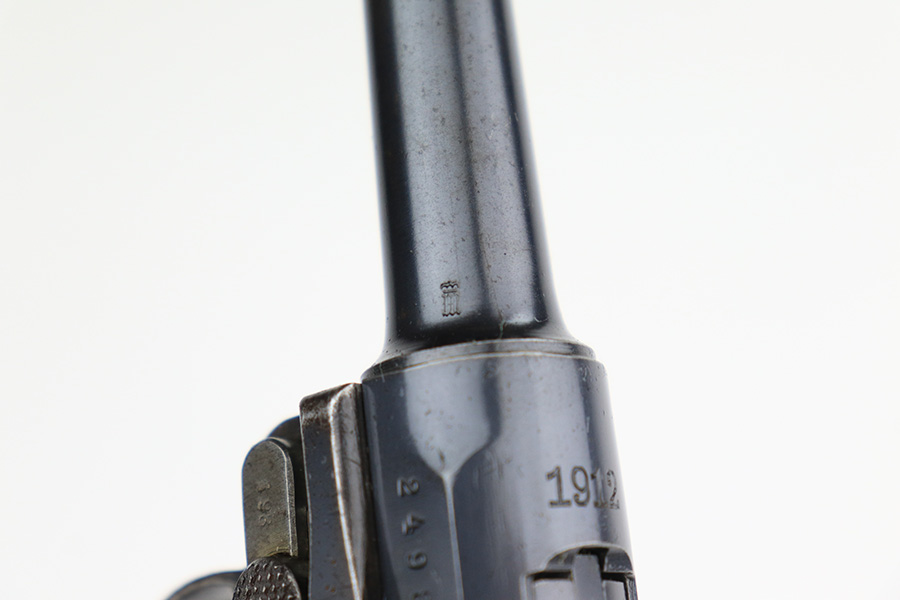 6/1/23 – This is a nice example of an early Erfurt Luger issued to the Imperial German military in 1912. It is all matching, has the proper Imperial proofs, and has Erfurt proofs throughout. It has the proper early features: no stock lug and originally had no hold-open (one has been added). The gun itself has retained about 92% of its original finish with areas of wear around the muzzle, on the side plate, and on the very front edges of the side rails. Some light spotty wear on the front strap. While there isn’t a ton of actual finish loss, there is dulling/light brown patina on the grip straps, some light spotty oxidation here and there, and some areas of minor pin-pricking, most noticeable on the side plate and on the barrel. Fitted with very nice matching-numbered wood grips. Comes with a mismatched magazine that has noticeable chipping in the wood base. The bore has good rifling, but there is very minor pin-pricking throughout.