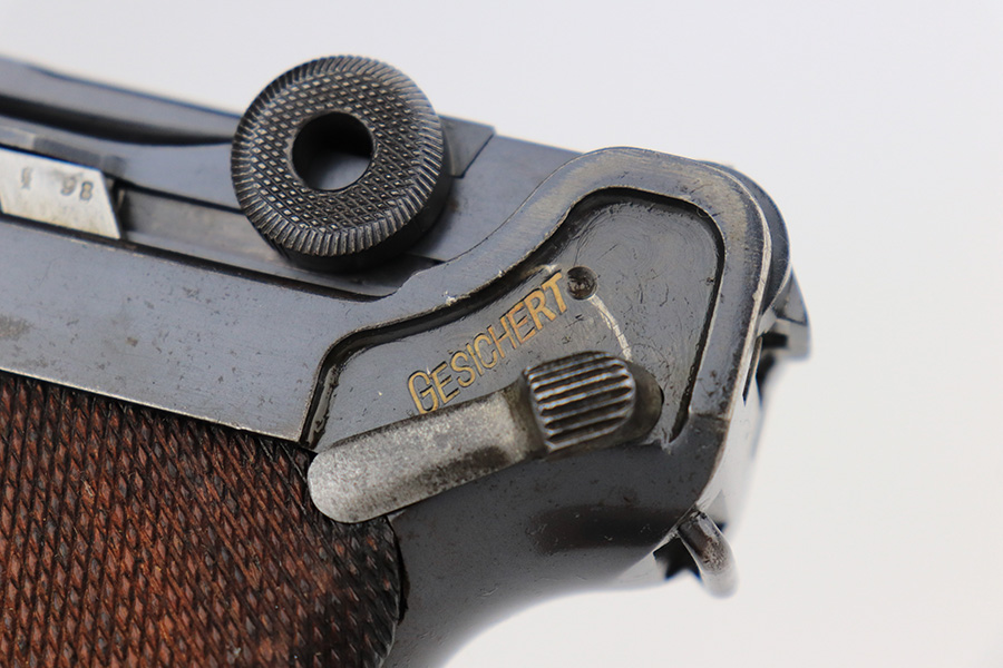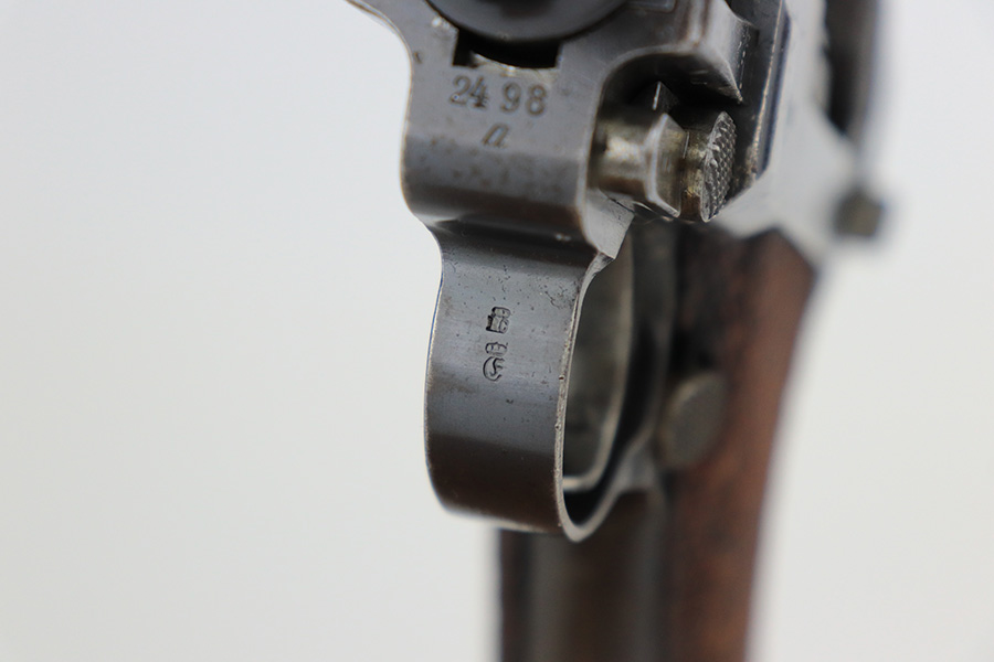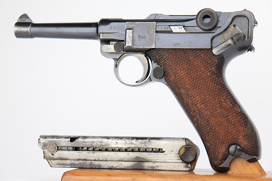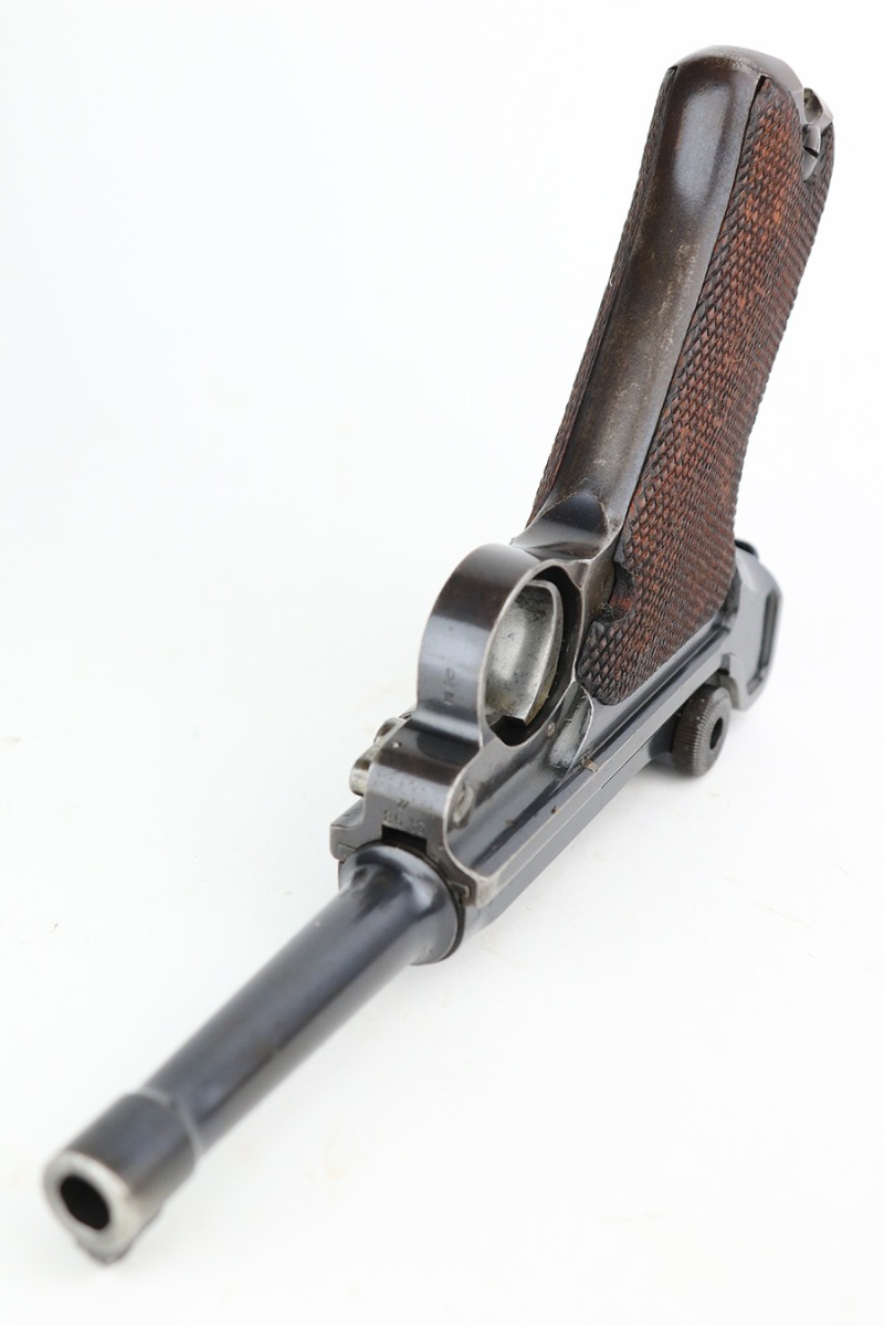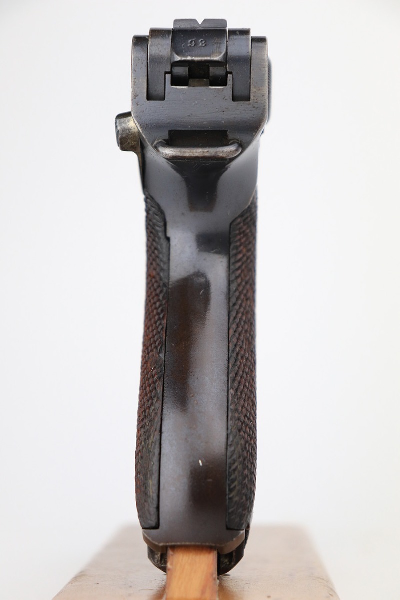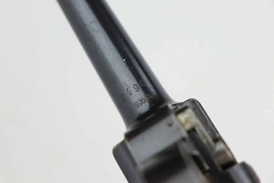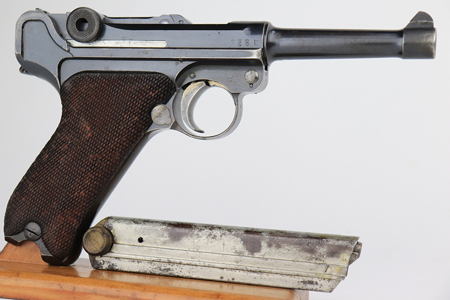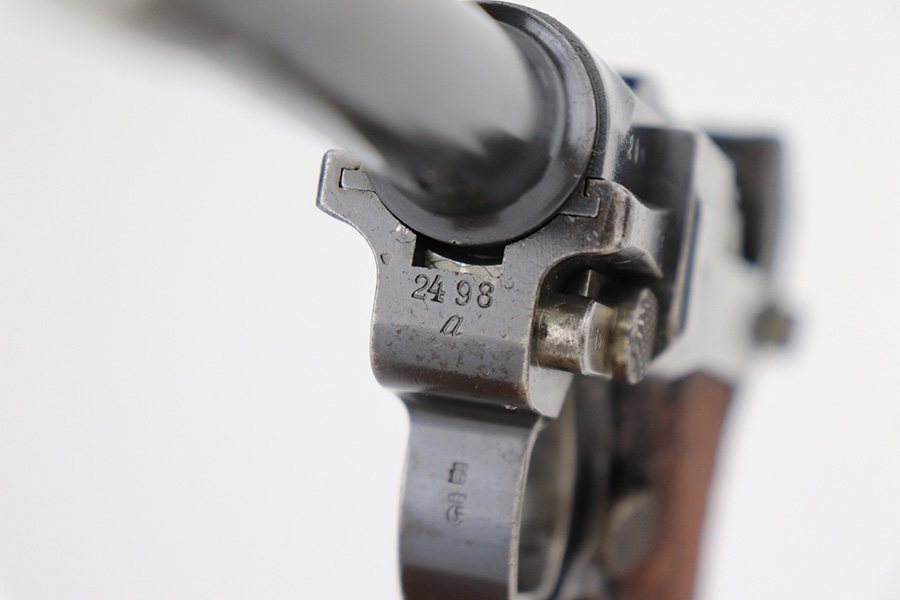 6/1/23 – This is a nice example of an early Erfurt Luger issued to the Imperial German military in 1912. It is all matching, has the proper Imperial proofs, and has Erfurt proofs throughout. It has the proper early features: no stock lug and originally had no hold-open (one has been added). The gun itself has retained about 92% of its original finish with areas of wear around the muzzle, on the side plate, and on the very front edges of the side rails. Some light spotty wear on the front strap. While there isn’t a ton of actual finish loss, there is dulling/light brown patina on the grip straps, some light spotty oxidation here and there, and some areas of minor pin-pricking, most noticeable on the side plate and on the barrel. Fitted with very nice matching-numbered wood grips. Comes with a mismatched magazine that has noticeable chipping in the wood base. The bore has good rifling, but there is very minor pin-pricking throughout.