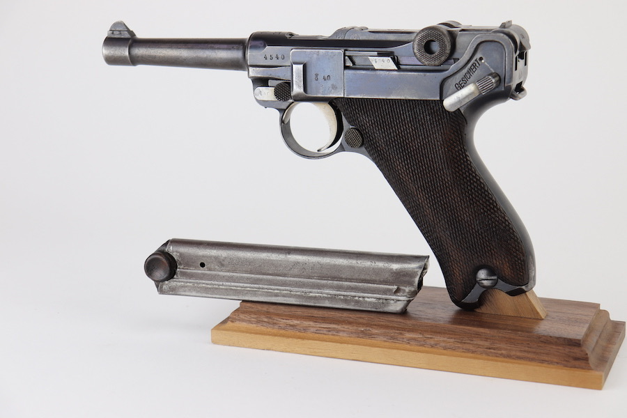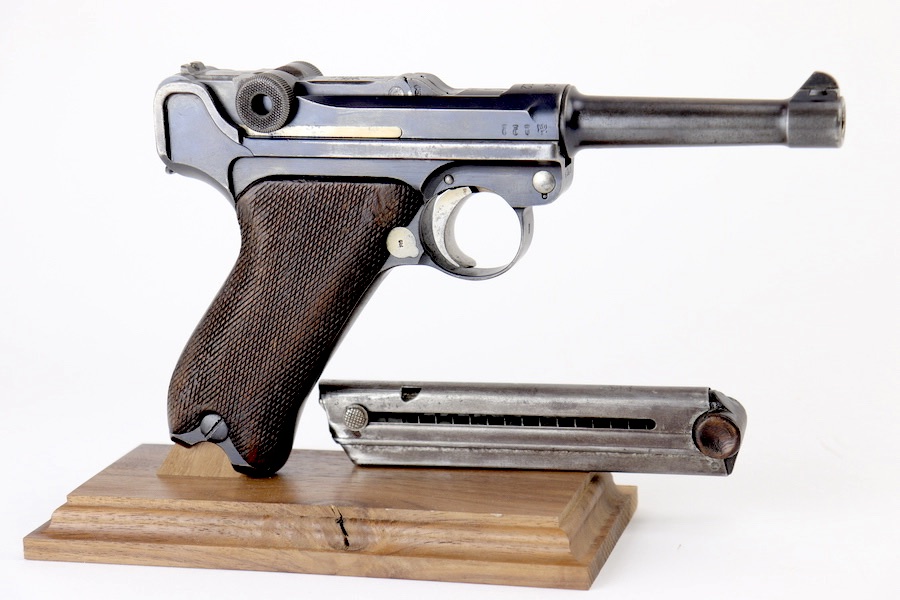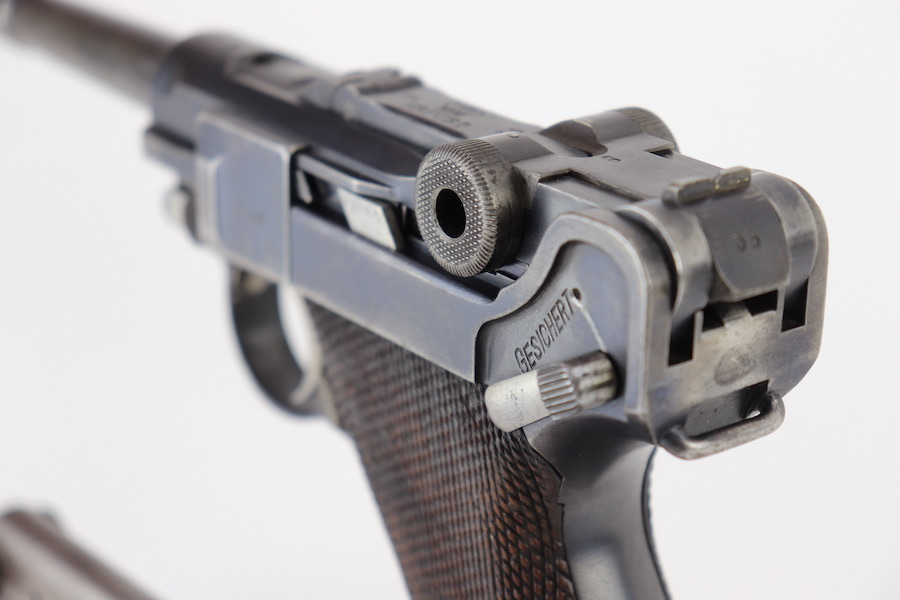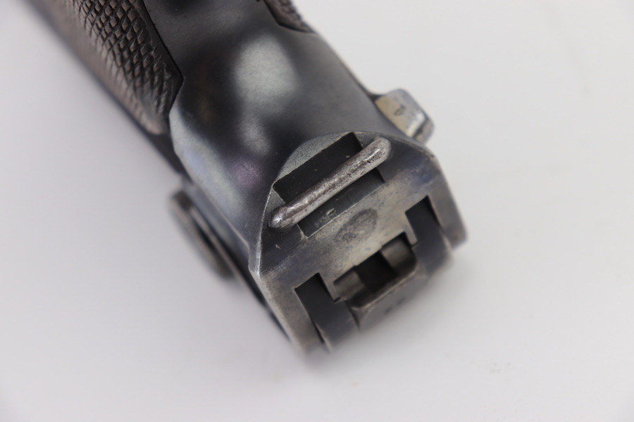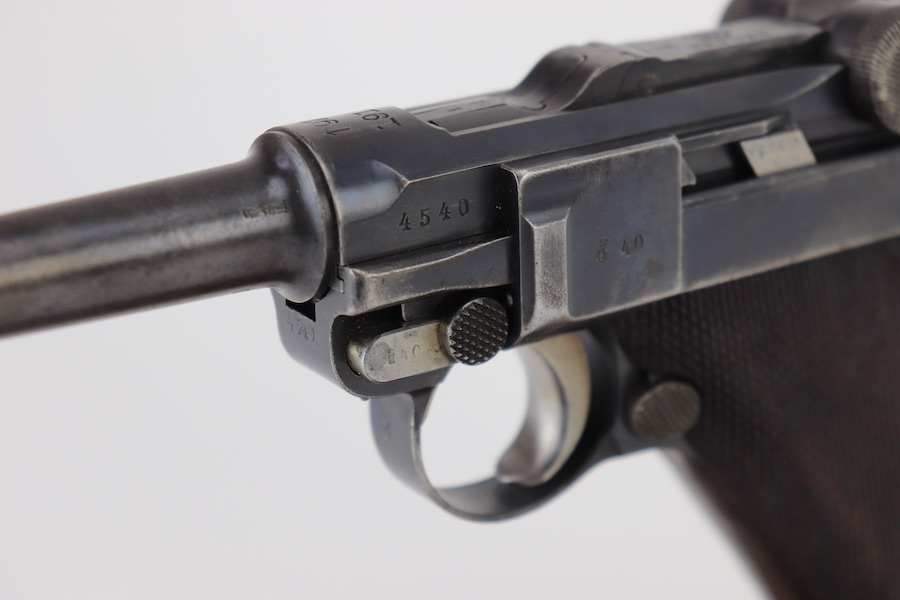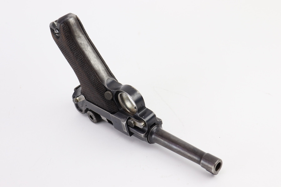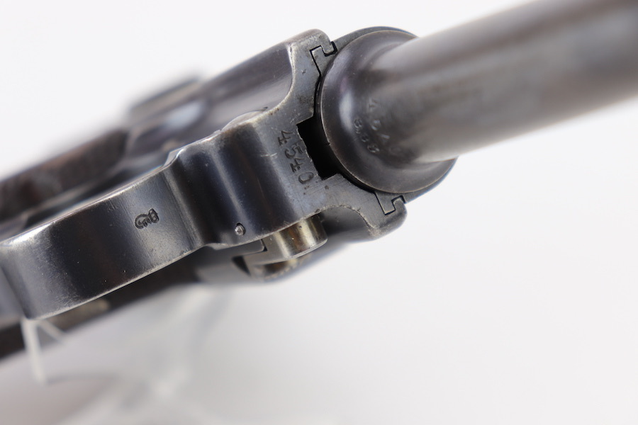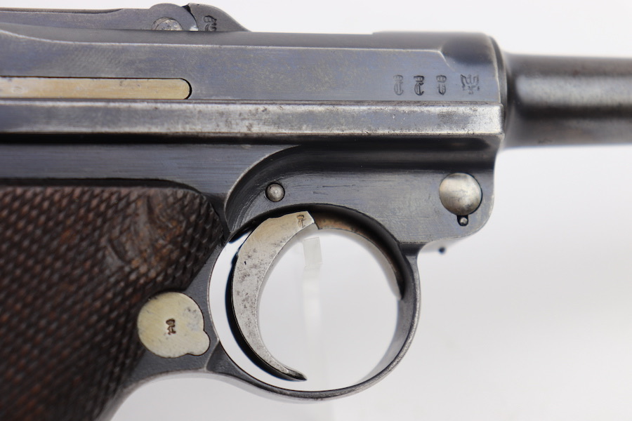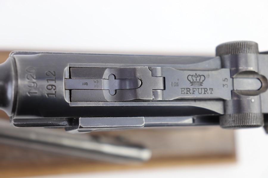 12/15/23 – This is a nice example of an early Erfurt Luger issued to the Imperial German military in 1912. It was re-worked after WWI, and has a 1920 date stamp along with the 1912 stamp. It is matching, except for the toggle. The grips are matching as well. It has the proper Imperial proofs, and has Erfurt proofs throughout. It has the proper early features: no stock lug and originally had no hold-open (one has been added). The gun itself has retained about 85% of its original finish with areas of wear around the muzzle, on the side plate, and on the very front edges of the side rails. Some light spotty wear on the straps. Includes a correct wood base magazine, that has noticeable chip/repair. The bore has good rifling, with very minor frosting, but still rates an 8 of 10.