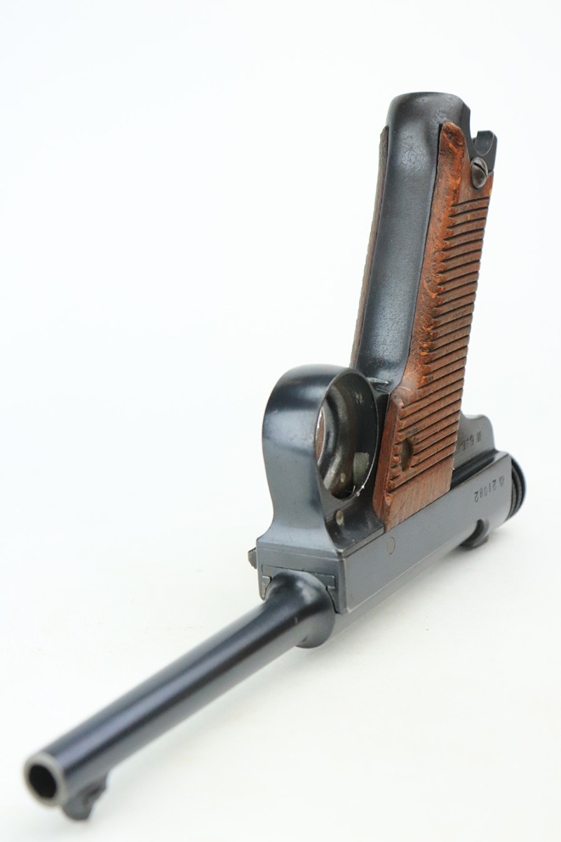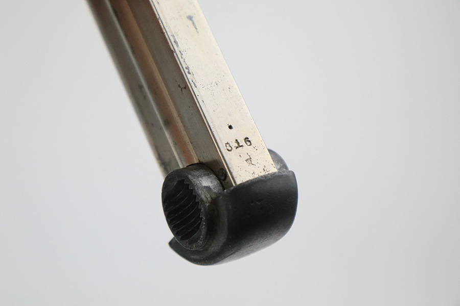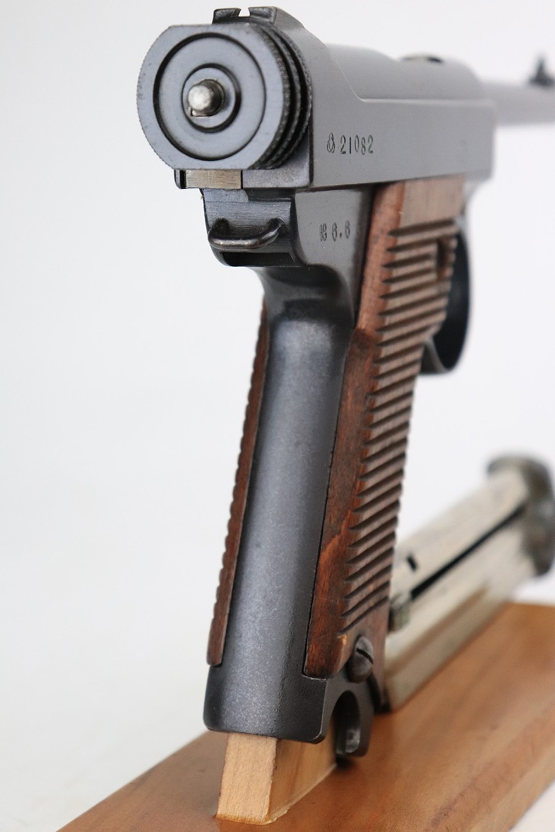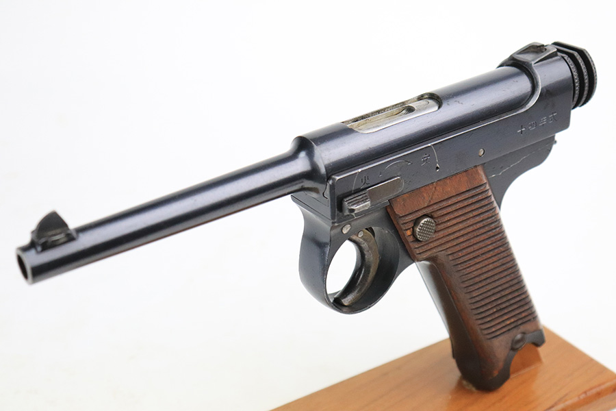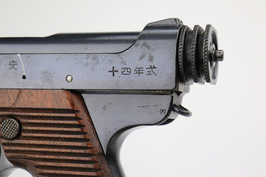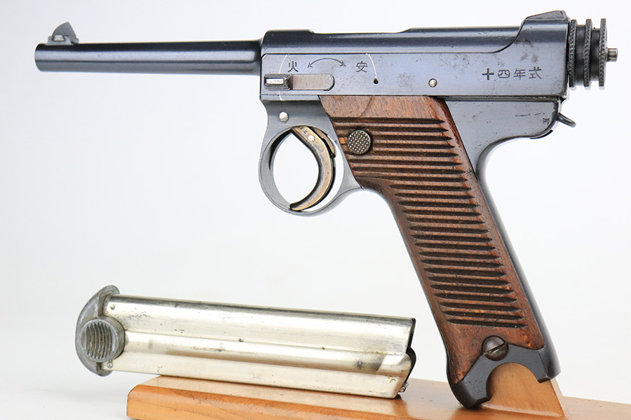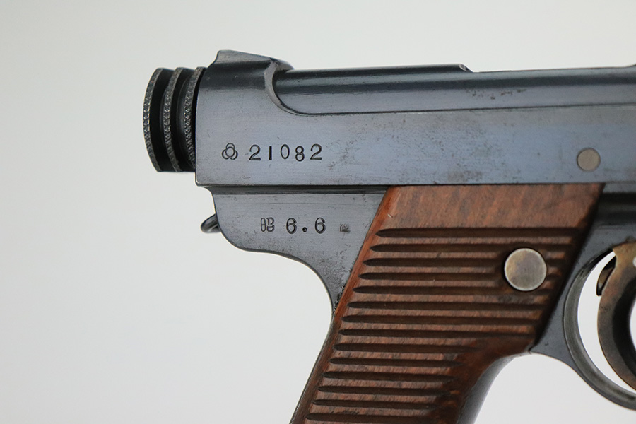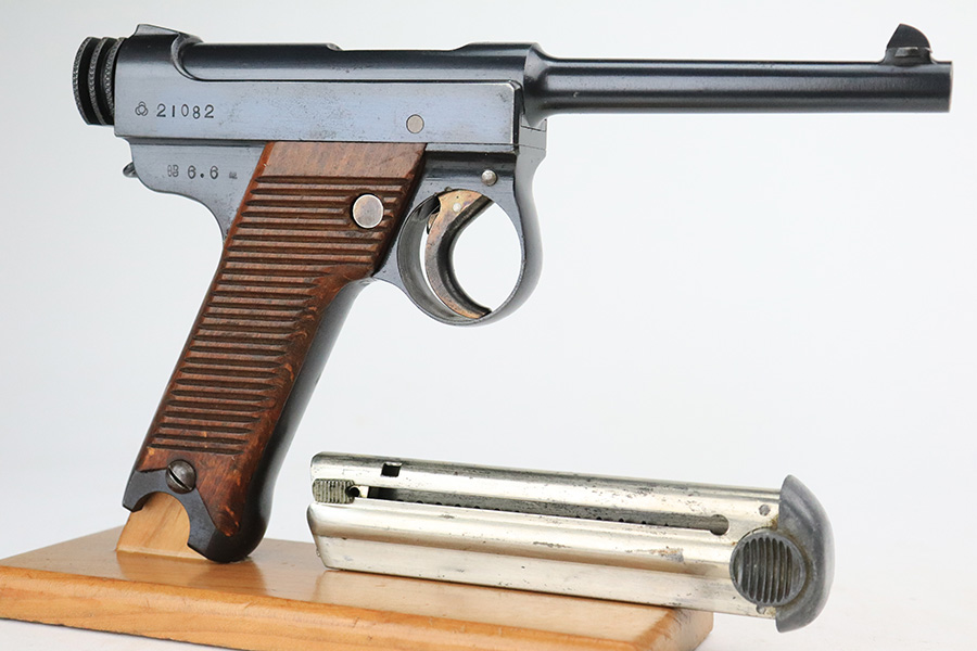 8/15/22 – This is an excellent example of an early Nambu Type 14 issued to the Japanese military in June of 1931. It is all matching and has retained virtually all of its original finish. While there is next-to-no actual finish loss, there is noticeable pin-pricking on both grip straps and some light freckling on the left side of the slide. Comes with excellent wood grips that are hand-numbered on the inside to match the gun. Also comes with a period-correct but mismatched magazine. The bore has good rifling, but there is light freckling throughout.