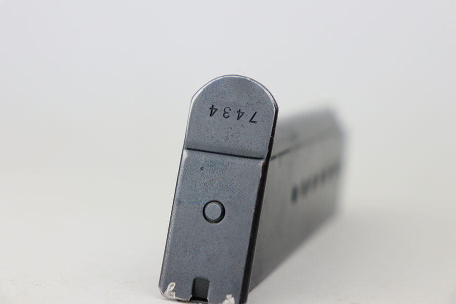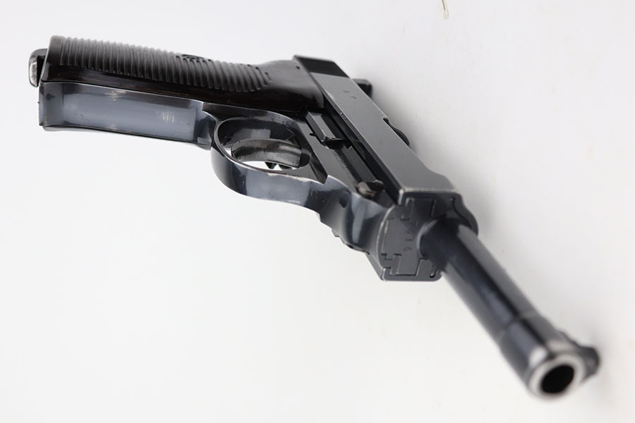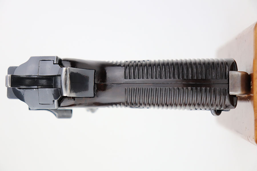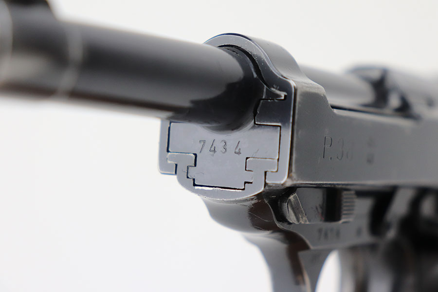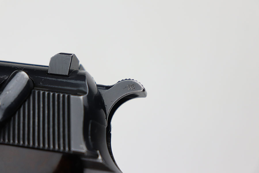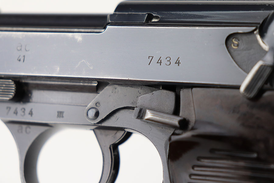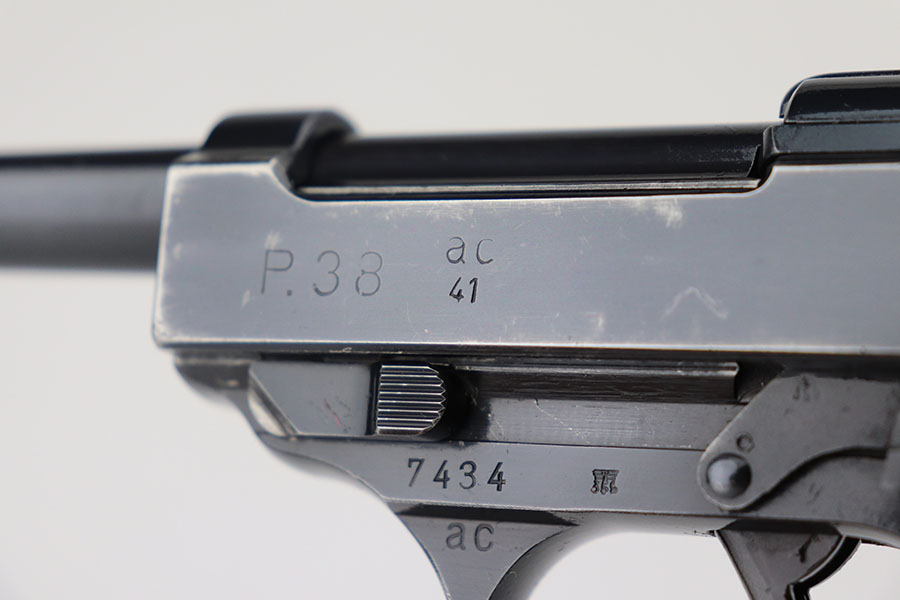 4/21/21 – This is an early first variation Walther P.38 from 1941 with the original matching magazine and grips. It has about 95% of the high-polish blue remaining, several small spots of finish loss but no major areas of wear. Frame is ‘ac’ marked, indicating first variation issue. All small parts are properly E/359 proof. Grips and magazine matching numbered to the pistol. Bore has strong rifling but minor frost in the grooves. Note that the de-cocker does not work but safety does. Hischier collection.