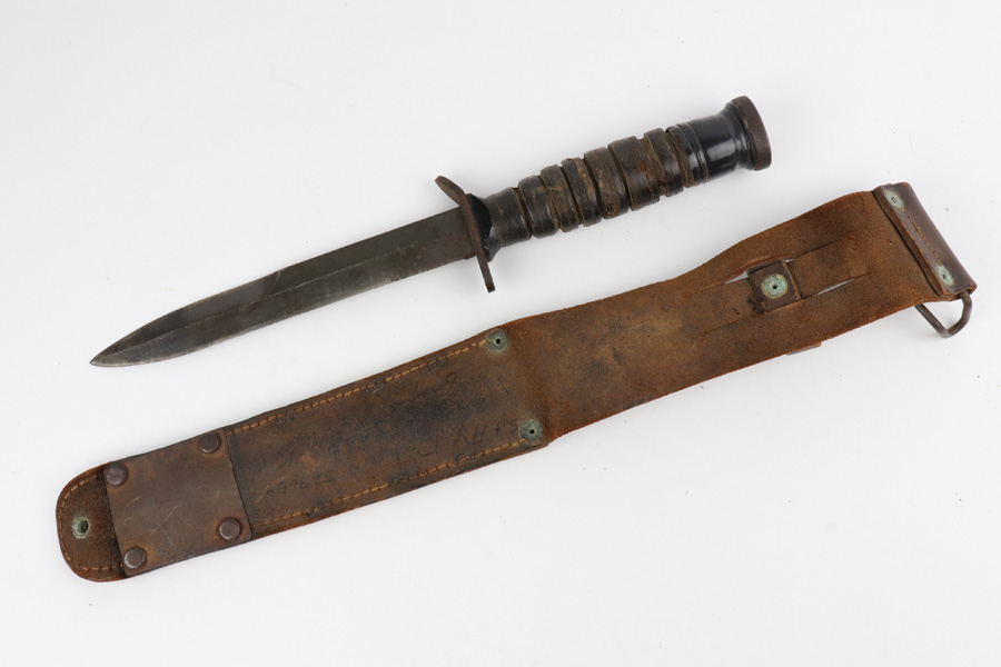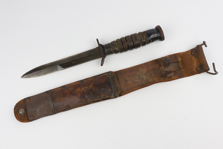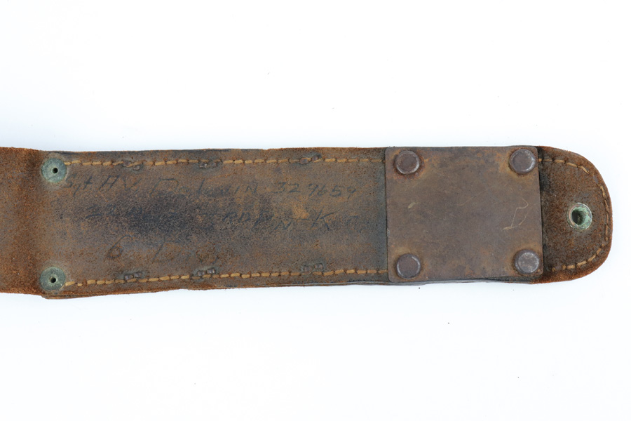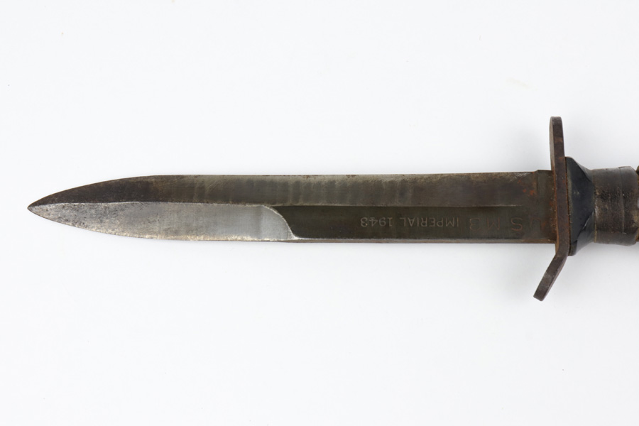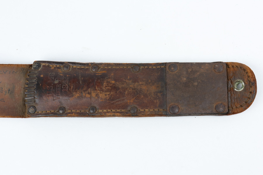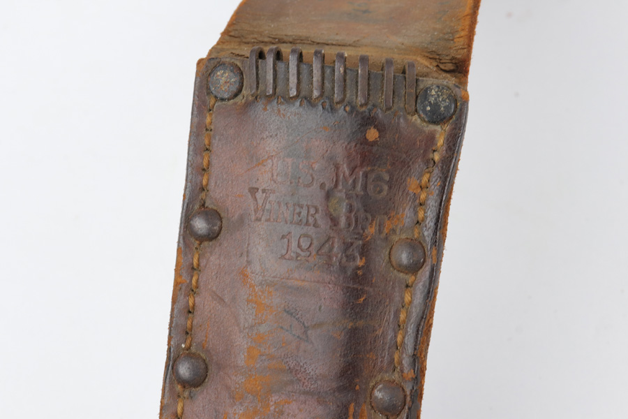 7/9/19 – This is an original, early variation US M3 Imperial fighting knife. The knife is blade dated 1943 which is earliest variation for WW2. The blade has some discoloration and signs of use with pitting near the tip area of the blade. There’s rust on the base / underside of the handguard. The handle has black spacers (another early desirable feature). There’s light wear throughout the handle. The pommel is flaming bomb stamped and has some light rust. The leather scabbard is worn but completely in tact with a GI’s name on the frog. The front is maker stamped by Viner Bros and 1943 dated.