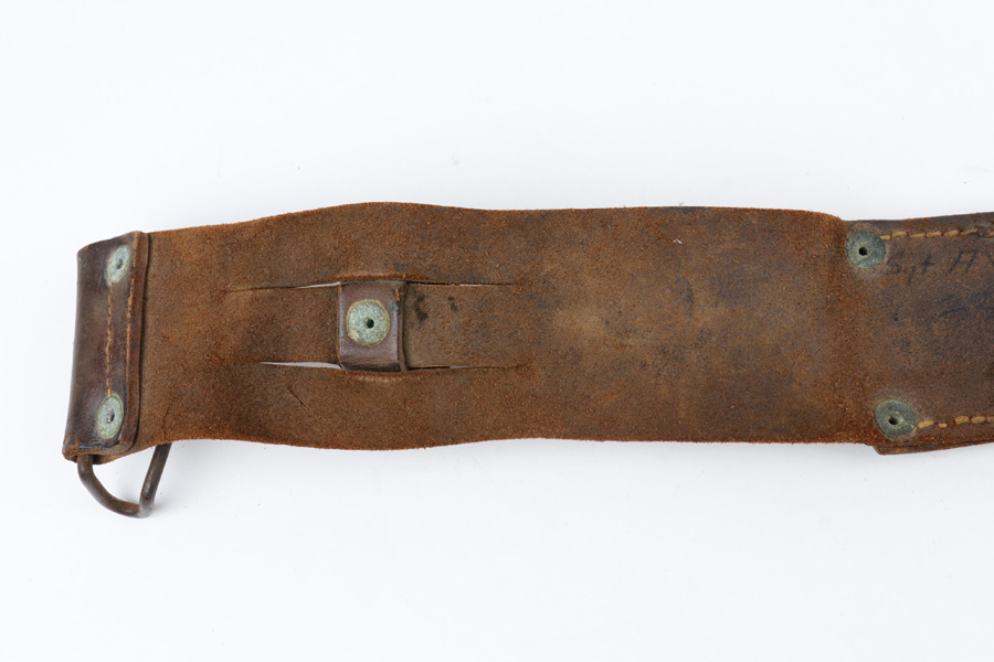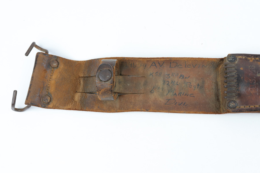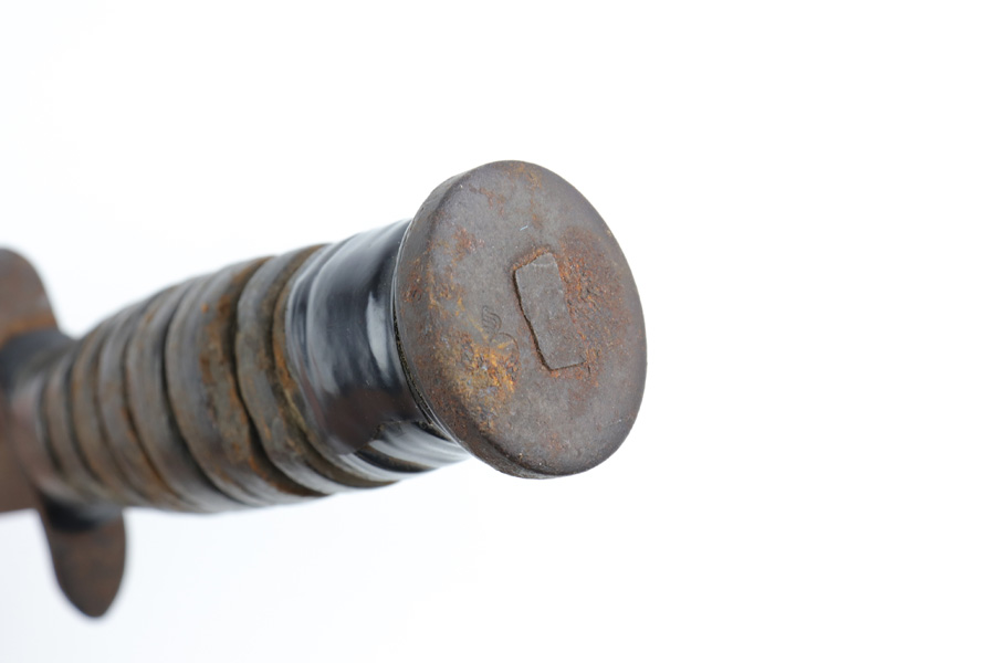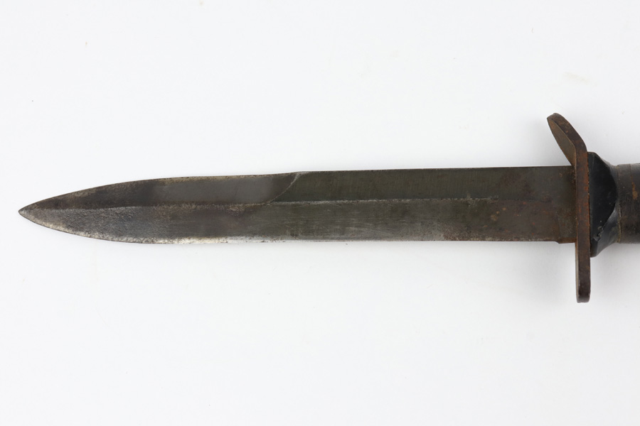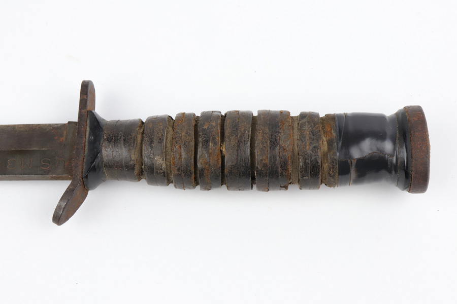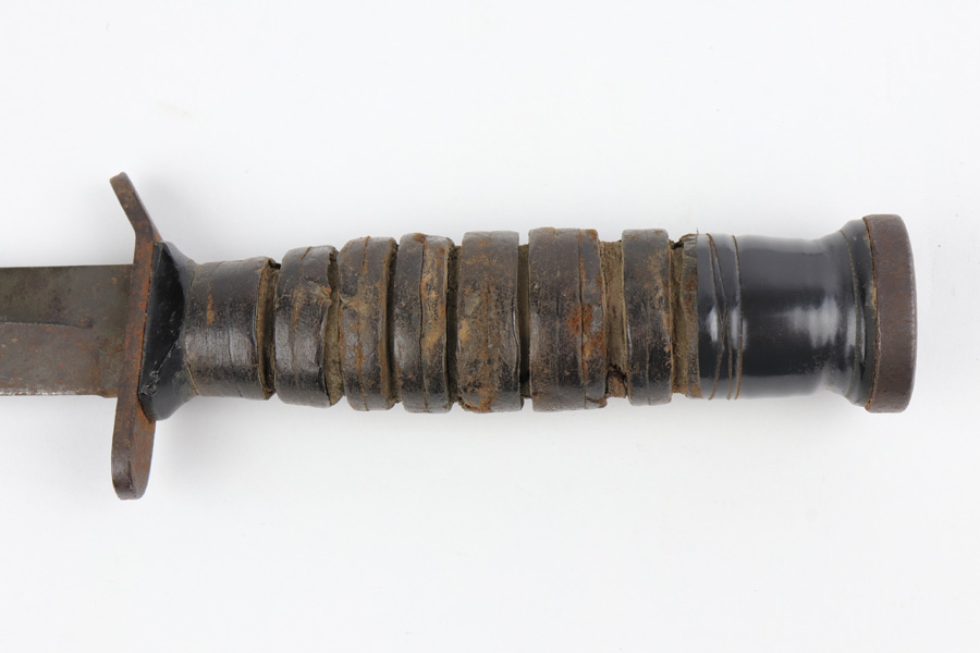 7/9/19 – This is an original, early variation US M3 Imperial fighting knife. The knife is blade dated 1943 which is earliest variation for WW2. The blade has some discoloration and signs of use with pitting near the tip area of the blade. There’s rust on the base / underside of the handguard. The handle has black spacers (another early desirable feature). There’s light wear throughout the handle. The pommel is flaming bomb stamped and has some light rust. The leather scabbard is worn but completely in tact with a GI’s name on the frog. The front is maker stamped by Viner Bros and 1943 dated.