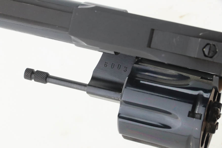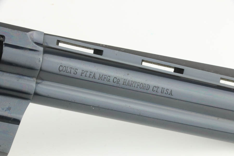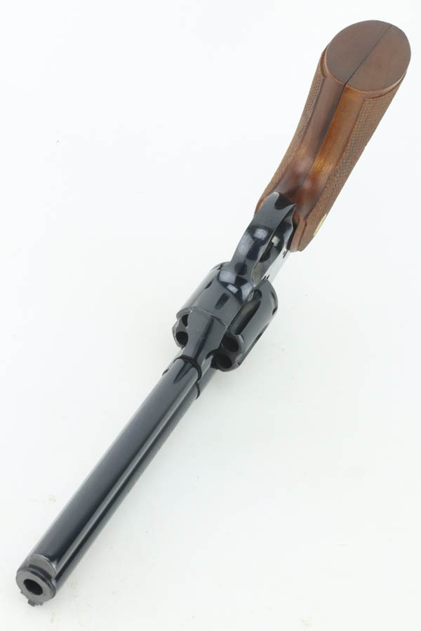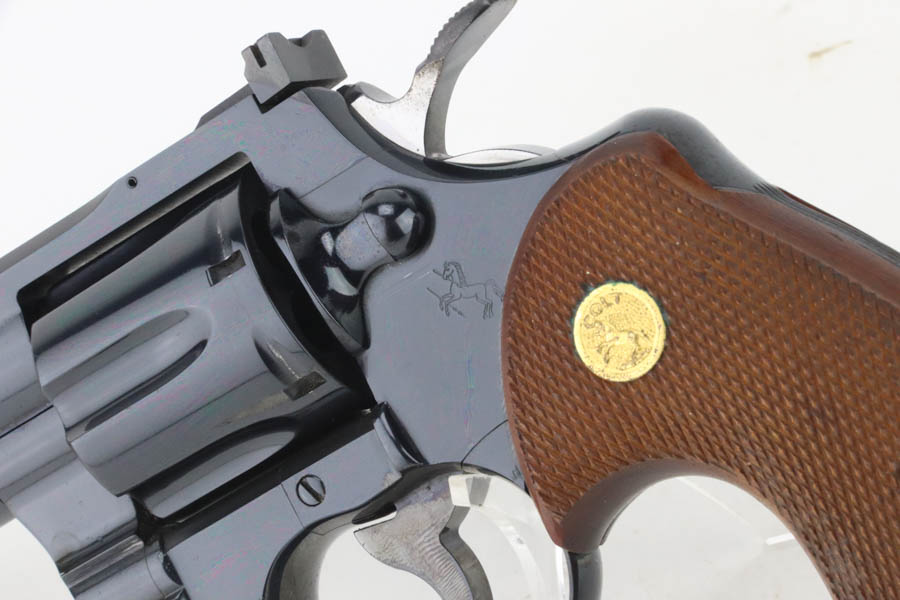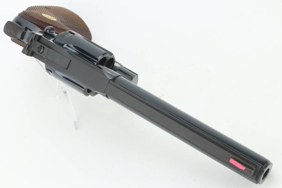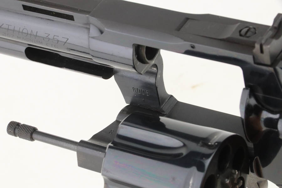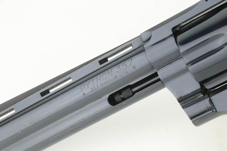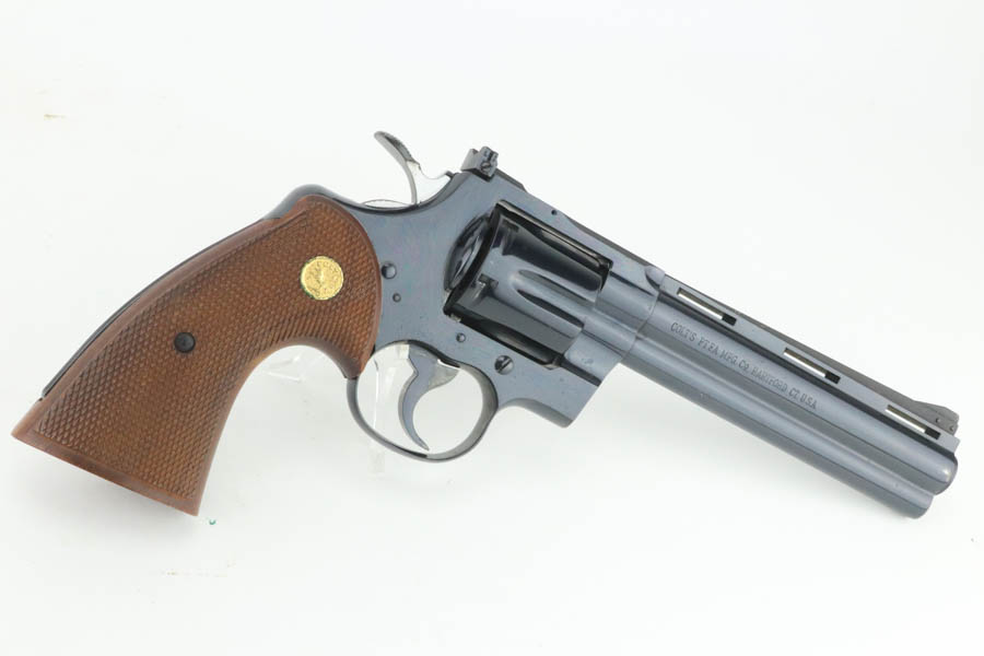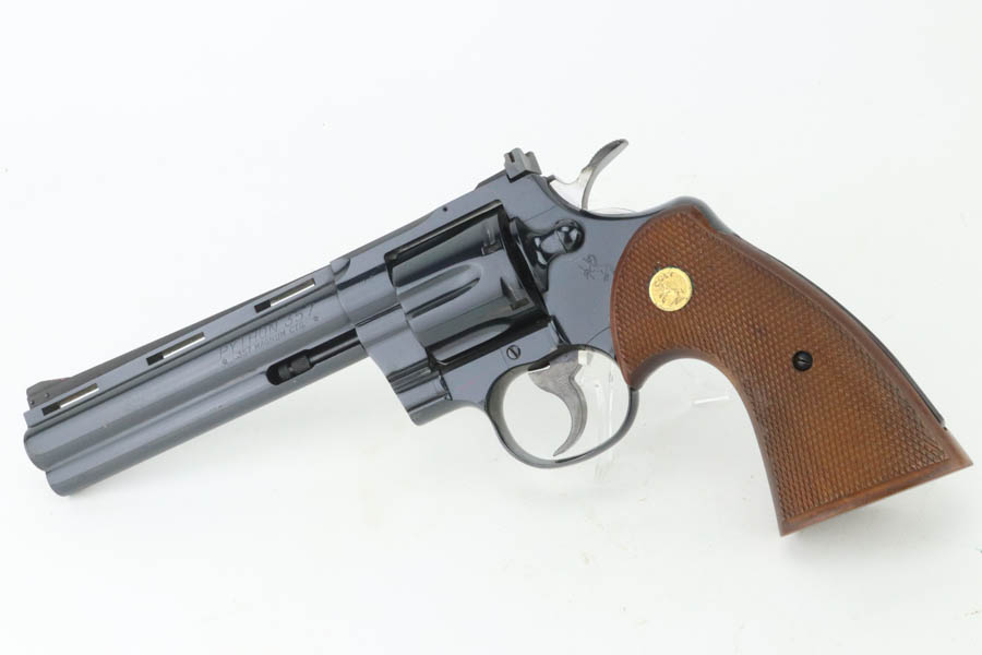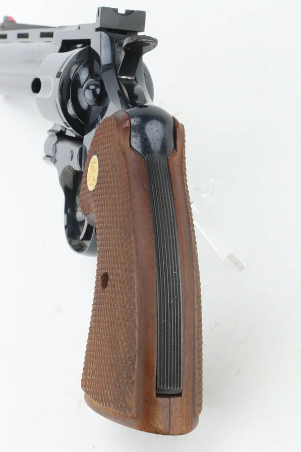 8/15/24 – This is a near-mint example of an early Colt Python Revolver from 1959. Chambered in .357 Magnum with a 6 inch barrel. It is matching and has retained essentially all of its original high polish finish. However, there are some areas of light freckling on the underside of the trigger guard, on the right side of the frame, and on the back strap. Fitted with excellent checkered wood grips. Mint bore. Smooth action.