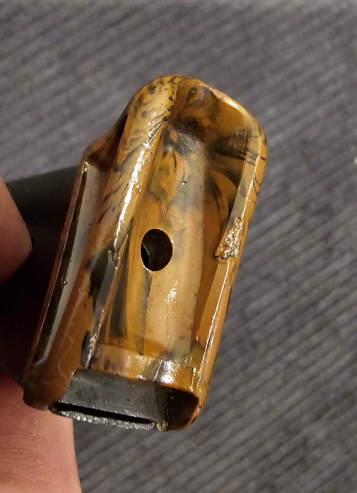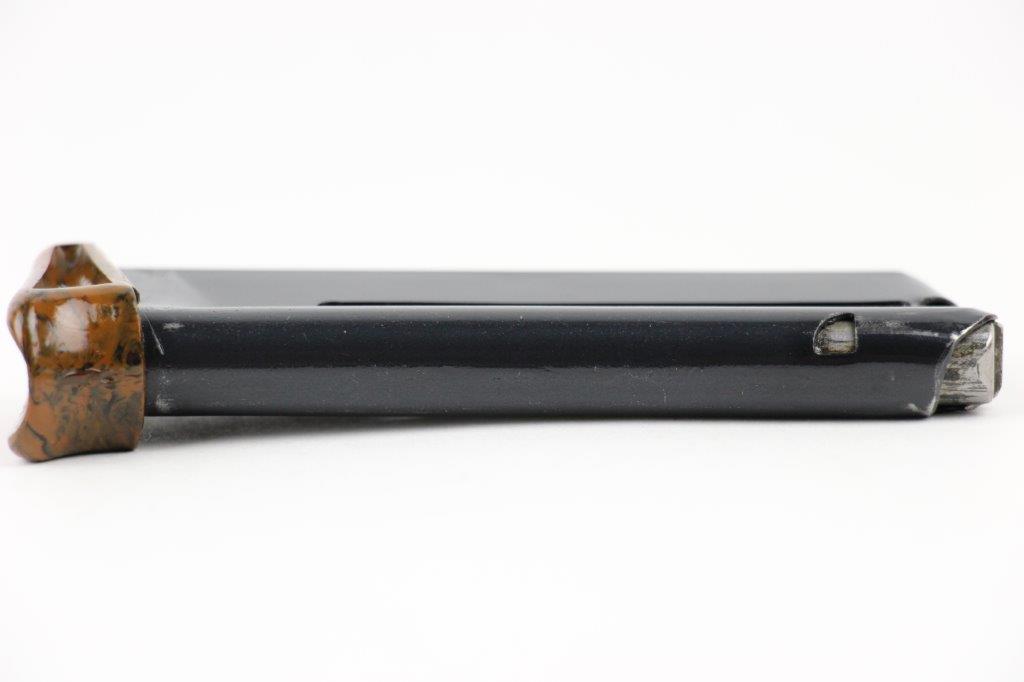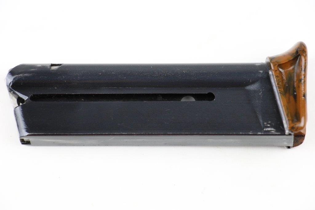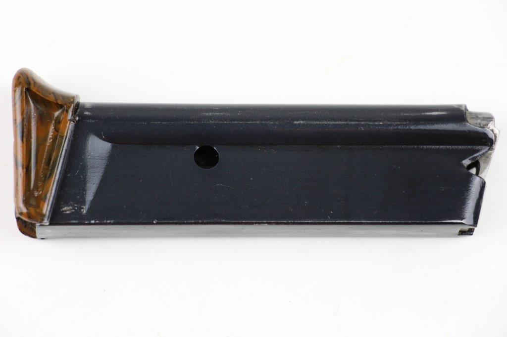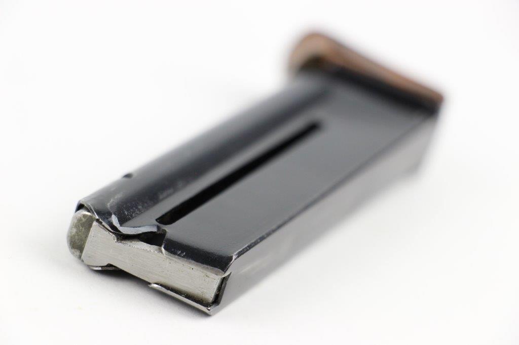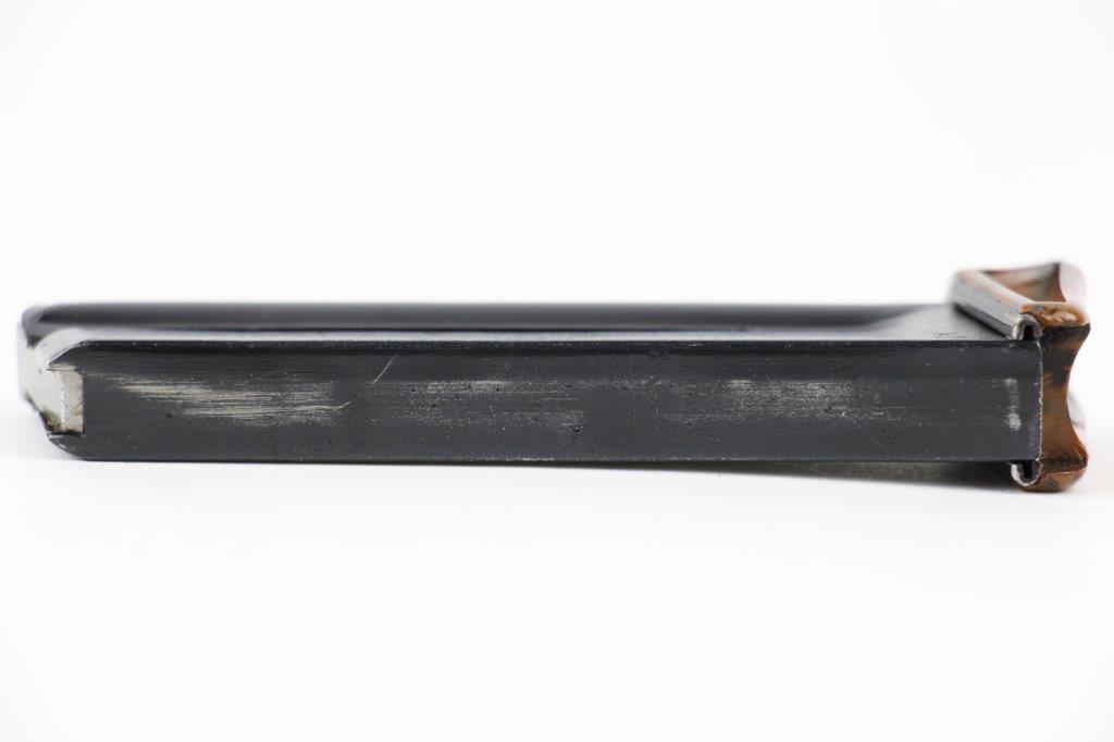 6/15/24 – This is a rare, early WW2 variation Walther PPK Finger Extension magazine in .22 LR. The magazine correctly has no follower button, and an original blued finish that’s excellent throughout. No markings or stamps on the tube. The bakelite finger extension is correct, early thin-lipped style with no cracks or chips. There’s one small imperfection / scuff on the underside of the finger extension base, but this is minor and doesn’t affect functionality.