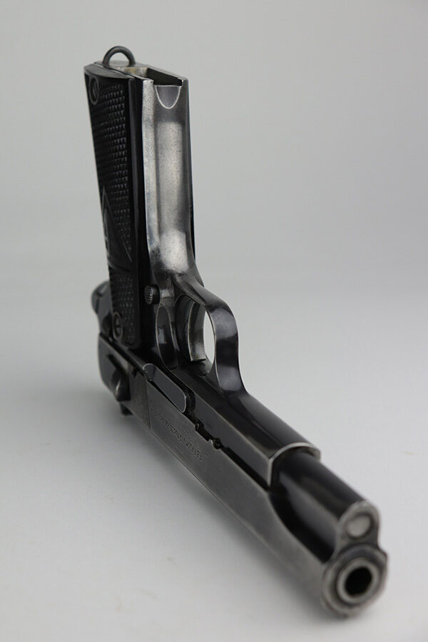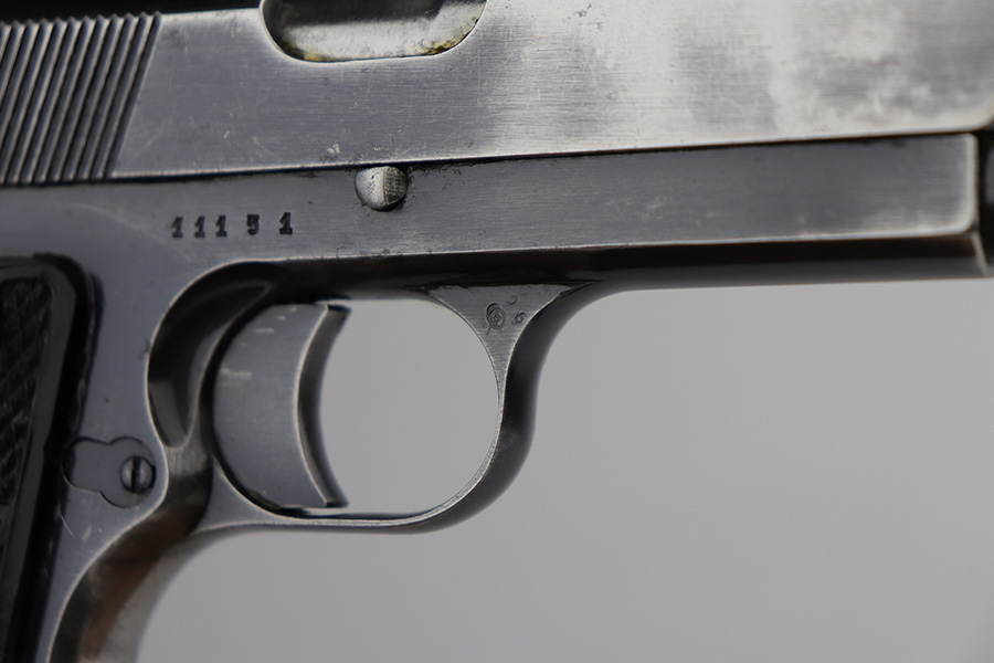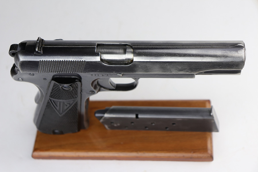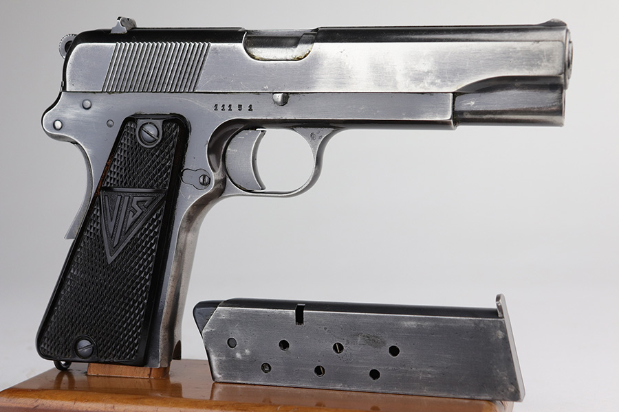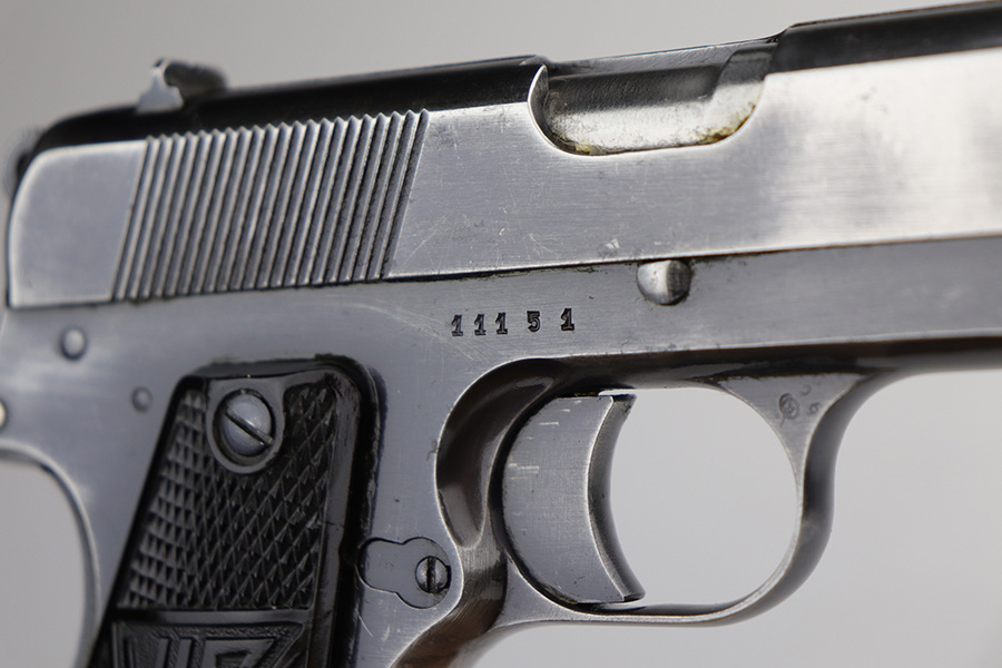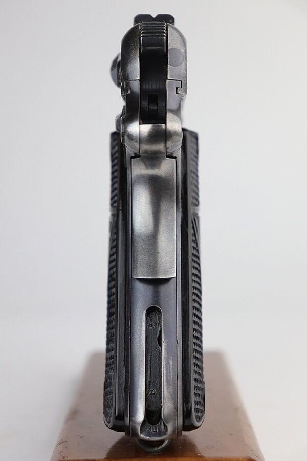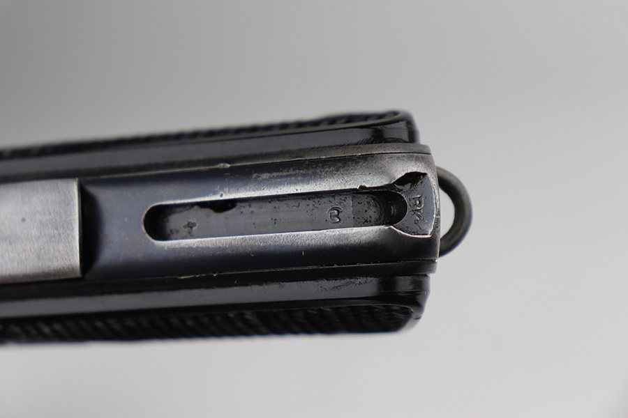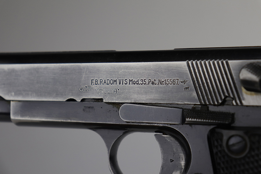 9/15/21 – This is a nice example of an early Radom VIS 35 issued to the Nazi military during WW2. It is all matching and has the proper waffen military proofs. It has early characteristics, such as 3 levers, a slotted frame, a high polish finish, and no serial prefix. It has retained roughly half of its original finish. There is thinning and wear throughout, almost no remaining finish on the front strap, and an area of spotty wear on the right side of the slide. Some areas of very minor pin-pricking around the muzzle. Comes with excellent period-correct grips (one small chip on the bottom of the right side) and a period-correct magazine (not waffen-proofed). The bore has good rifling with very minor pin-pricking throughout.