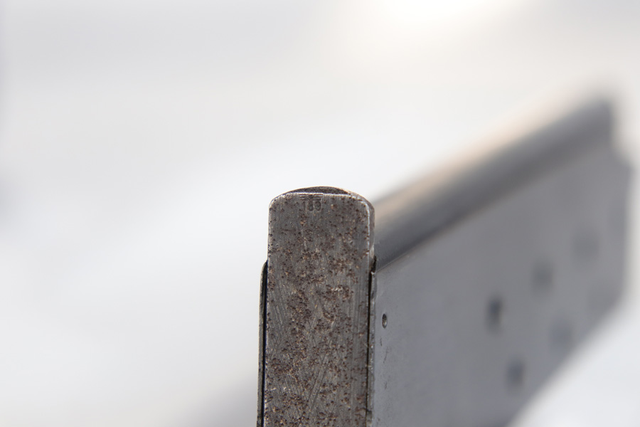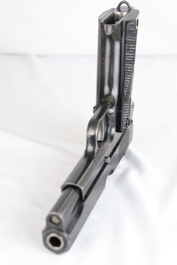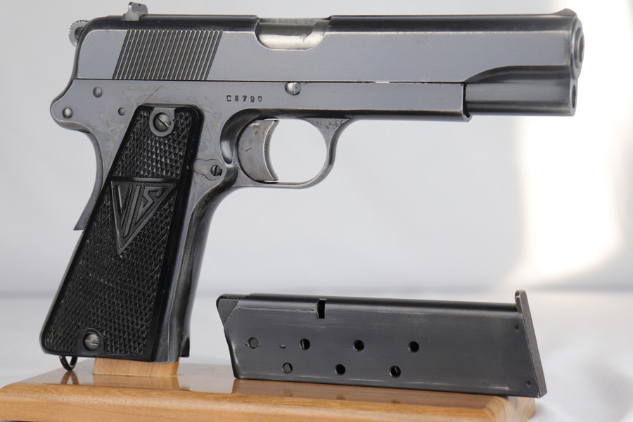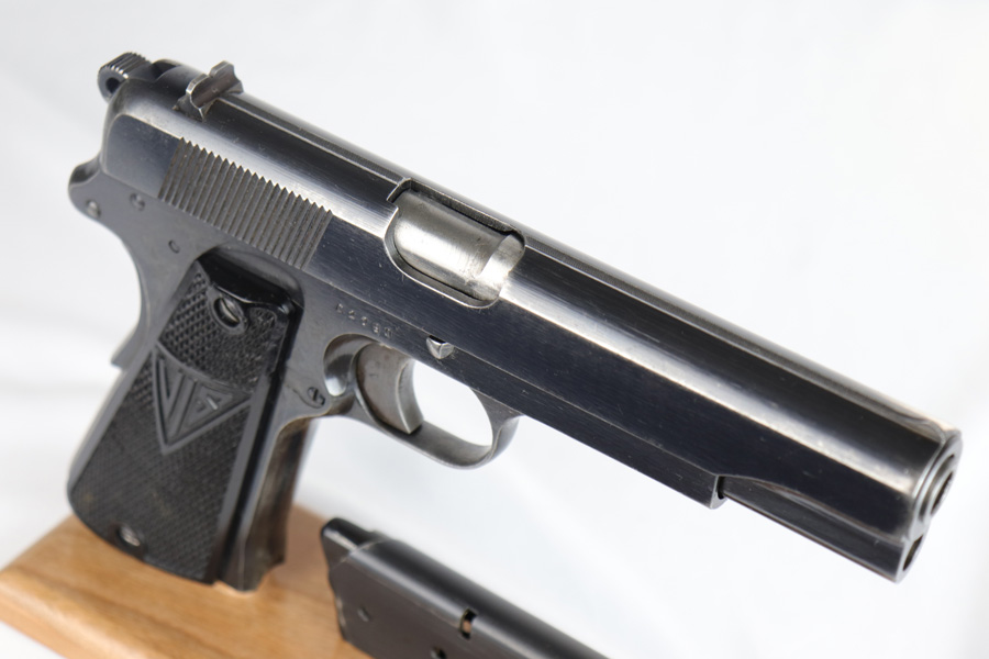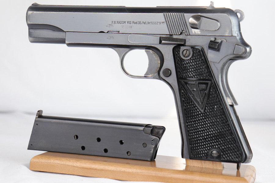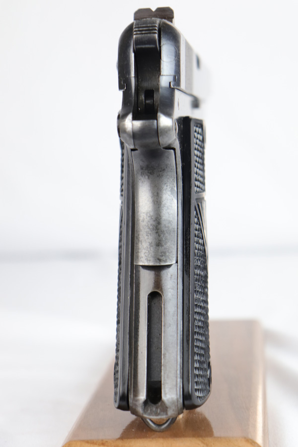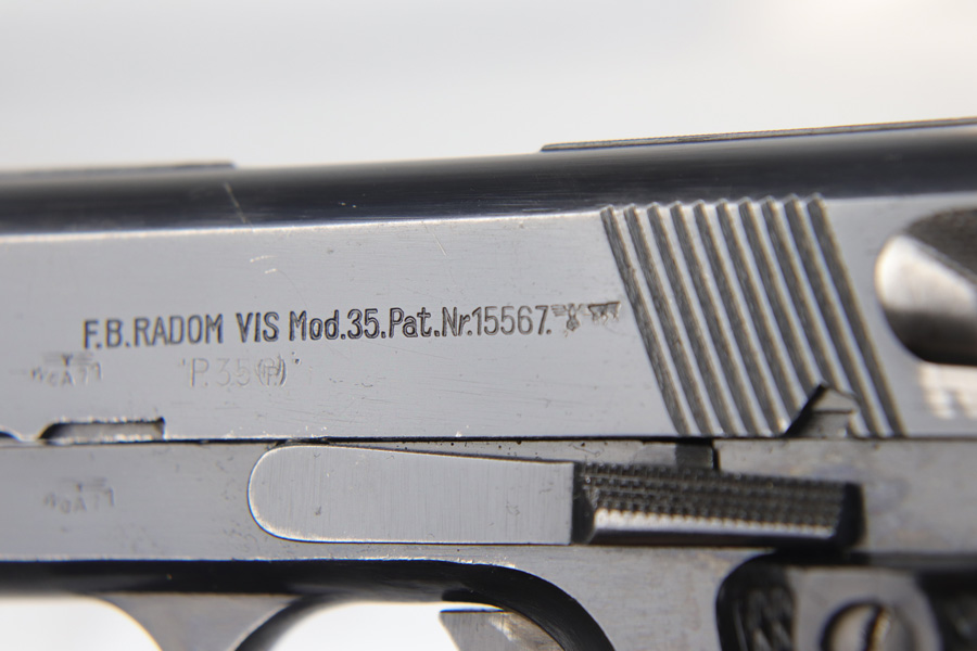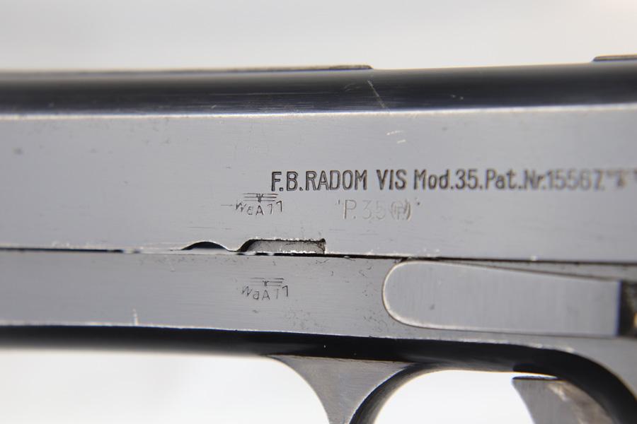 2/6/19 – This is an original early nazi production Radom P.35 pistol. The pistol is in good condition, we rate at about 90% original finish in tact. Most of the wear is on the front and back straps. The back strap in particular is missing most of the finish. The right side of the frame has some odd-looking discoloration around the grip – looks like some sort of oil or chemical stain perhaps, but isn’t a glaring flaw or even that noticeable. There is also some standard muzzle wear on the slide. The bore is excellent with strong rifling. The magazine has wear on the base, but is properly waffen eagle 189 proof stamped. Guaranteed original and authentic.