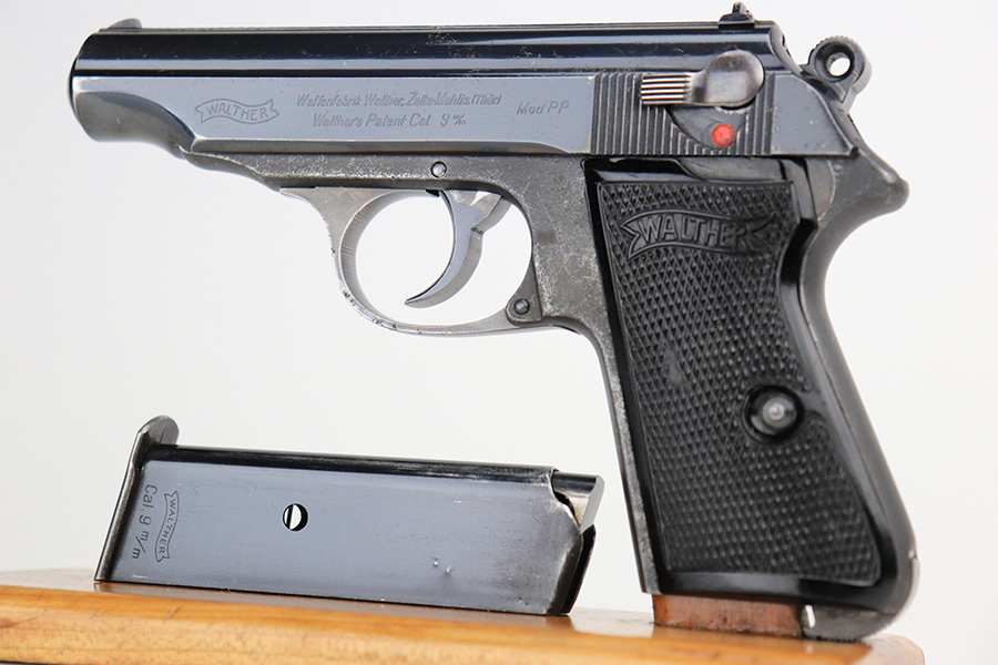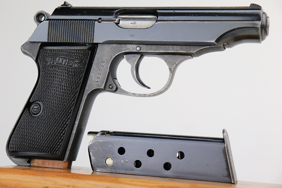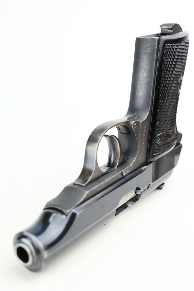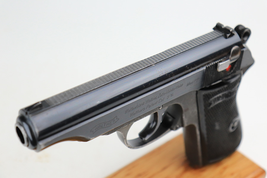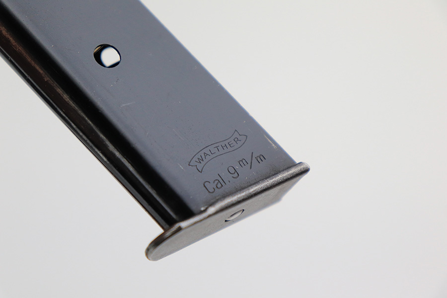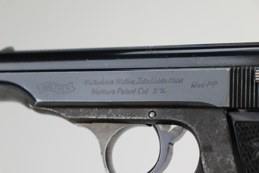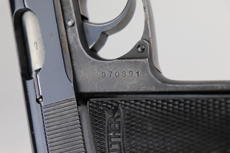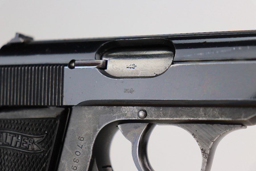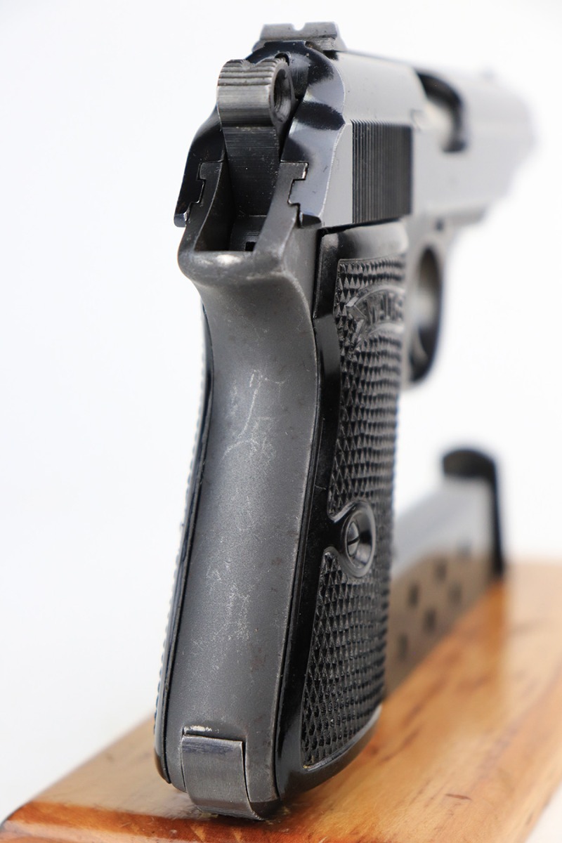 11/20/23 – This one is hard to explain but here goes: The frame and the slide are 2 different finishes yet the number inside the slide matches the frame. The slide is a high polish blue as it should be in an early (Crown N) PP. The finish definitely looks to be original. The frame is a dull, late war finish in style but was refinished. Comes with wartime grips and 9m/m marked magazine. So while the gun was originally made in 1937, the frame and the parts seem to have been given a “make over” after 1943. 9MM is a rare caliber for a wartime Walther. The gun functions and will shoot well however the hold open does not keep the slide back after the last round is fired. The bore is shiny with strong rifling, but there is a slight bulge in the barrel.