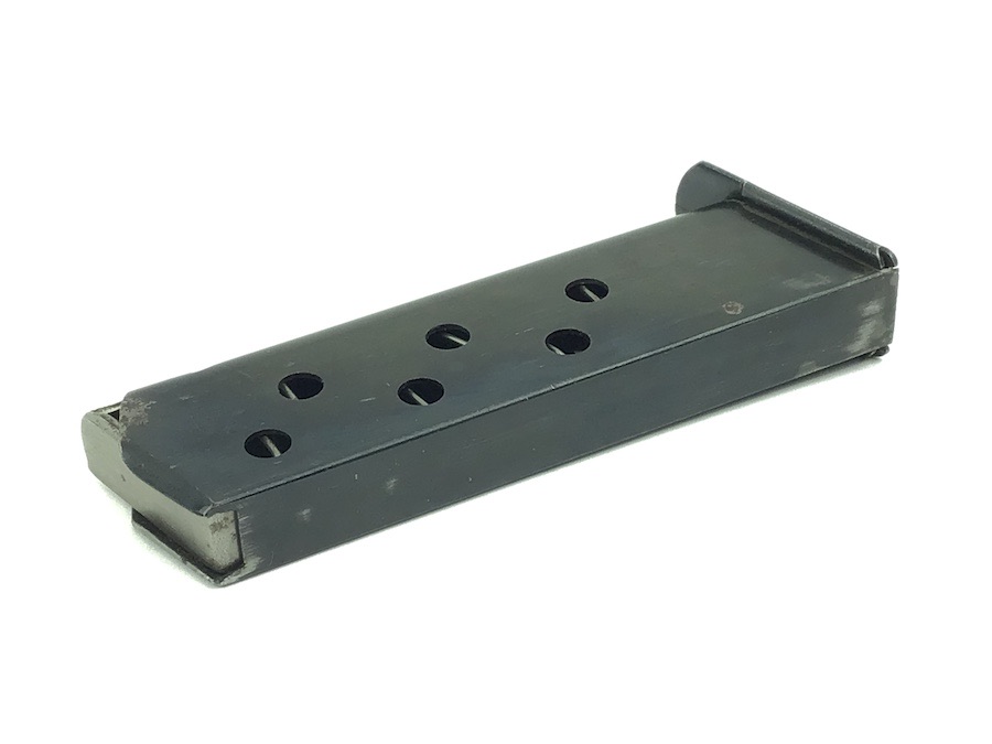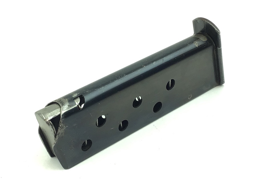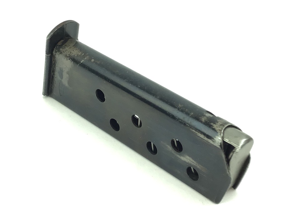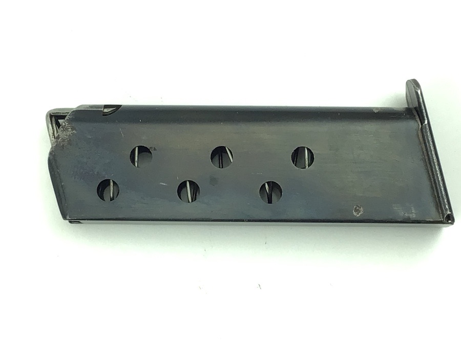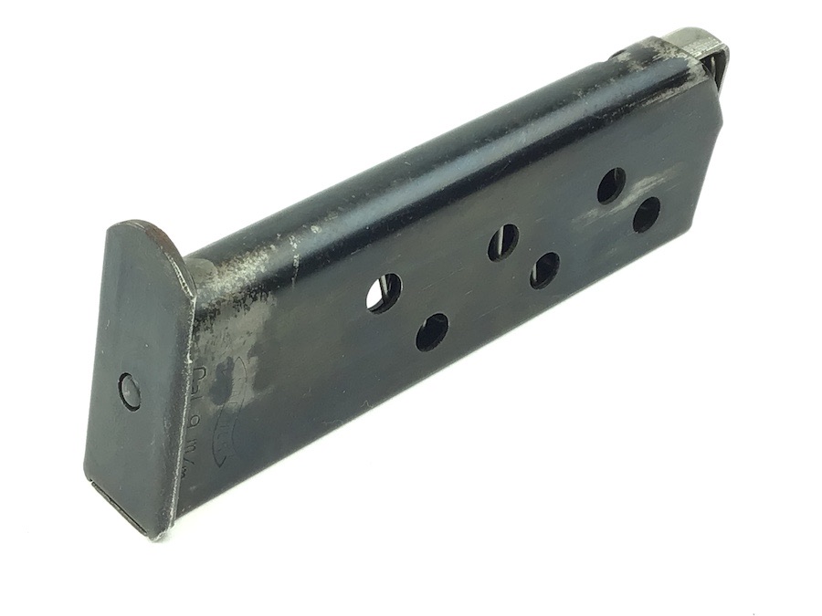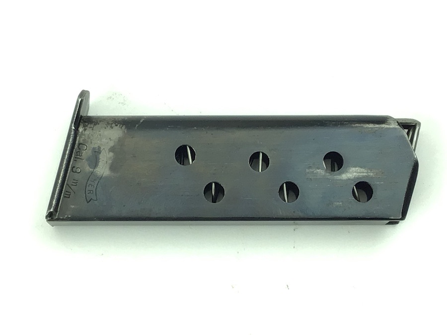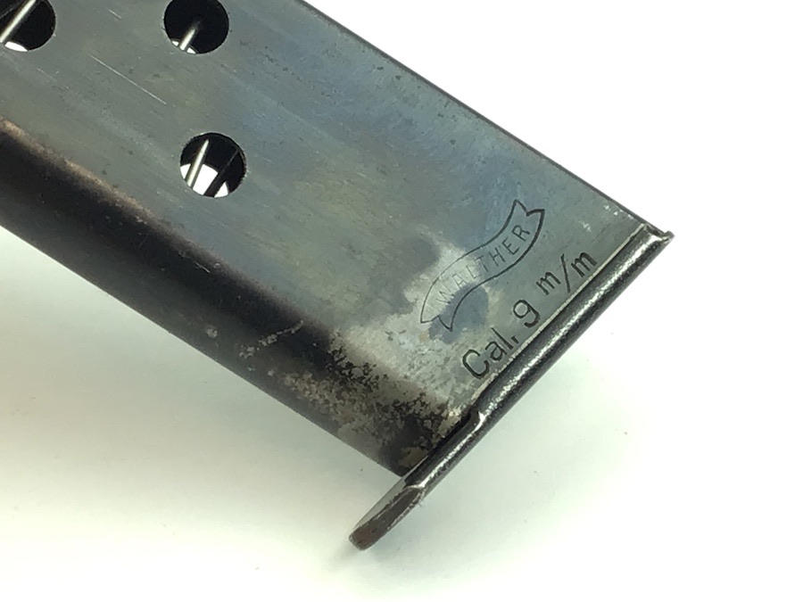 9/15/22 – This is an original WW2 era PPK magazine. The magazine is a rare 9mm early variation with holes on both sides. The left side of the frame is marked with a Walther banner and “Cal. 9m/m”. No rust or pitting – great condition. Minor bluing loss. Strong spring.